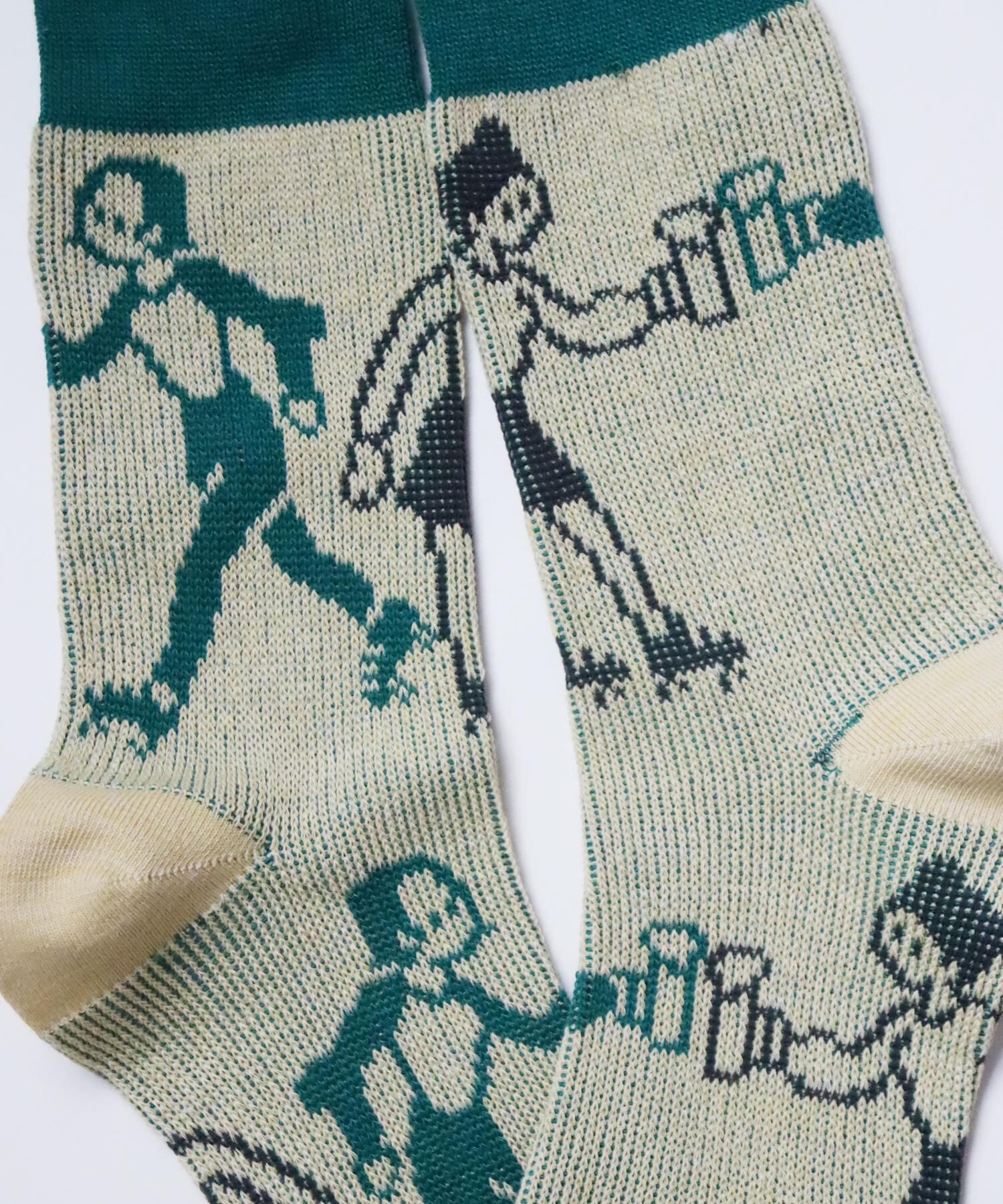 オールド感たっぷりの雰囲気あるクルーソックスです。ダブルジャガードでセーターの様な柄の出方と裏に柄糸が飛び出さずフラットに作られています。