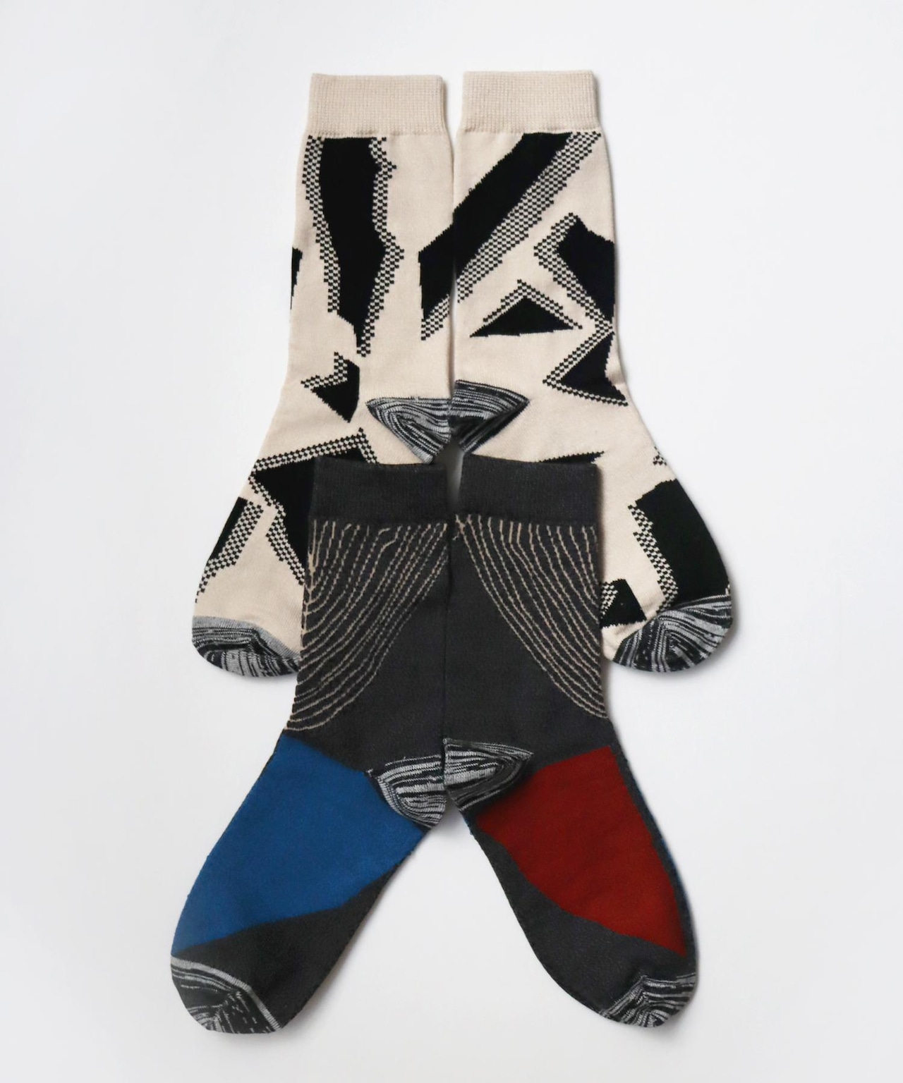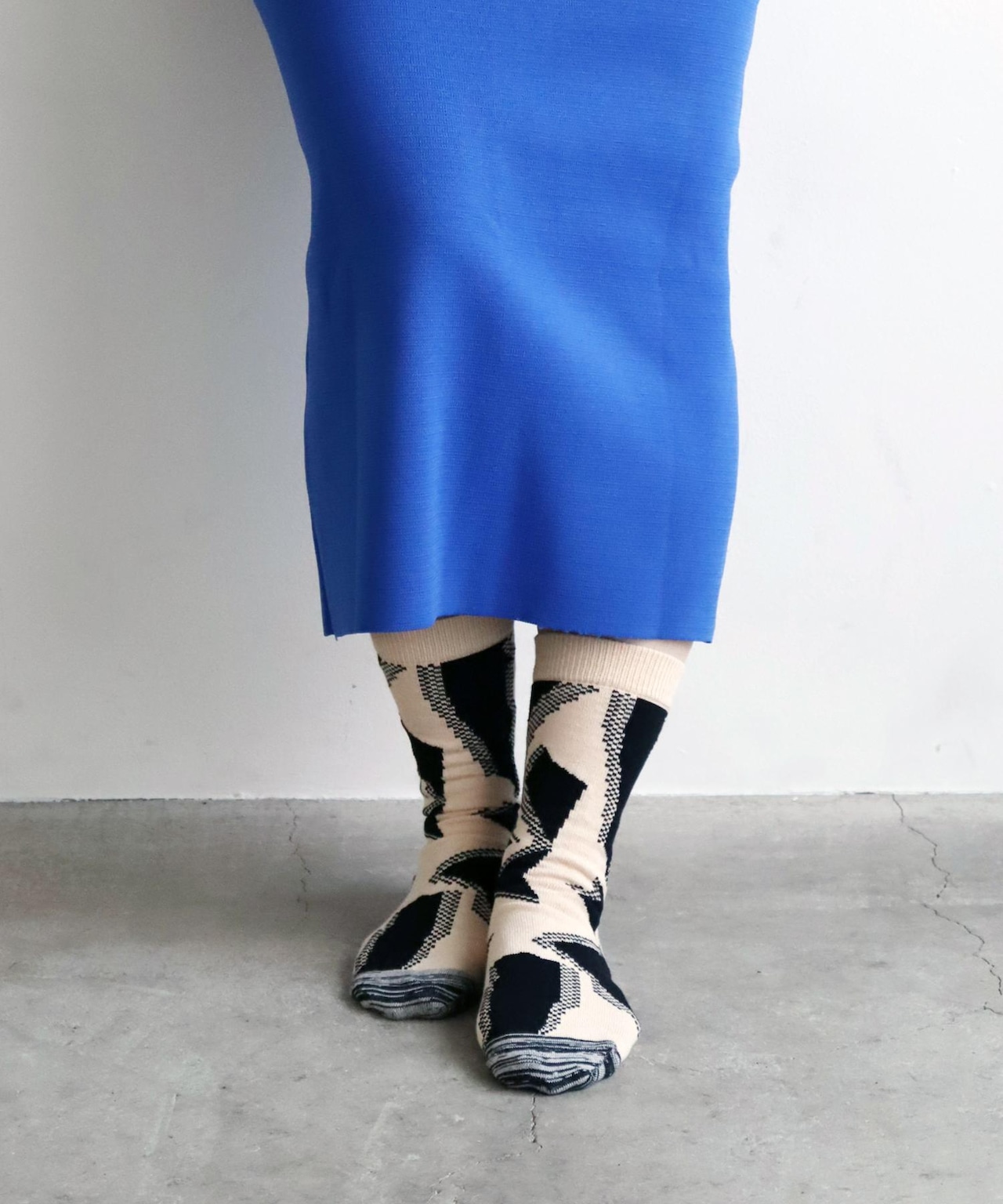 落ち着いた色味をベースとしたクラフト感たっぷりのクルーソックス。ちょっぴり個性的なデザインでコーディネートのポイントにもなりそう〇