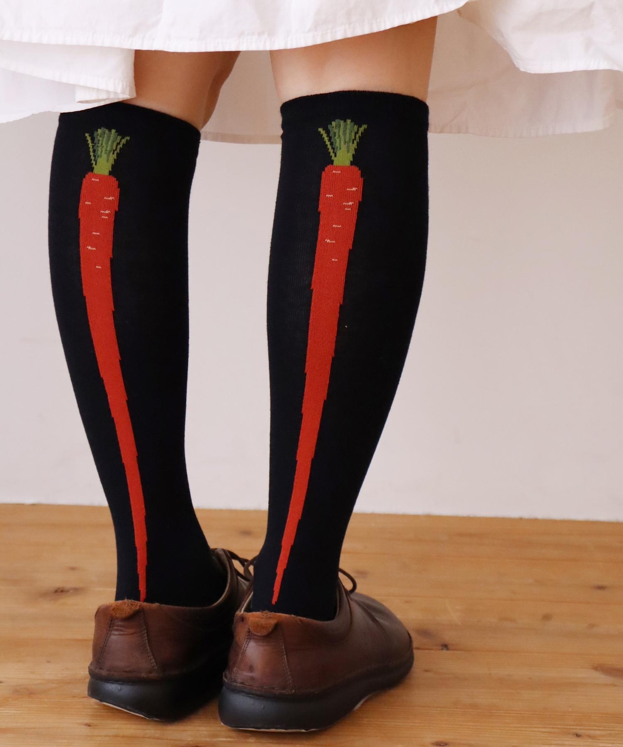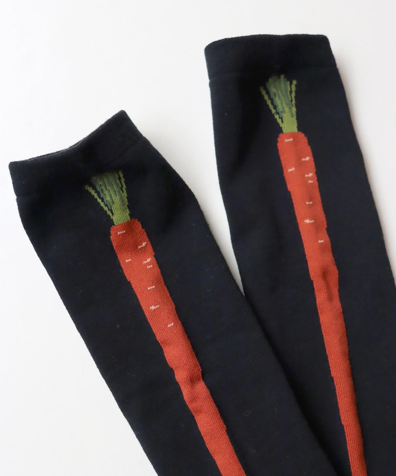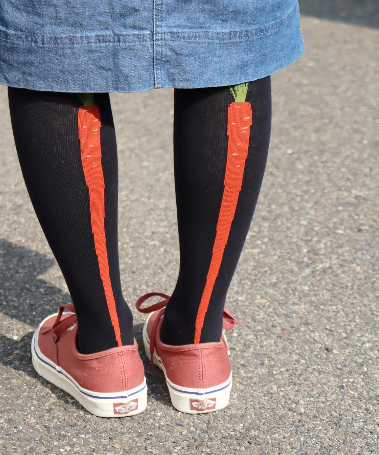 ライン入りの靴下にも見えますがお野菜がデザインされたハイソックスです。スカートから覗かせて履きたいです◎ネギはサイドライン、ニンジンはバックラインになっています。