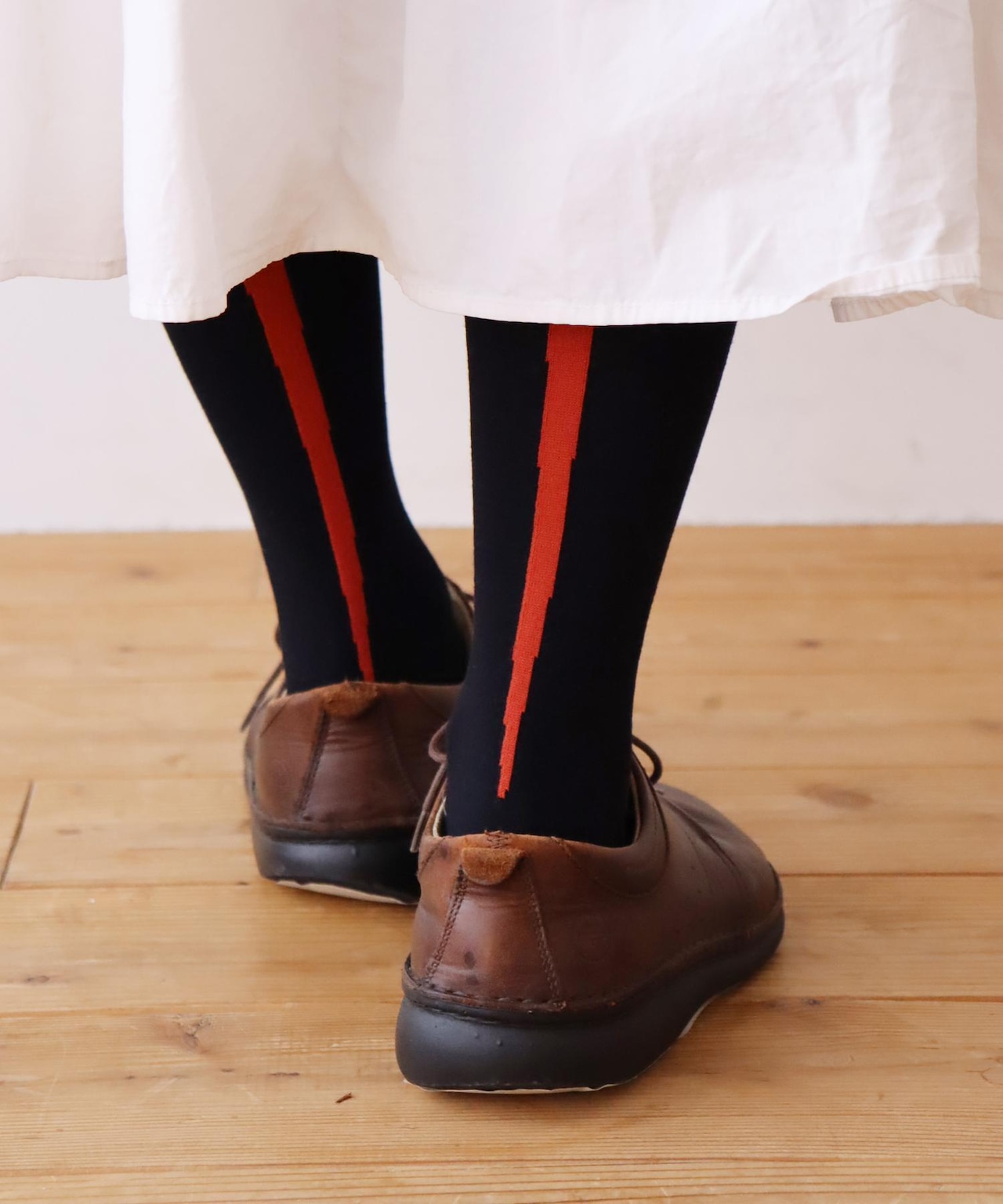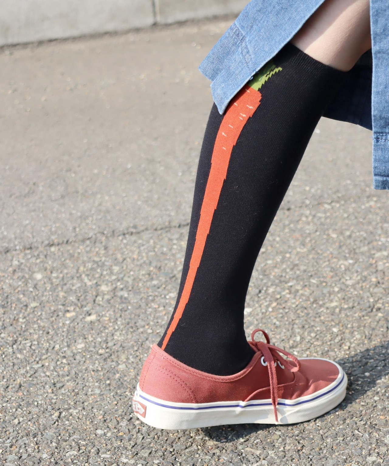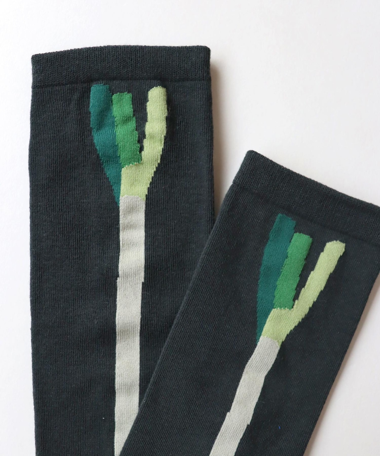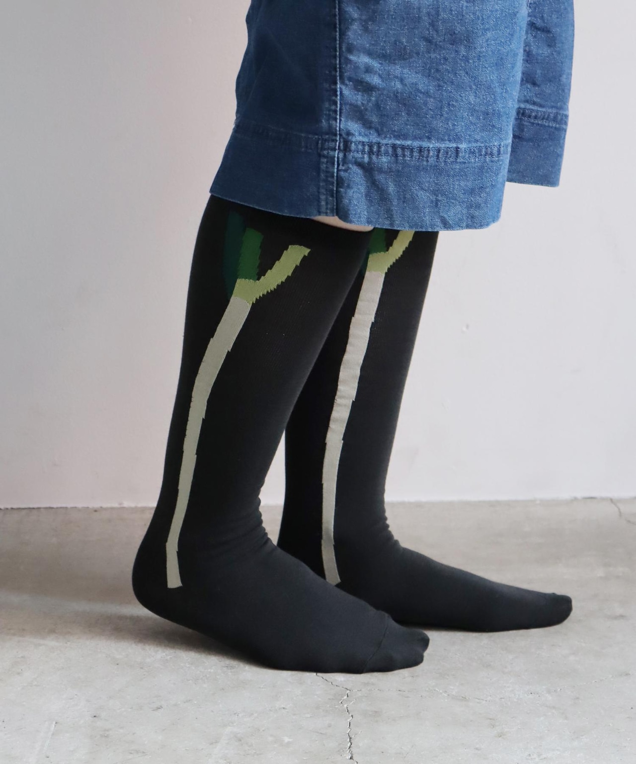 ライン入りの靴下にも見えますがお野菜がデザインされたハイソックスです。スカートから覗かせて履きたいです◎ネギはサイドライン、ニンジンはバックラインになっています。