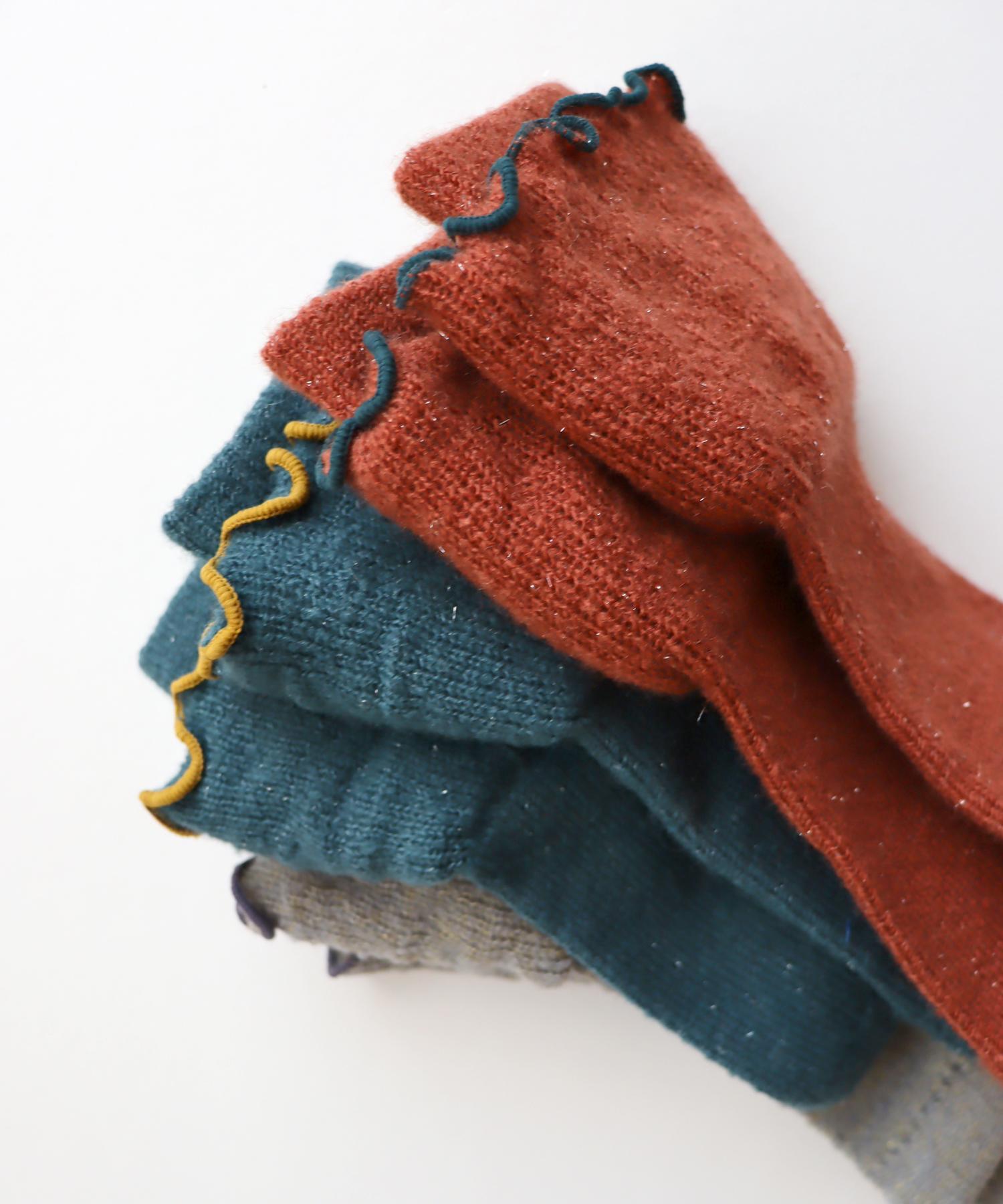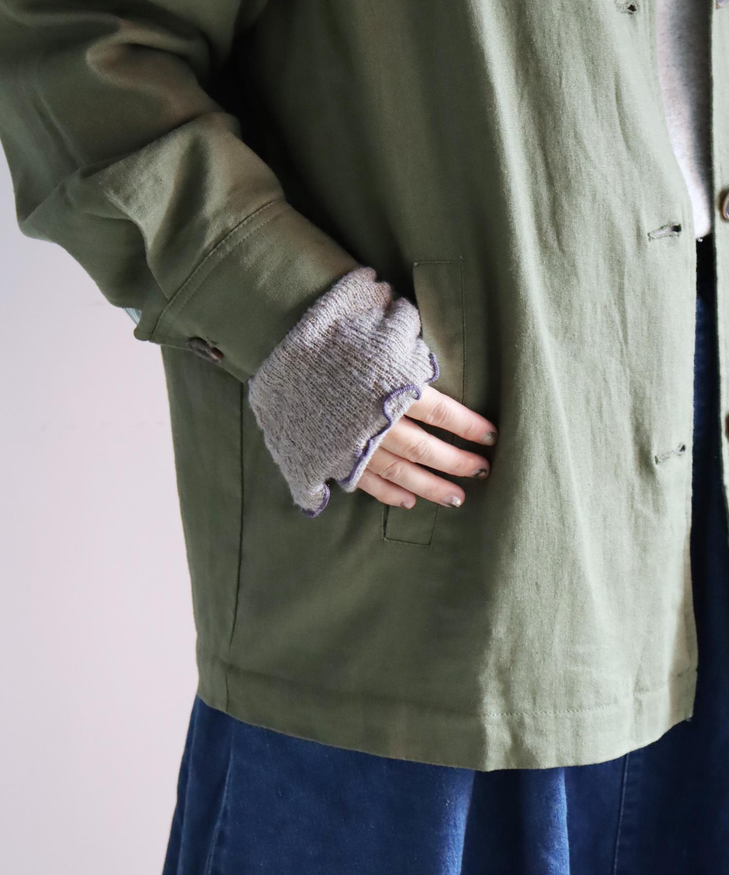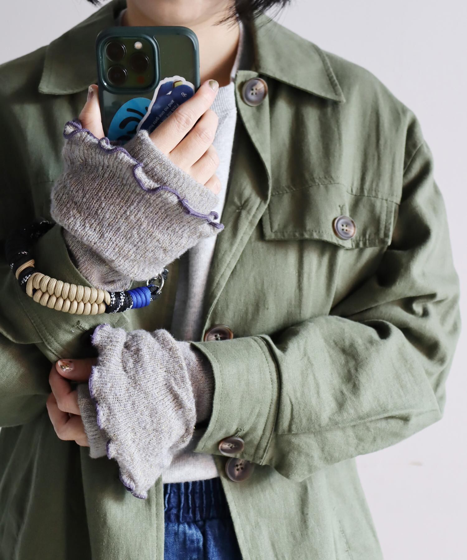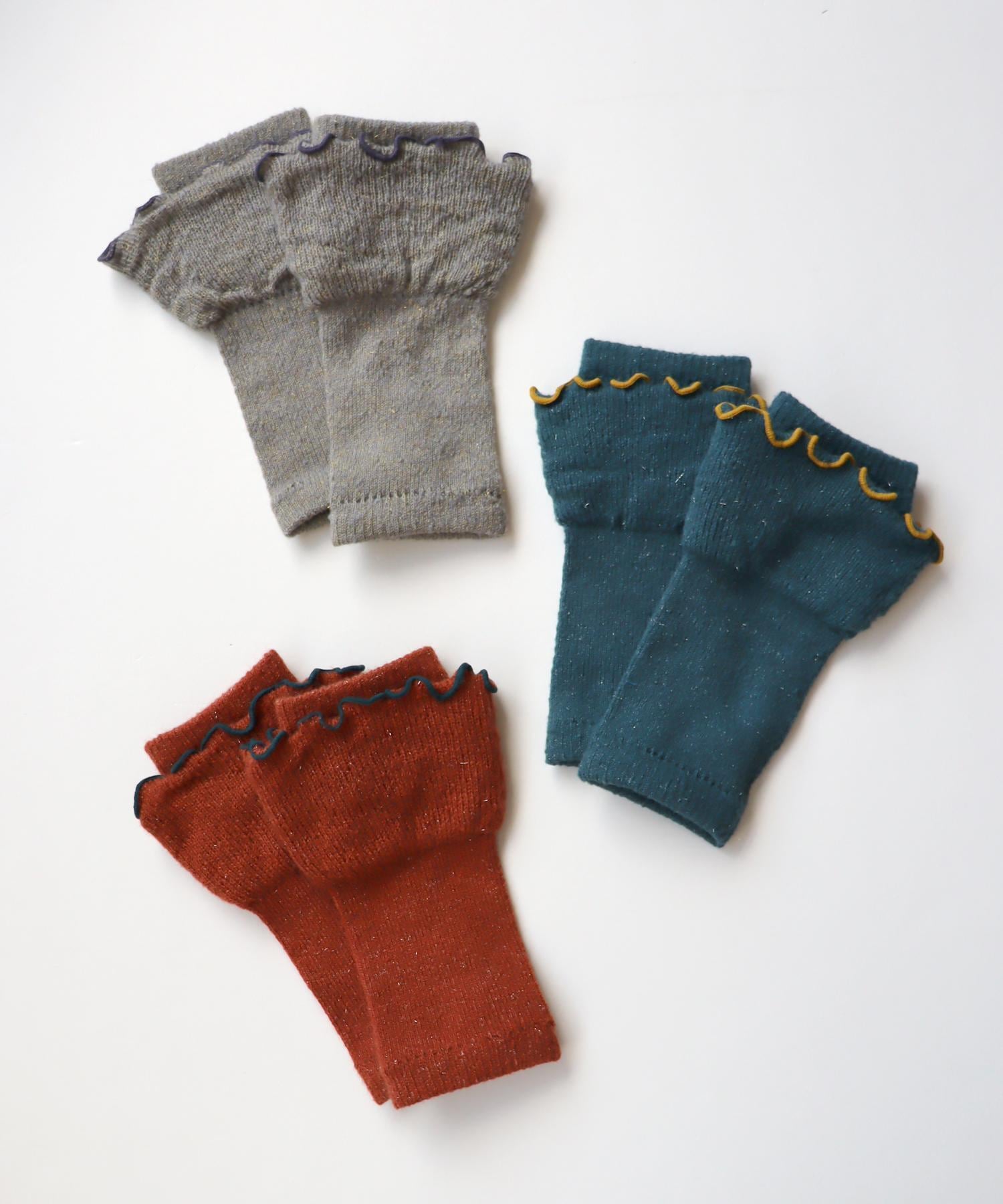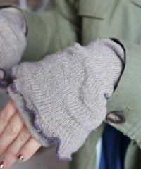 大きめのフリルが目立つハンドウォーマーです。ラメ入りなので地味になり過ぎず、防寒しながらおしゃれを楽しめます◎