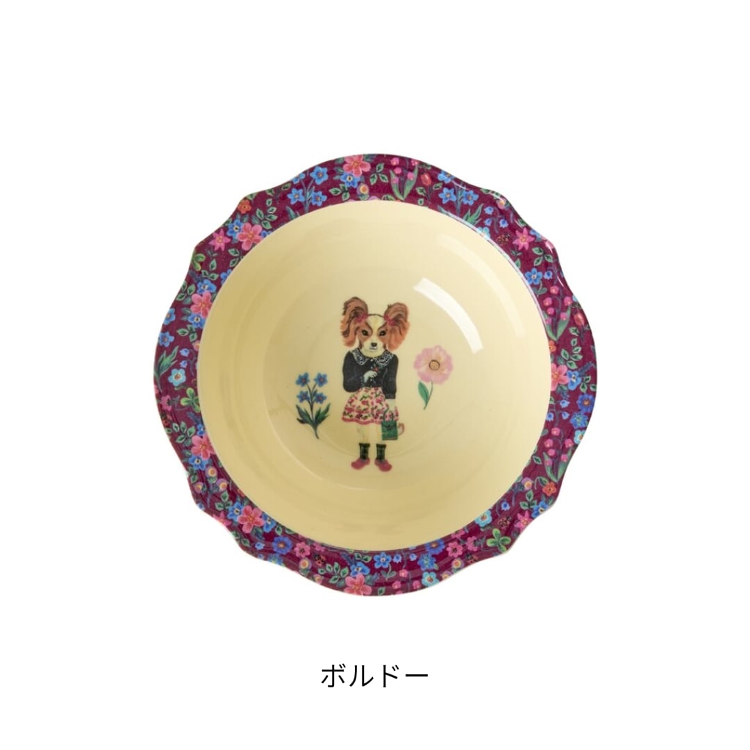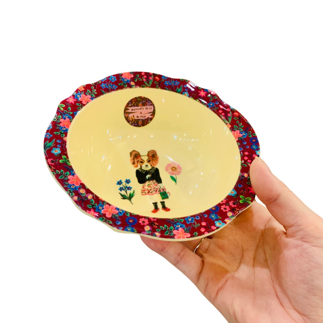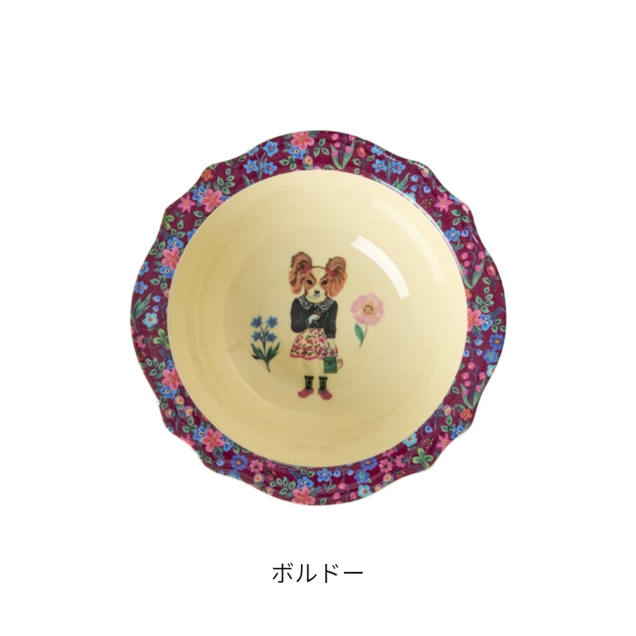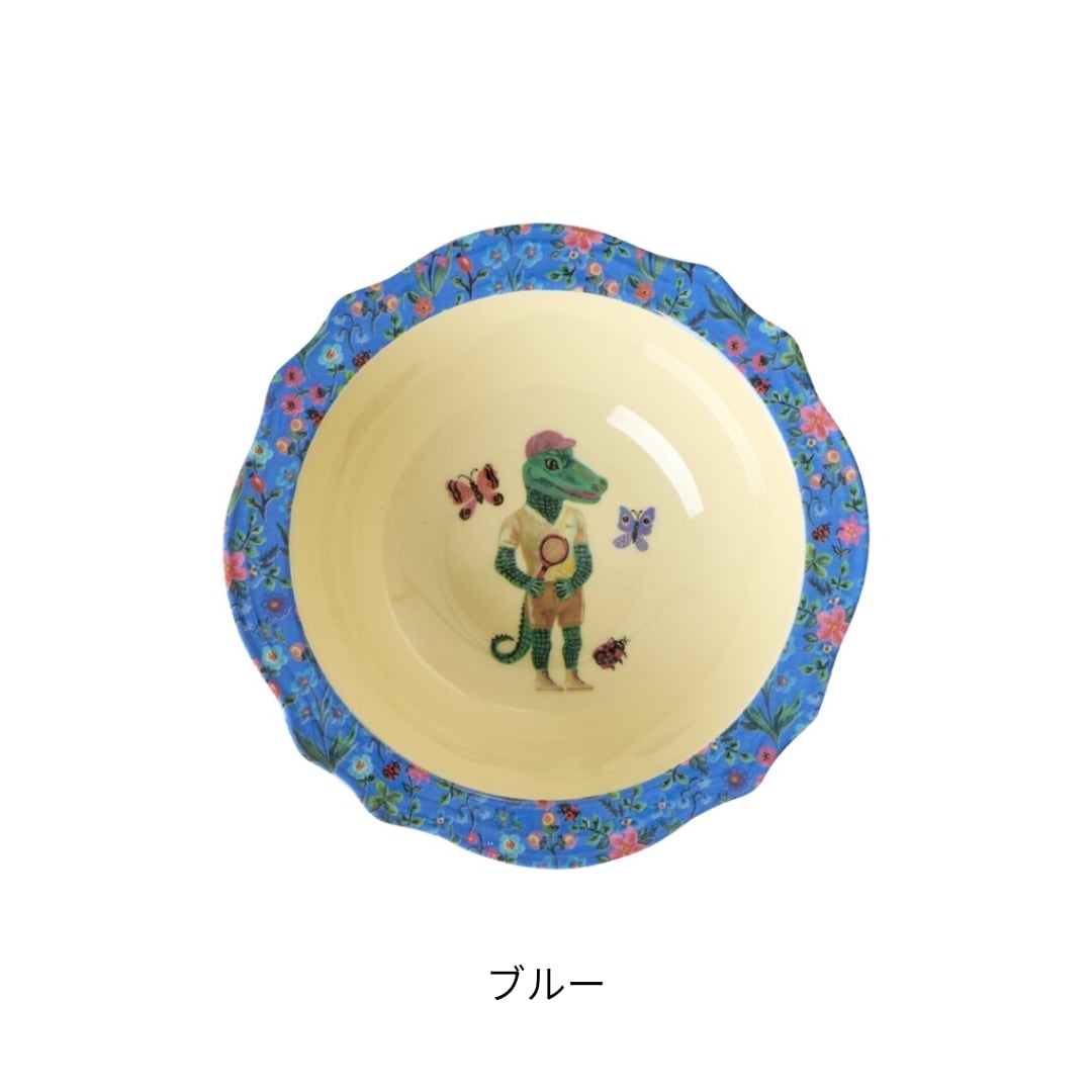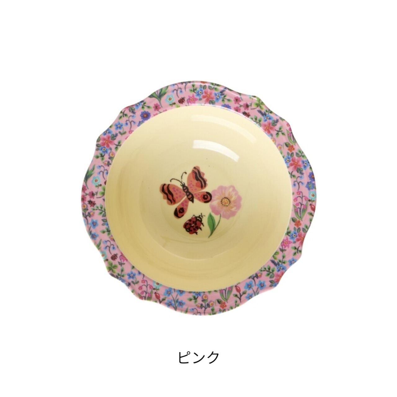 蝶々とお花がプリントされたメラミンボウル。フチのデザインとお花の柄まで可愛いです。軽量で丈夫に出来ているのでお子様でも安心してお使いいただけます。
