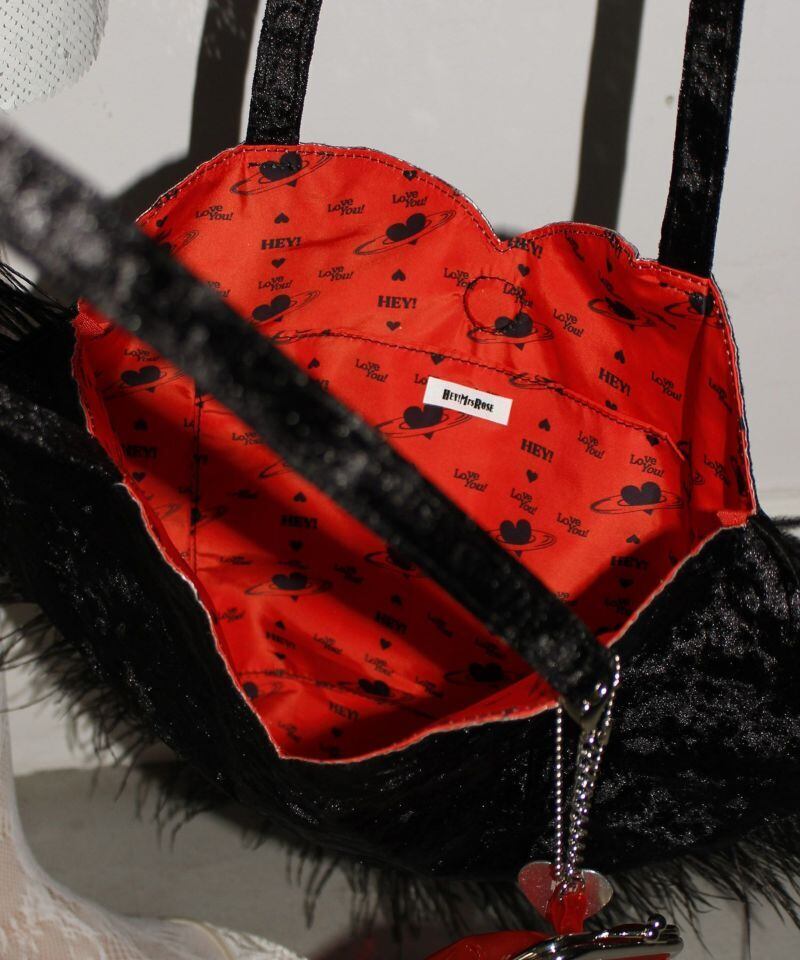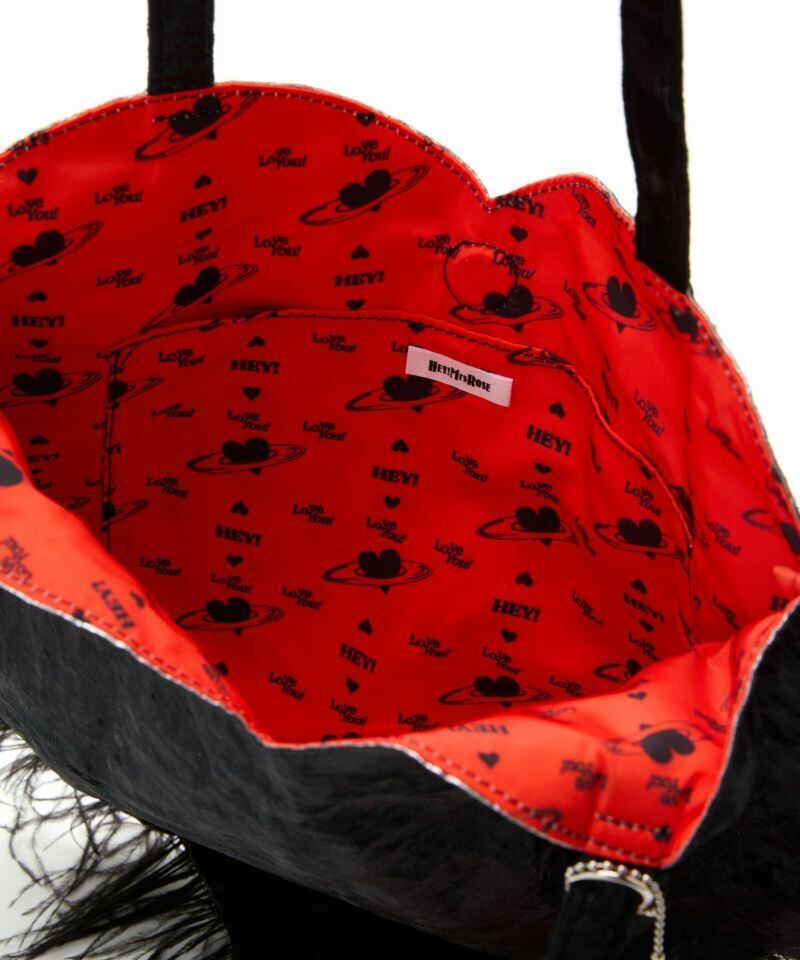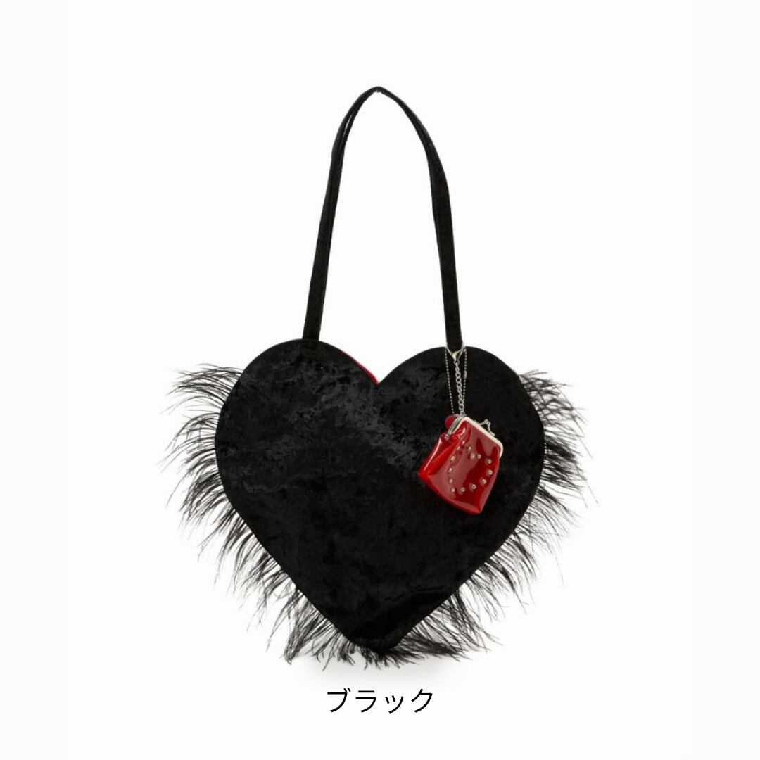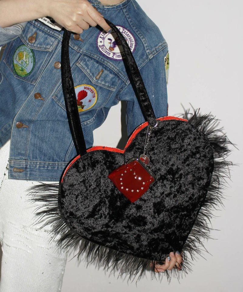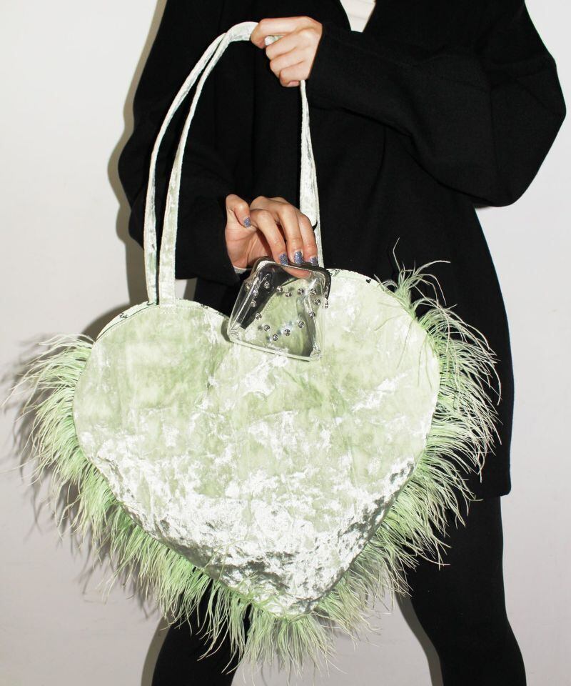 アルミシートを裏に貼ったベルベット生地を使ったハートのトートバッグ。ふわふわと揺れるマラボーが可愛らしいです。裏地にもハートがいっぱいデザインされています。