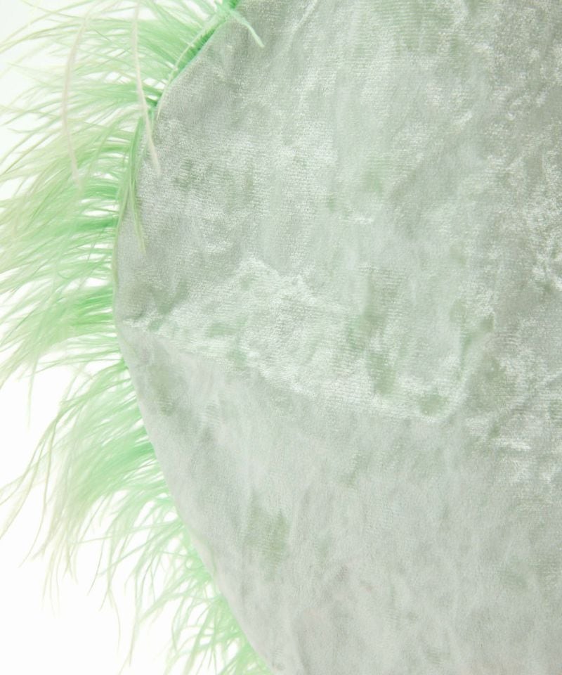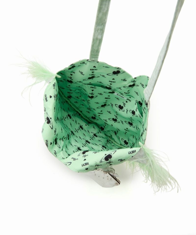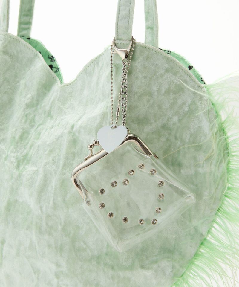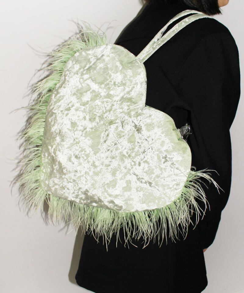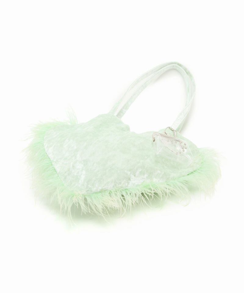 アルミシートを裏に貼ったベルベット生地を使ったハートのトートバッグ。ふわふわと揺れるマラボーが可愛らしいです。裏地にもハートがいっぱいデザインされています。