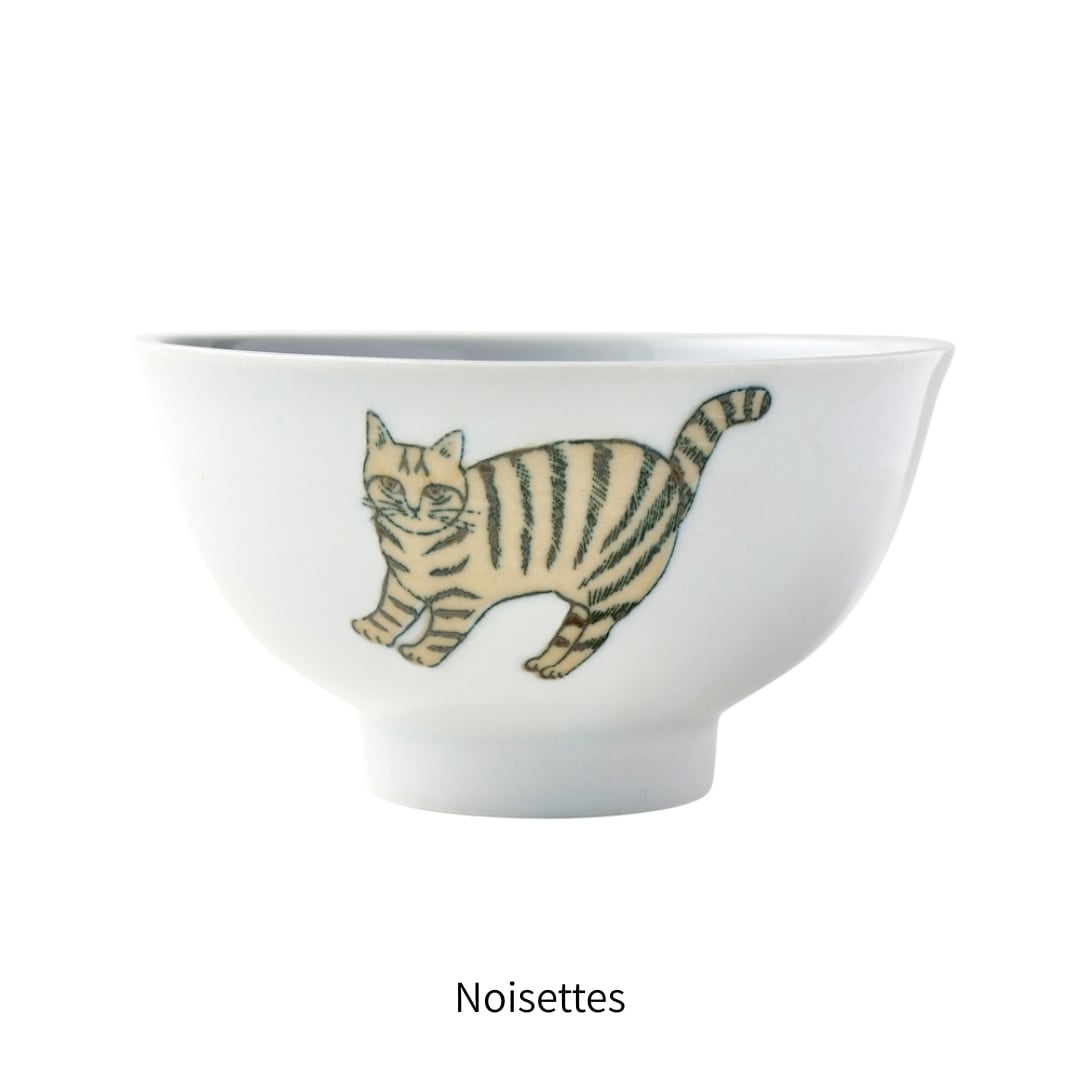 やわらかなタッチで描かれたネコたちがぐるりとあしらわれた、ほっとするようなお茶碗です。
