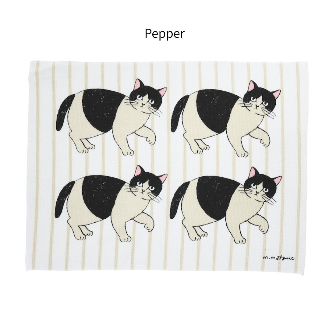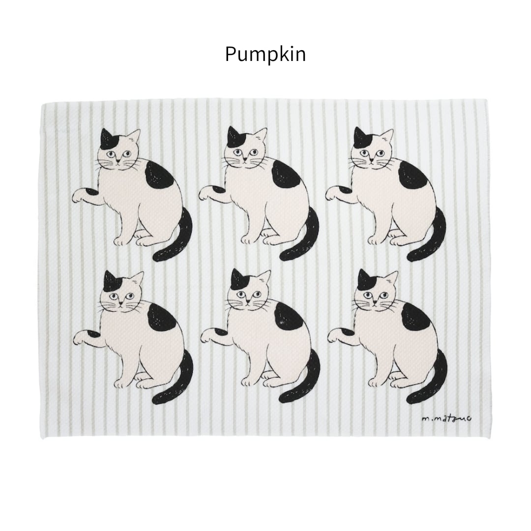 ストライプ柄を背景に、松尾ミユキさんのネコたちがちょこんと描かれたキッチンクロス。