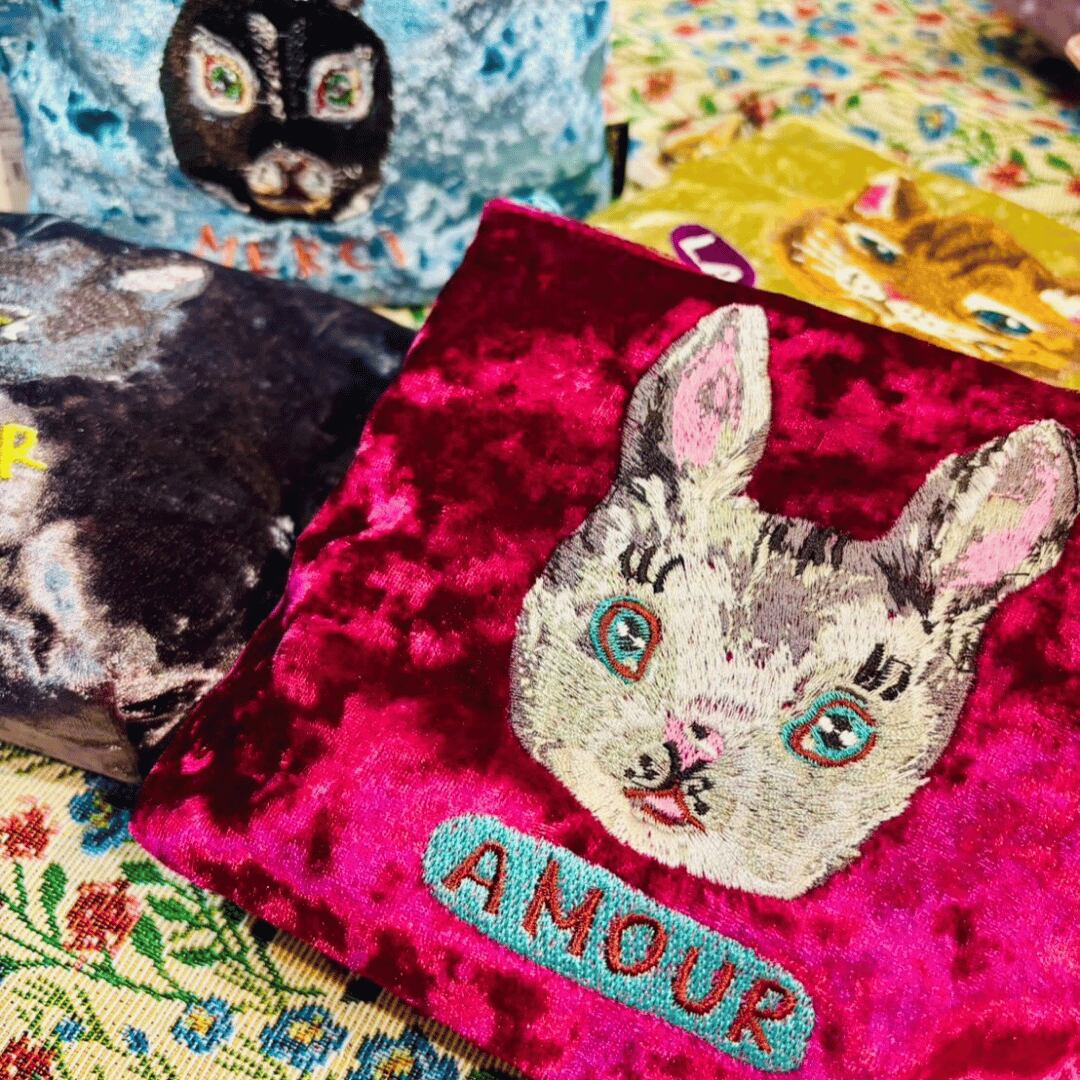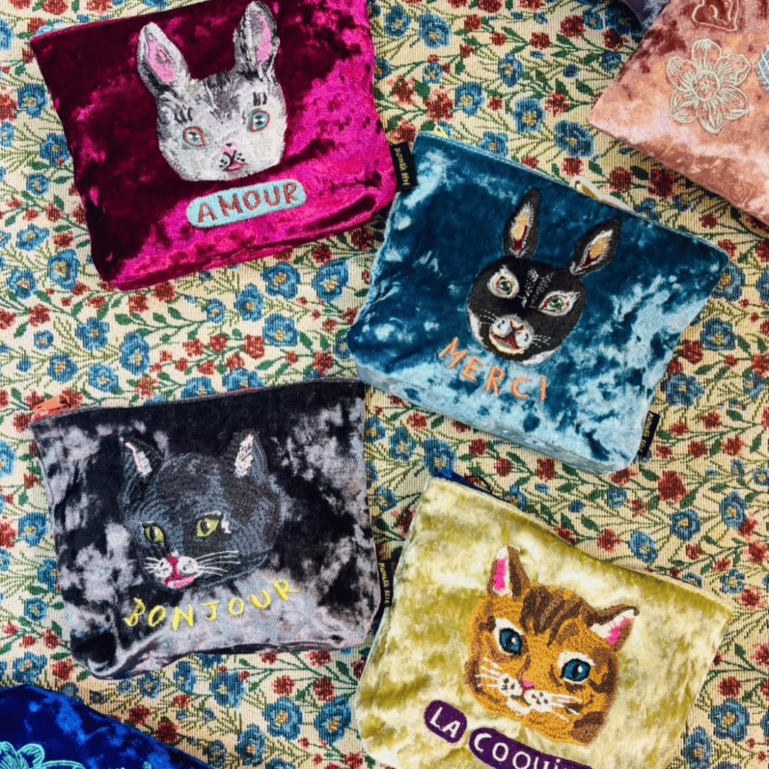 なめらかなベロア素材に、ナタリー・レテさんの描く動物たちが刺繍されたポーチです。