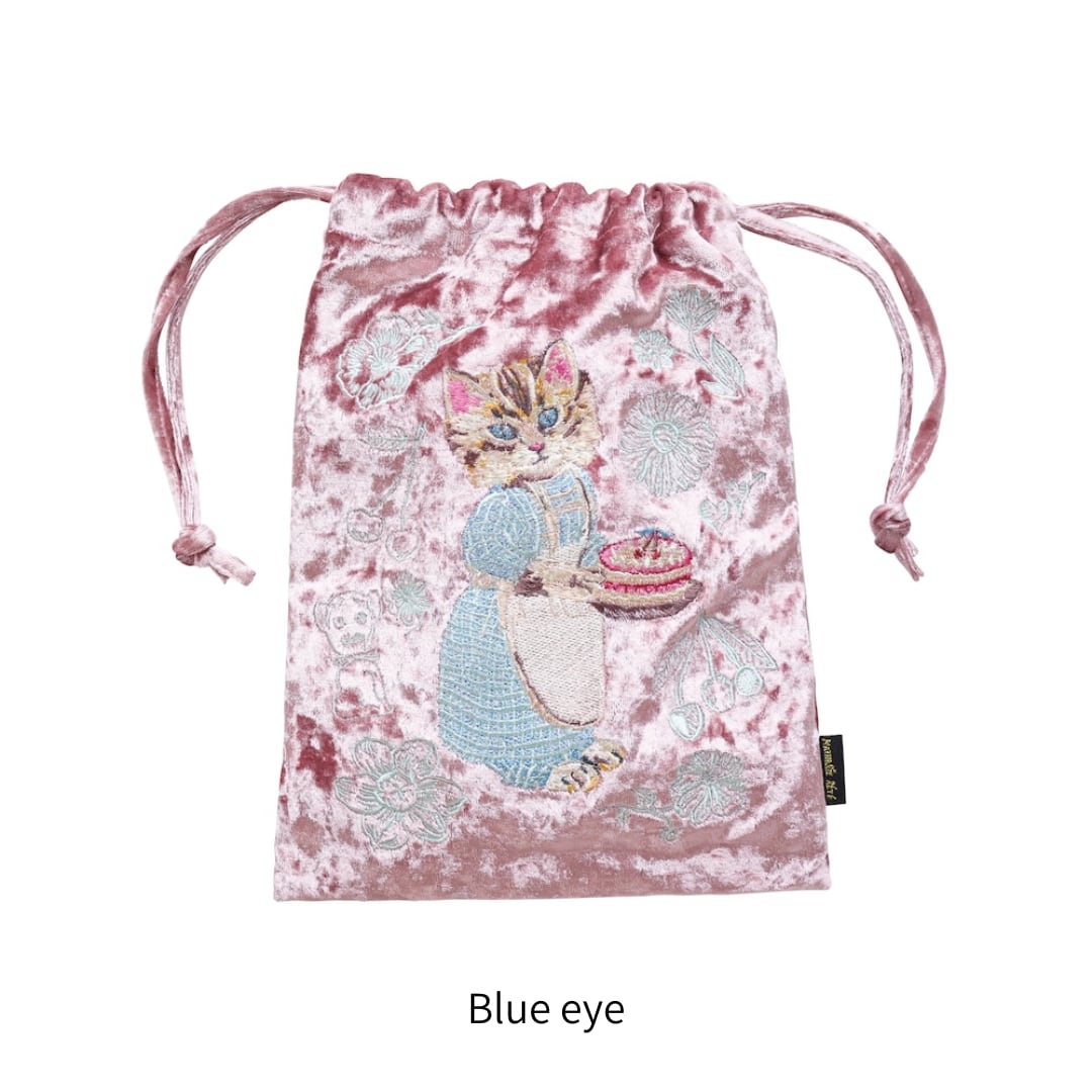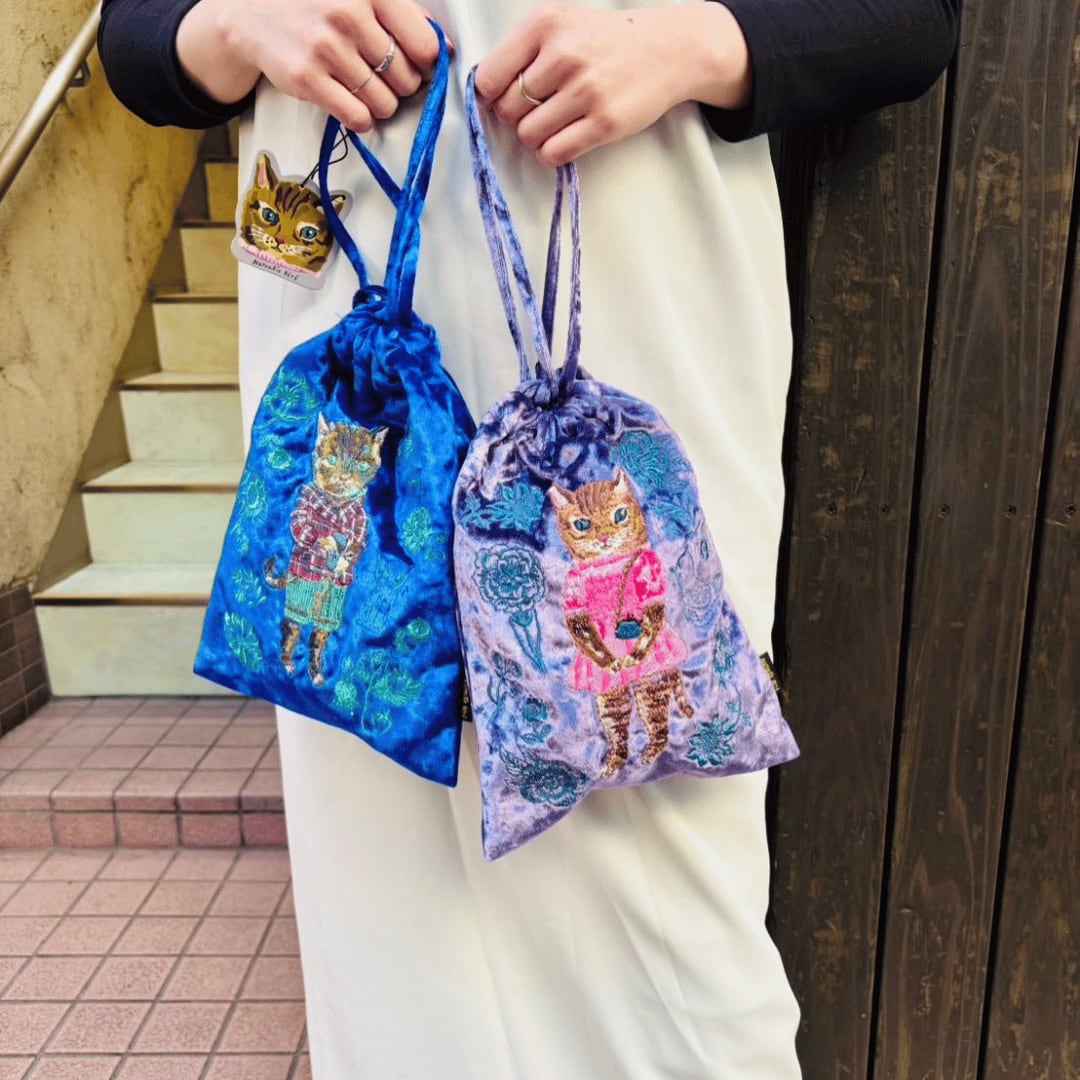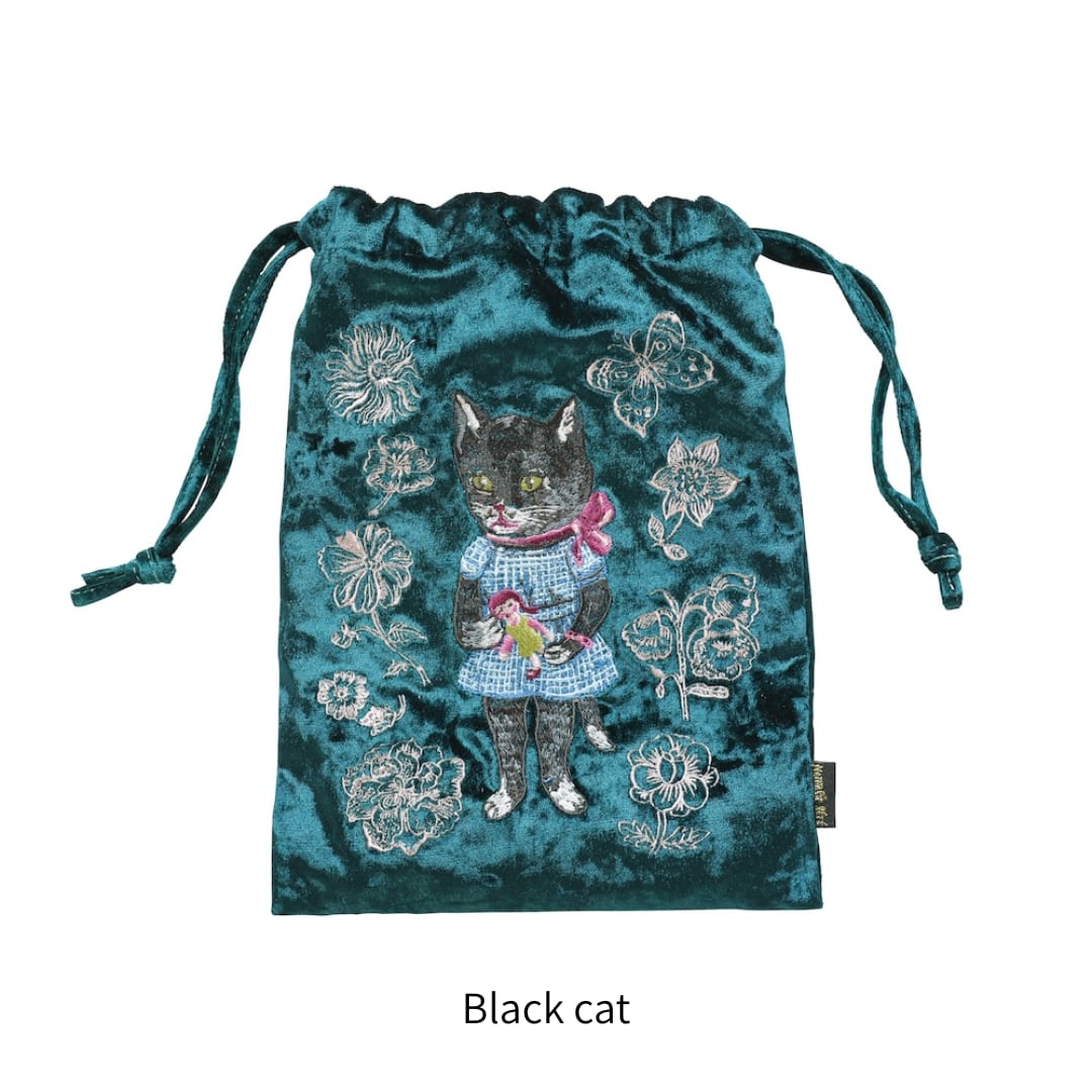 なめらかなベロア生地に、ナタリー・レテさんの愛らしい動物たちが刺繍で描かれた巾着です。