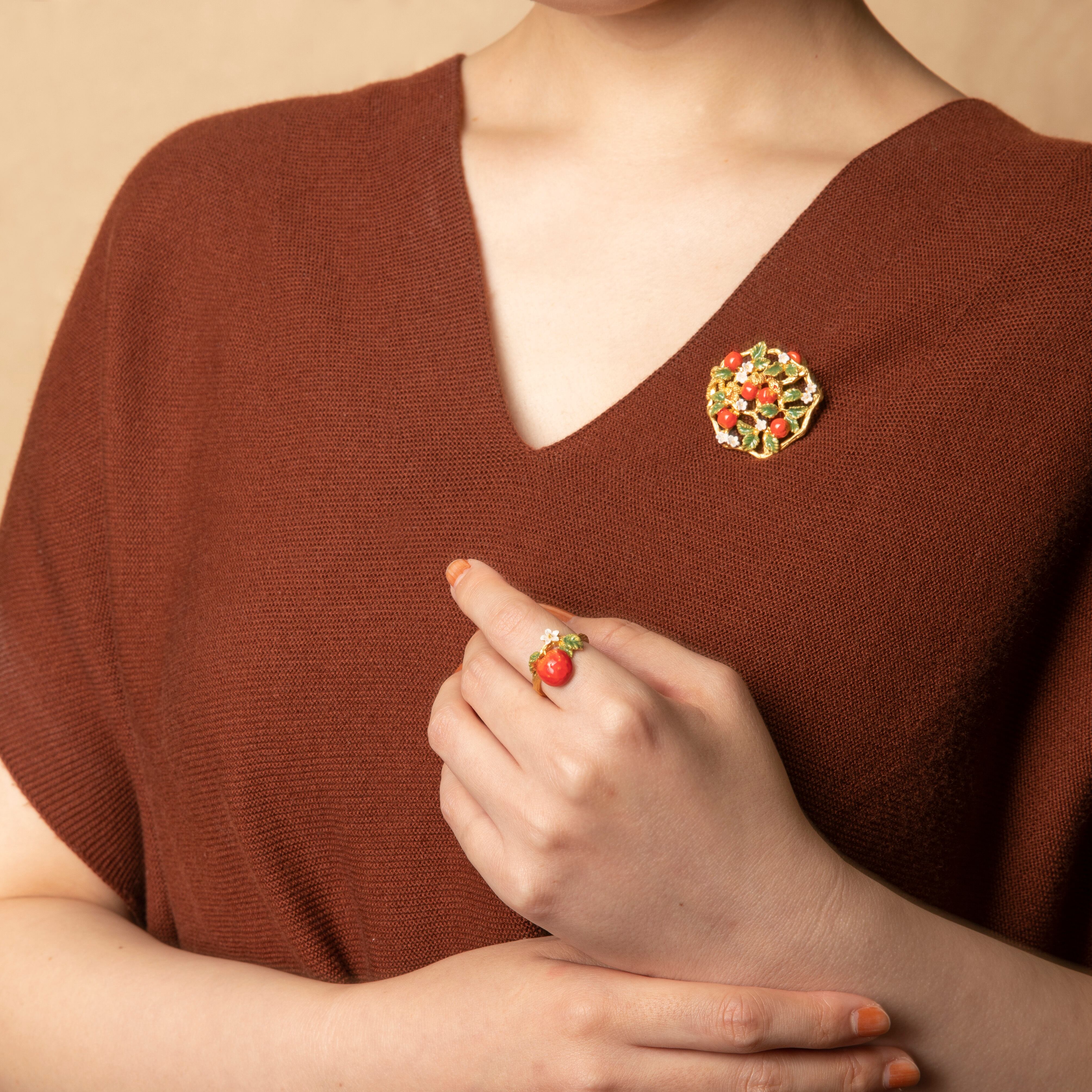 美味しそうに実ったリンゴのリング。ぷっくりとした鮮やかな実が手元を彩ります。新鮮なリンゴのツヤ感や自然な色ムラを、造形やカラーリングで緻密に再現しています。まさに絵画のようなタッチの美しいアイテムです。リングの腕は枝のような形状でナチュラルな印象に。枝の先にも葉っぱがデザインされています。「アップフェル(Apfel)」はドイツ語でりんごという意味です。