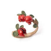 様々な神話や逸話に登場し不思議な魅力を持つフルーツ、ザクロモチーフにしたリング。鮮やかな赤色のザクロの実の中から熟した深紅の果肉が顔を出し、甘くフレッシュな香りが漂ってきそう。葉枝とあわせてデザインされているのでナチュラルな印象に。葉や果実はこっくりとしたカラーが使用されているので大人なコーディネイトをお楽しみいただけます。※葉にマットな加工を施しております。擦れ等でマット加工が取れてツヤが出ることがありますので取り扱いにはご注意ください。