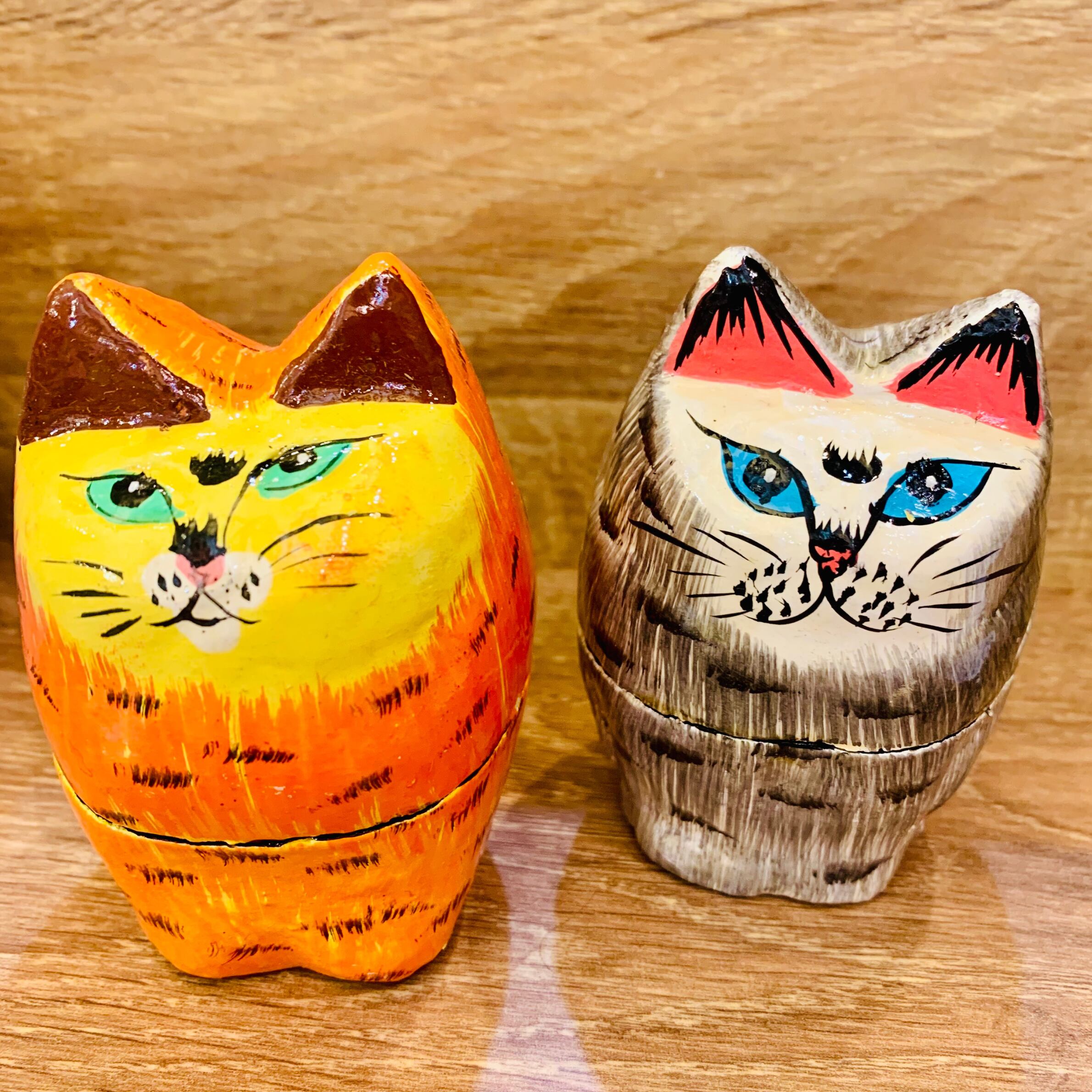 上目遣いがクセになる表情をしたネコのBOXです。すべてハンドペイントの為、同じように見えても一つずつデザインが違っているのも特徴。