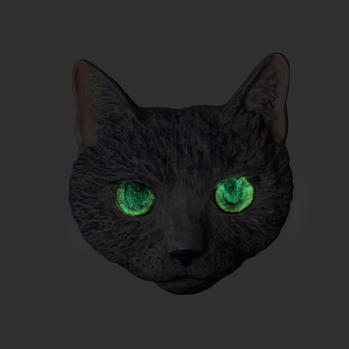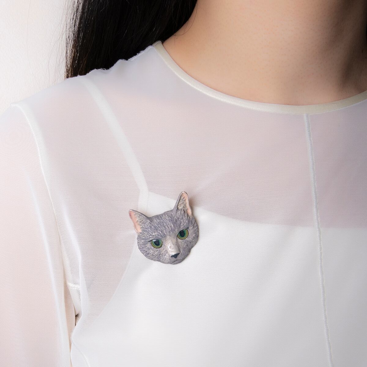 何かを訴えるかのように、こちらを下からじっと見つめてくるような表情の猫のブローチ。