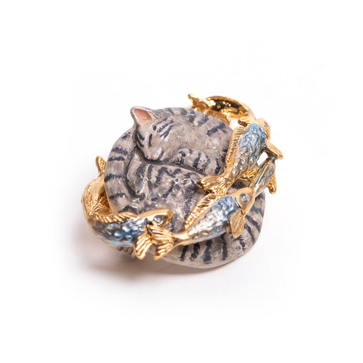 丸くなって眠る猫の周りを夢の中の魚がぐるりと囲う、土星のようなシルエットの可愛らしいアイテムです。