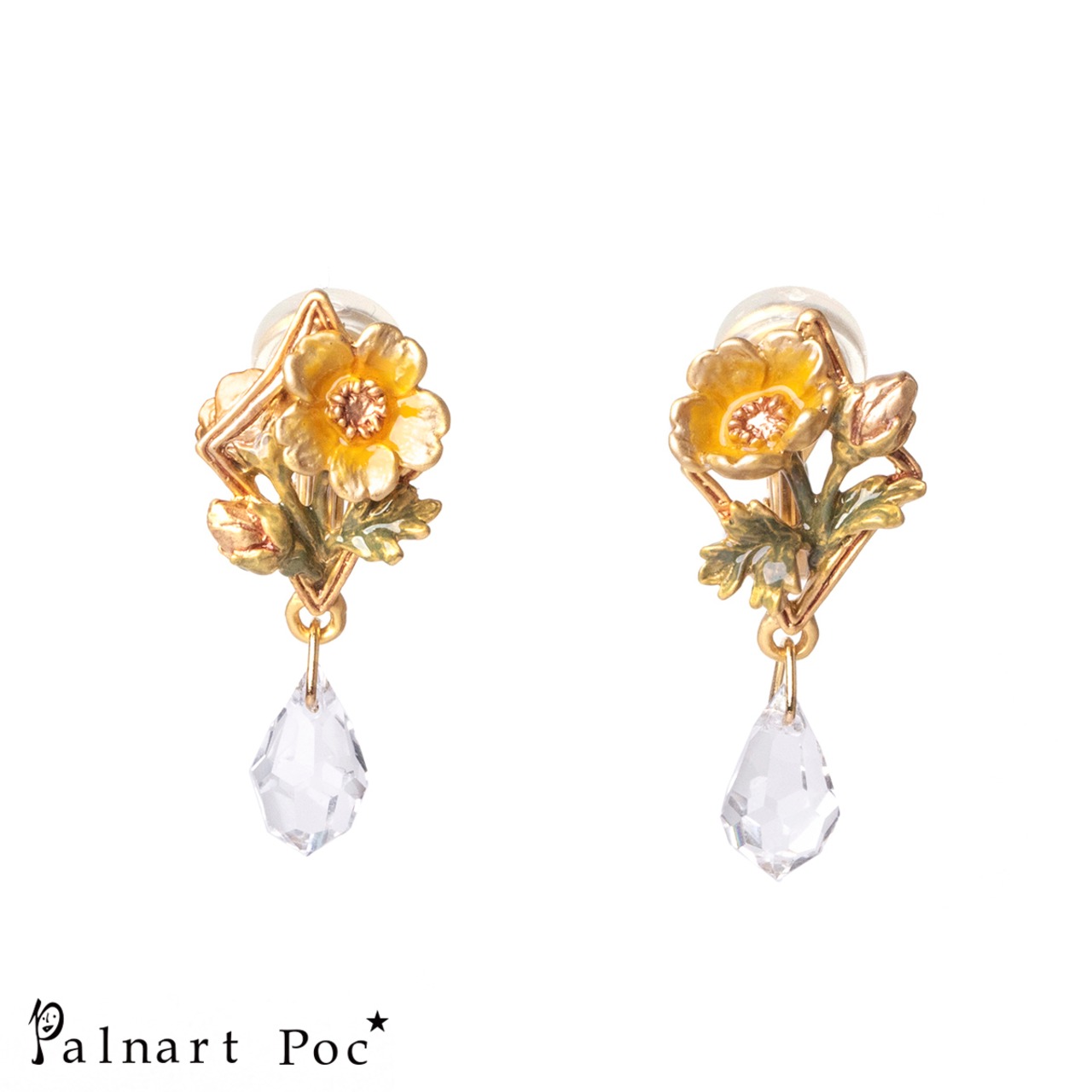 キンポウゲの花のスケッチをモチーフにしたイヤリング。さまざまな角度から観察した様子を表現するため、左右で異なるデザインに仕上げました。