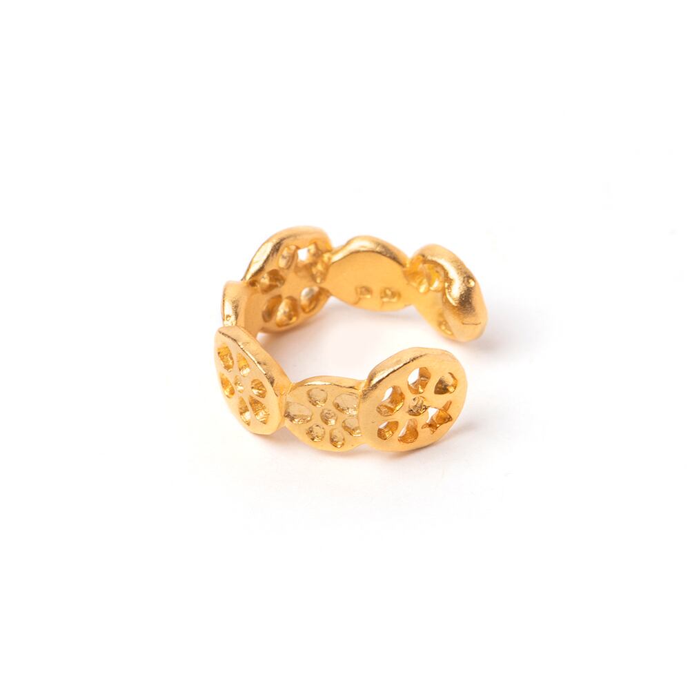 ユニークな切り口がかわいらしい野菜、レンコンをモチーフにしたイヤーカフ。大小さまざまのサイズや、透かしがあるものと無いものをランダムに配置したリズム感のあるデザインです。透かしの一部が星型になっているのもポイント!ゴールドカラーのシンプルなアイテムなので身に着けやすさも抜群。遠くから見るとレース模様のように見えるけどよく見るとレンコンだった!と二度見を誘う、遊び心があふれるアイテムです。