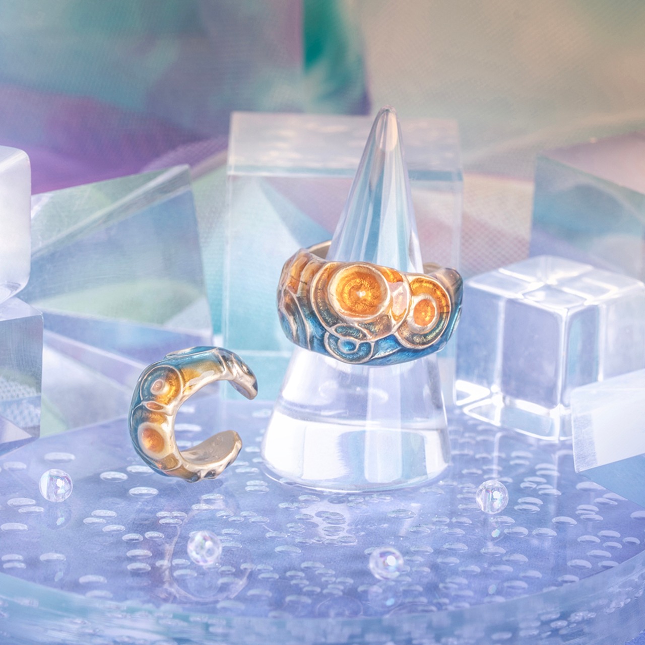 夕焼けのグラデーションと水紋の揺らぎを繊細に表現した、美しいアクセサリーです。