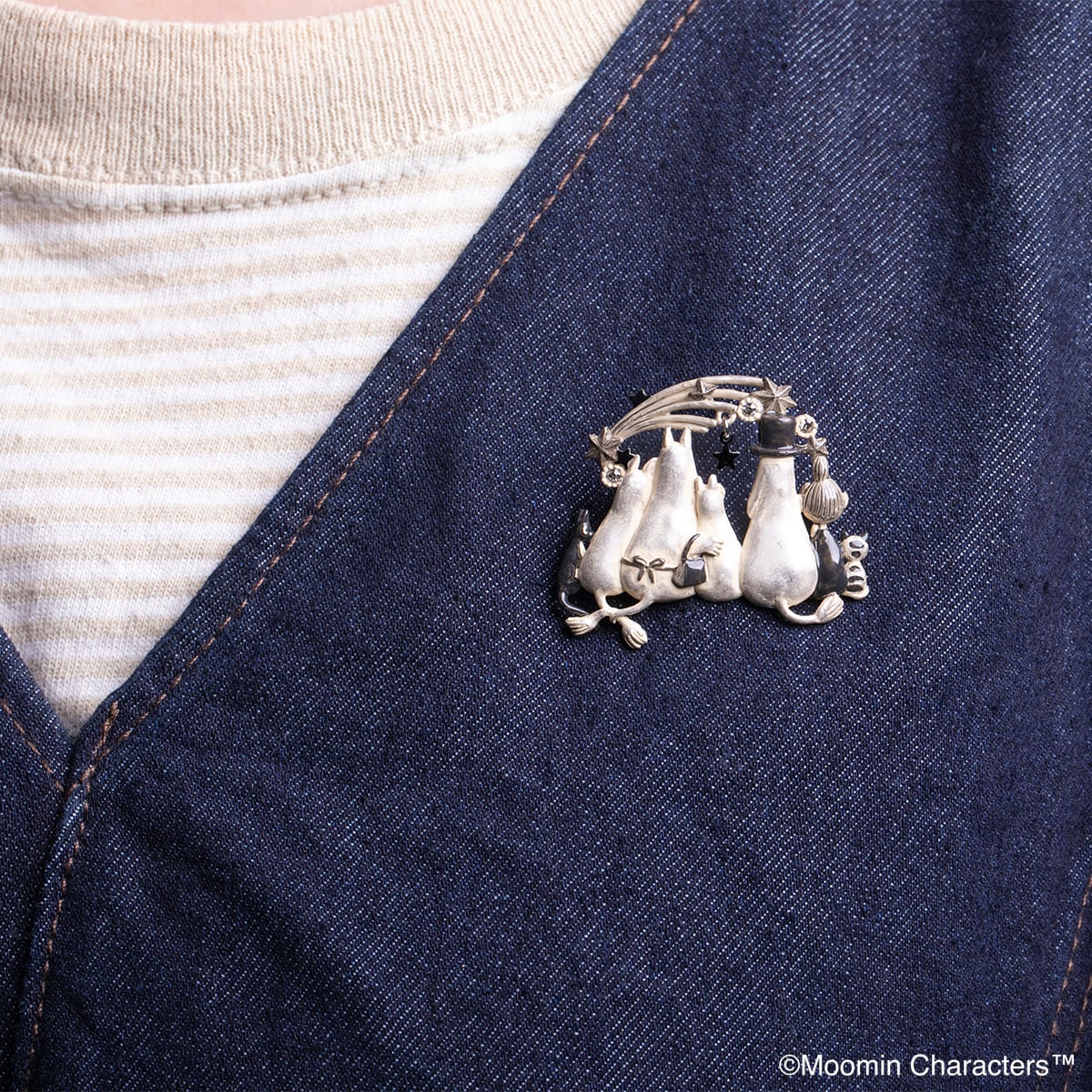満天の星を眺めているムーミン一家をイメージしたブローチ。流れ星に何を願っているのでしょうか?