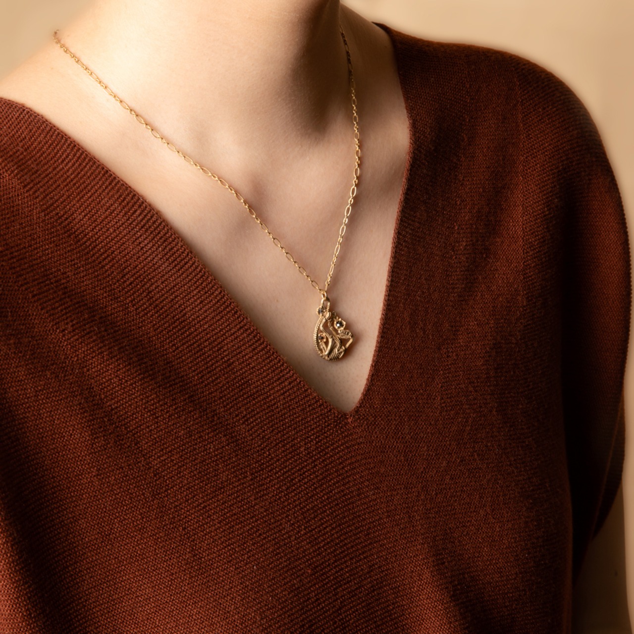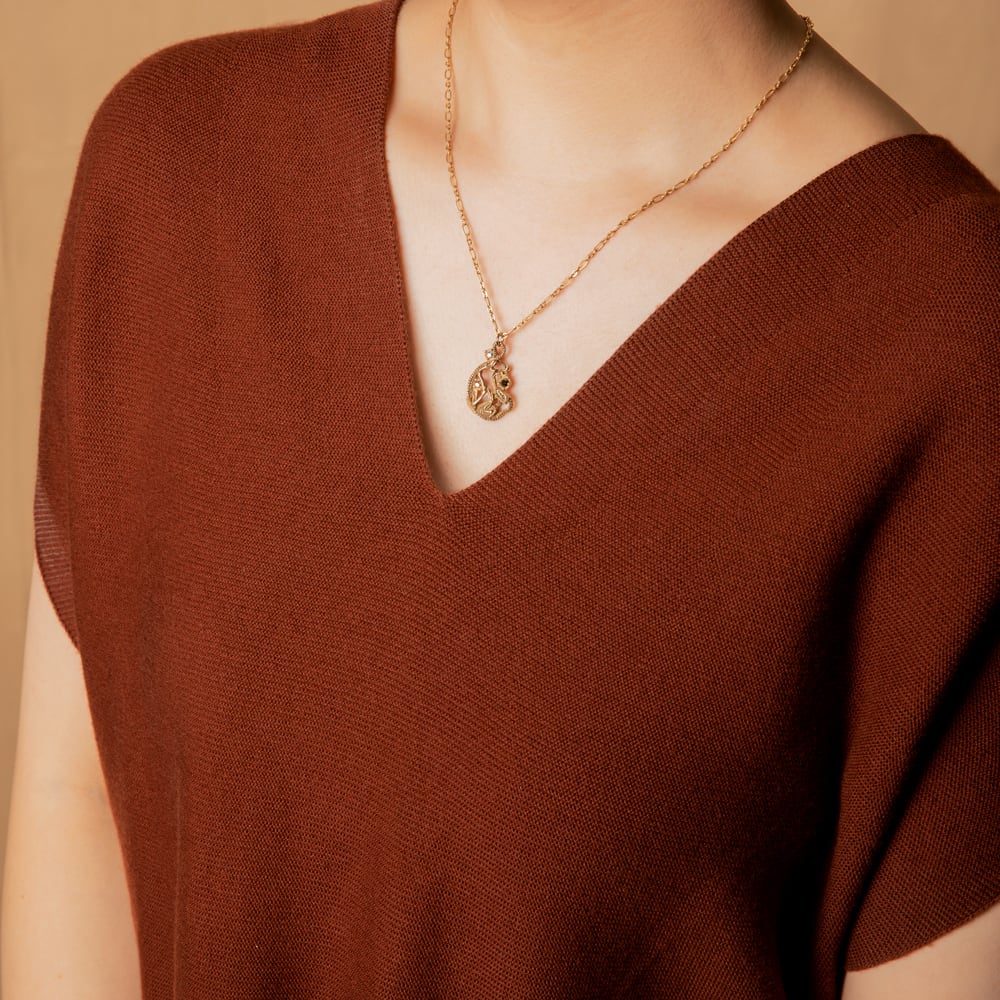 ヴェロキラプルトの化石をネックレスに。ティアドロップ型にデザインされ、チェーンからモチーフまでが流れるような美しいシルエットに仕上げています。3つのカットガラスはカラーにこだわり、まるで地中に埋まった鉱石のよう。モチーフ上部の丸カンは長いしっぽを生かして作られているのがこだわりポイント。くるんと丸まった尾から愛嬌も感じられます。いつか発掘されて再び地上に出るのを待っているようです。