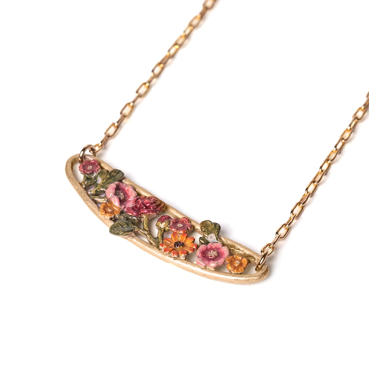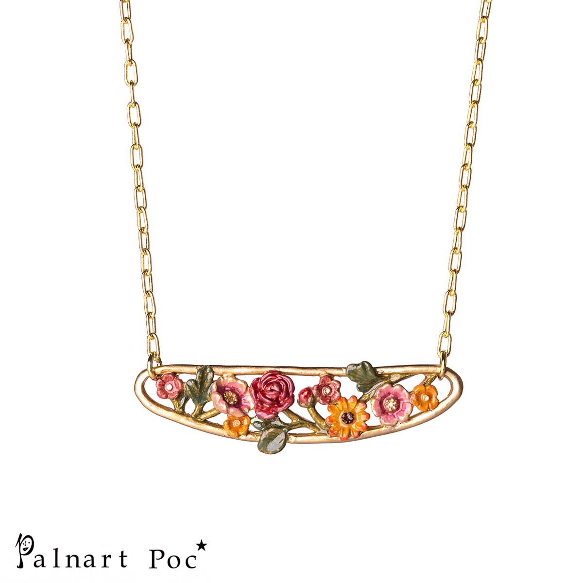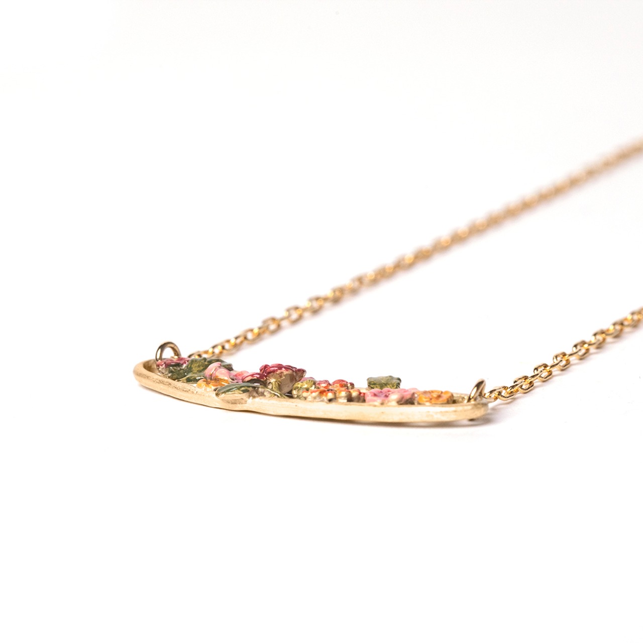 様々な形の花を敷き詰めたネックレスは、色合いが美しく見えるよう着色をされたバラ、キンポウゲ、ディモルフォセカなどで彩られています。
