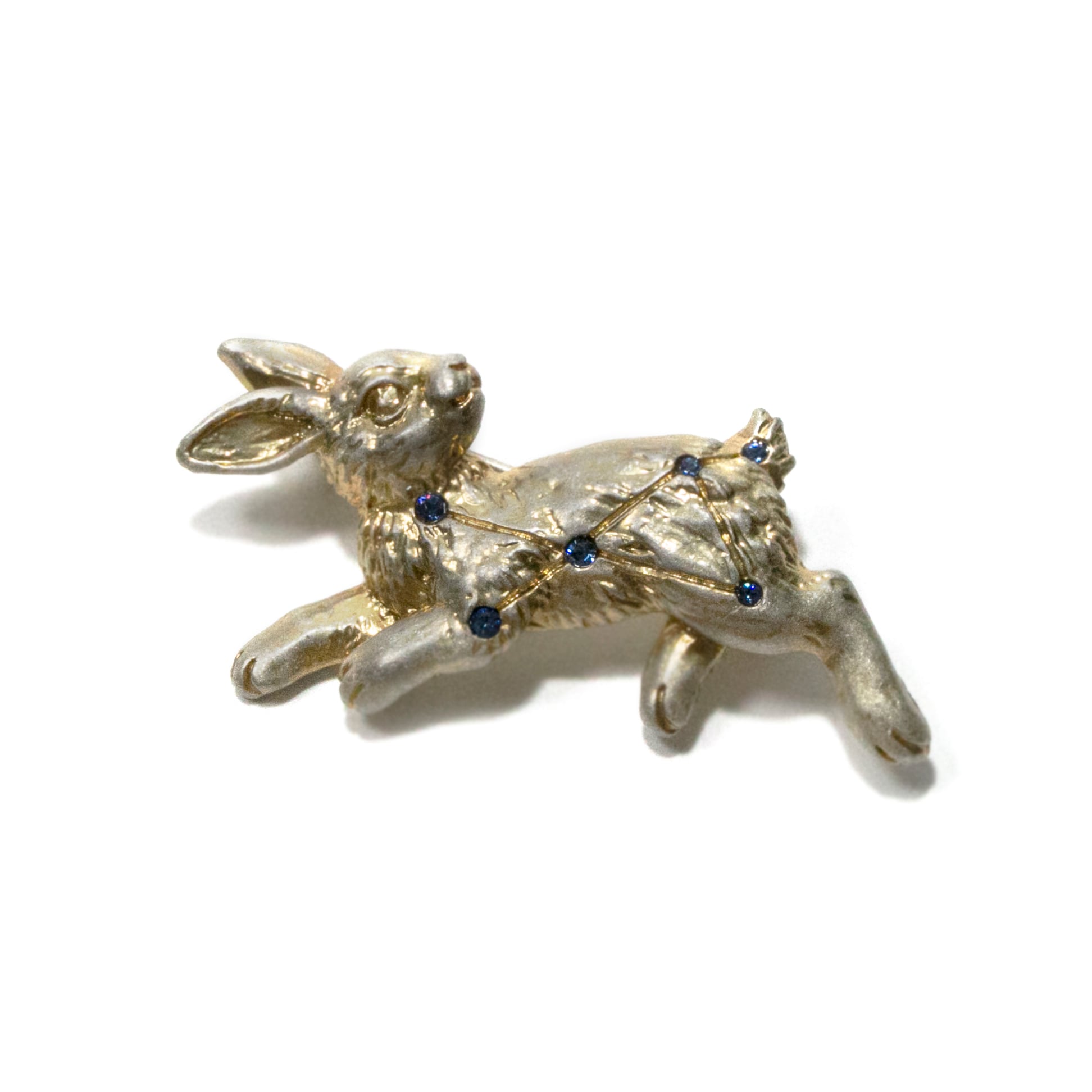 ウサギ座を反転させたブローチ。草原を駆け抜けるようなポーズの躍動感あふれるウサギ。リアルながら愛らしい表情を見せてくれます。白地にゴールドを乗せ品のある雰囲気に仕上げました。表情や躍動感を生かすため、カットガラスは体部分のみの配置になっています。