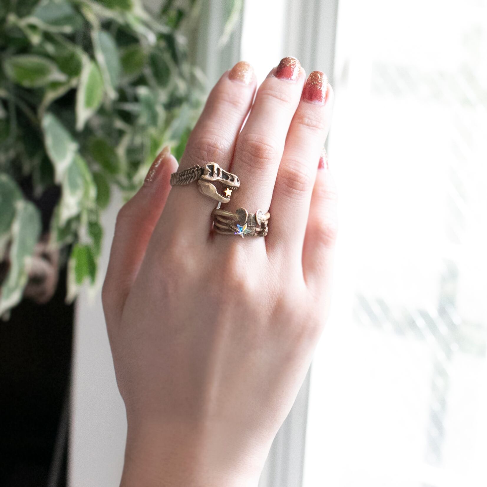 白亜紀の恐竜ティラノサウルスをリングにしました。フリーの2連リングです。上部は頭から頸椎まで、下部は肋骨・上腕を再現しています。ティラノサウルスが迫り来るような迫力を表現するため、立体的なデザインにしました。パルナートポックらしく星を持っているのもポイント!ひとつずつ着けても素敵なので、お友達や恋人と片方ずつ身に着けるのもおすすめです。