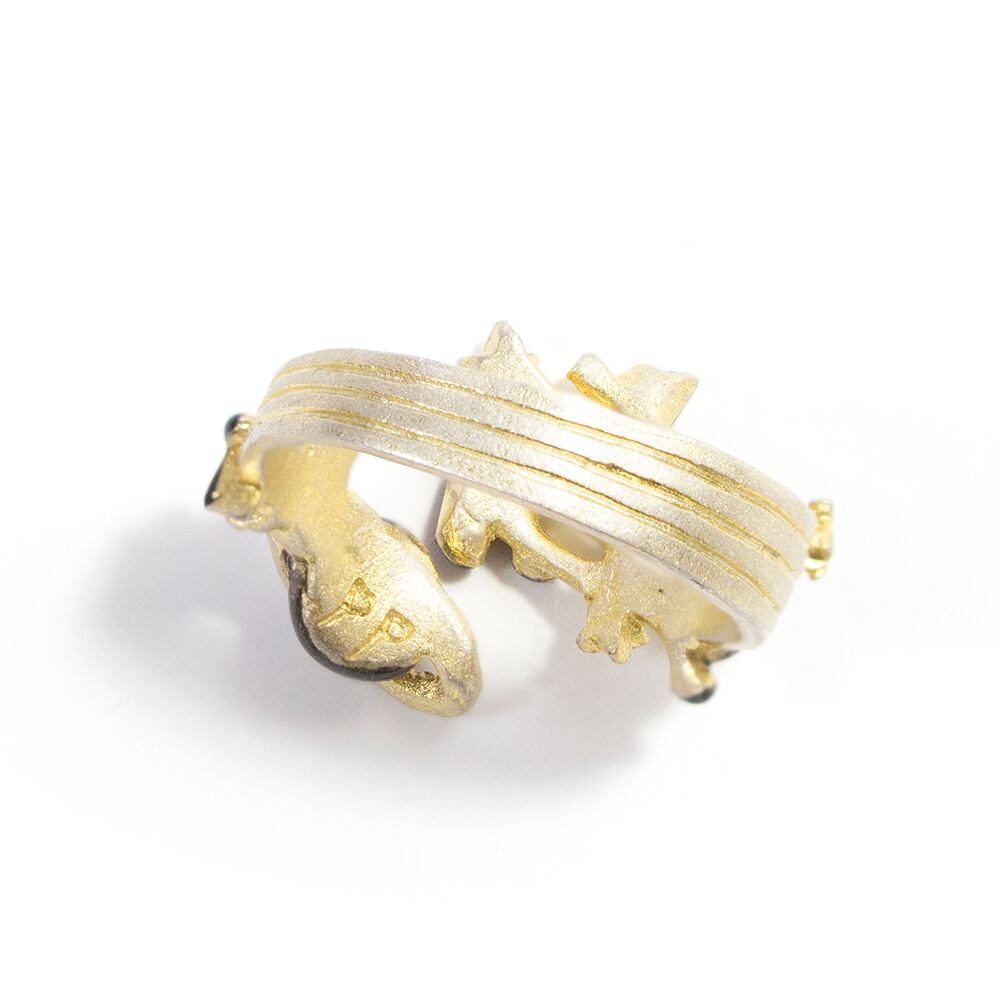 土星から聞こえてくるにぎやかな音楽をイメージしたリング。五線譜が広がって楽し気な音色が宇宙に拡散されています。星たちもキラキラと瞬きながら踊りだしそう!土星の右に並んだ音符はパルナートポックの「PP」の意味が込められています。土星はかつて太陽系の最果ての星と言われていたこともあり淡々とした暗いイメージを持たれますが、肉眼で見ることができるくらい明るく輝く星です。実は賑やかな一面も持っているのかもしれませんね。