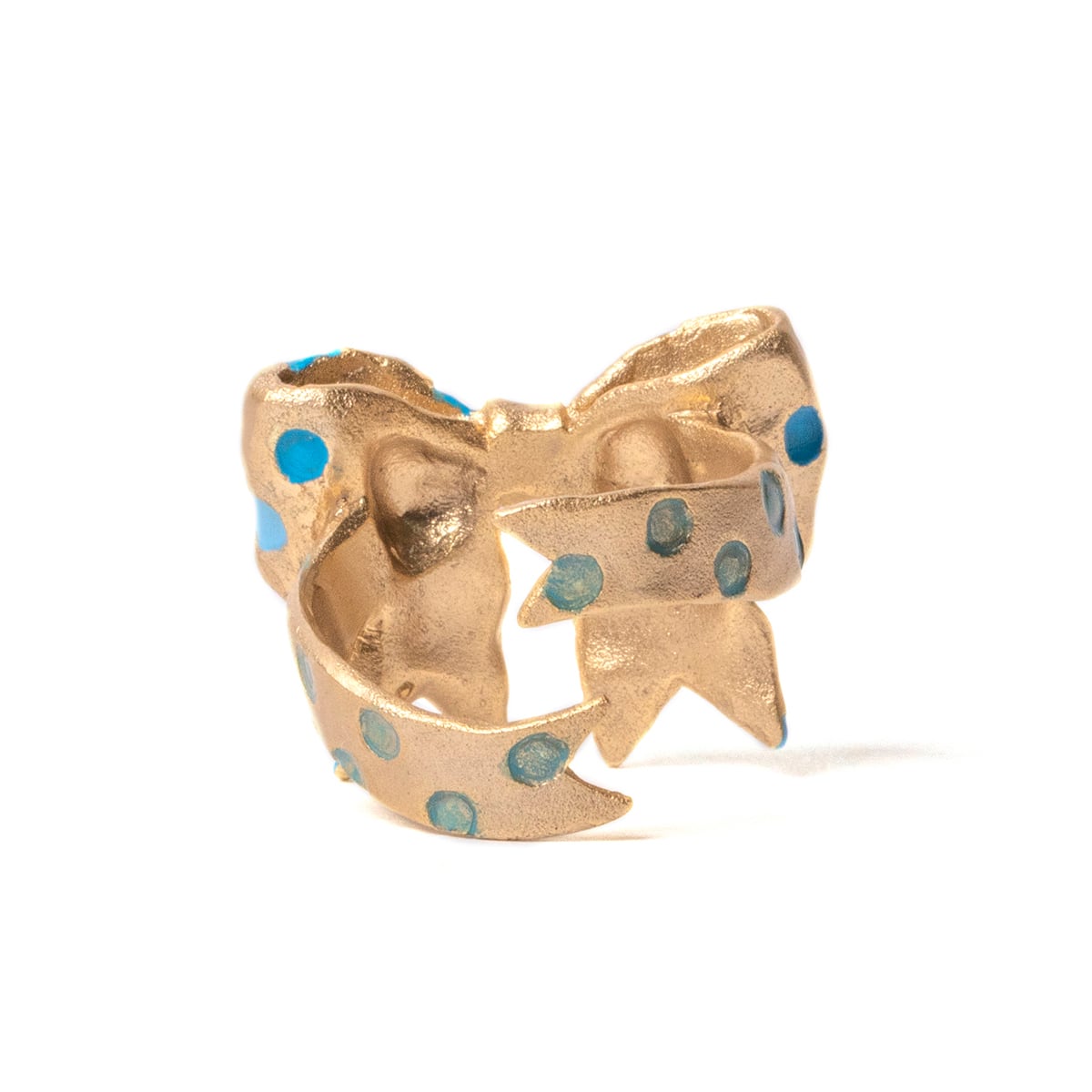 ボリュームのある大きなリボンがリングになりました。指先を飾るためふわっと結んだような立体感が印象的なデザインは、トーンの違う水色のドットで彩られています。
