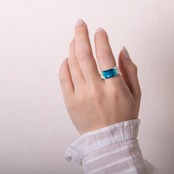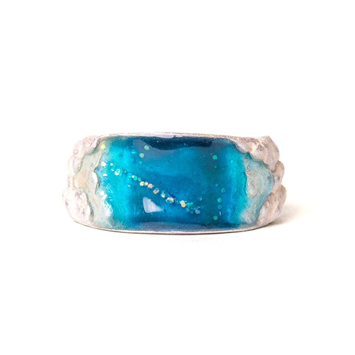 飛行機の窓から見える景色をデザインしたリング、果てしなく広がる空から成層圏の様子が色を何層も重ねて表現された繊細なアイテムです。
