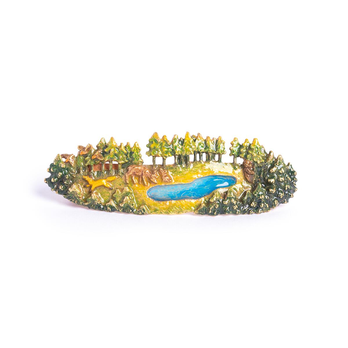 森の泉に柔らかな日差しが差し込む、穏やかな風景を描いたバレッタ。