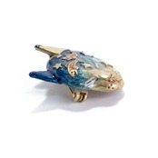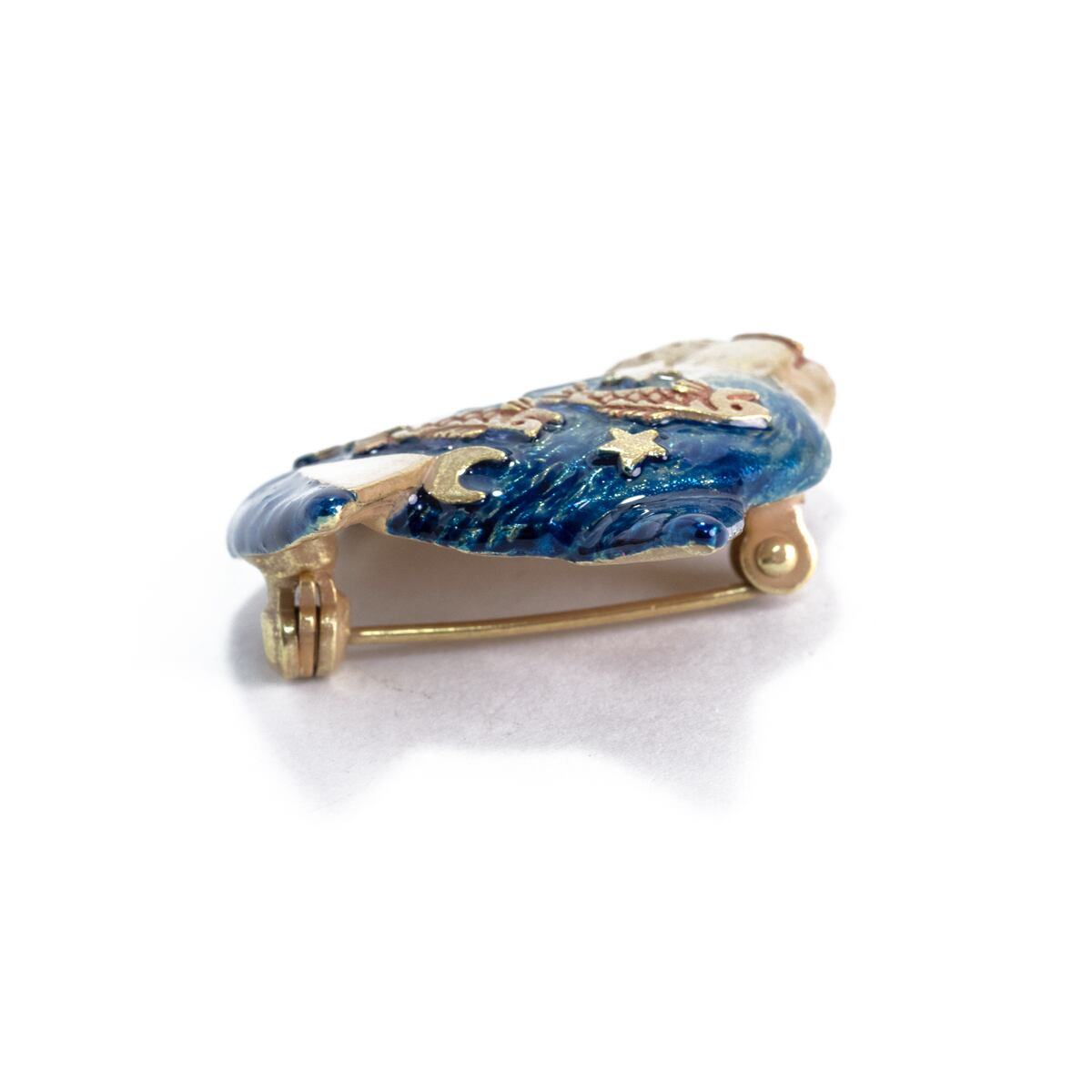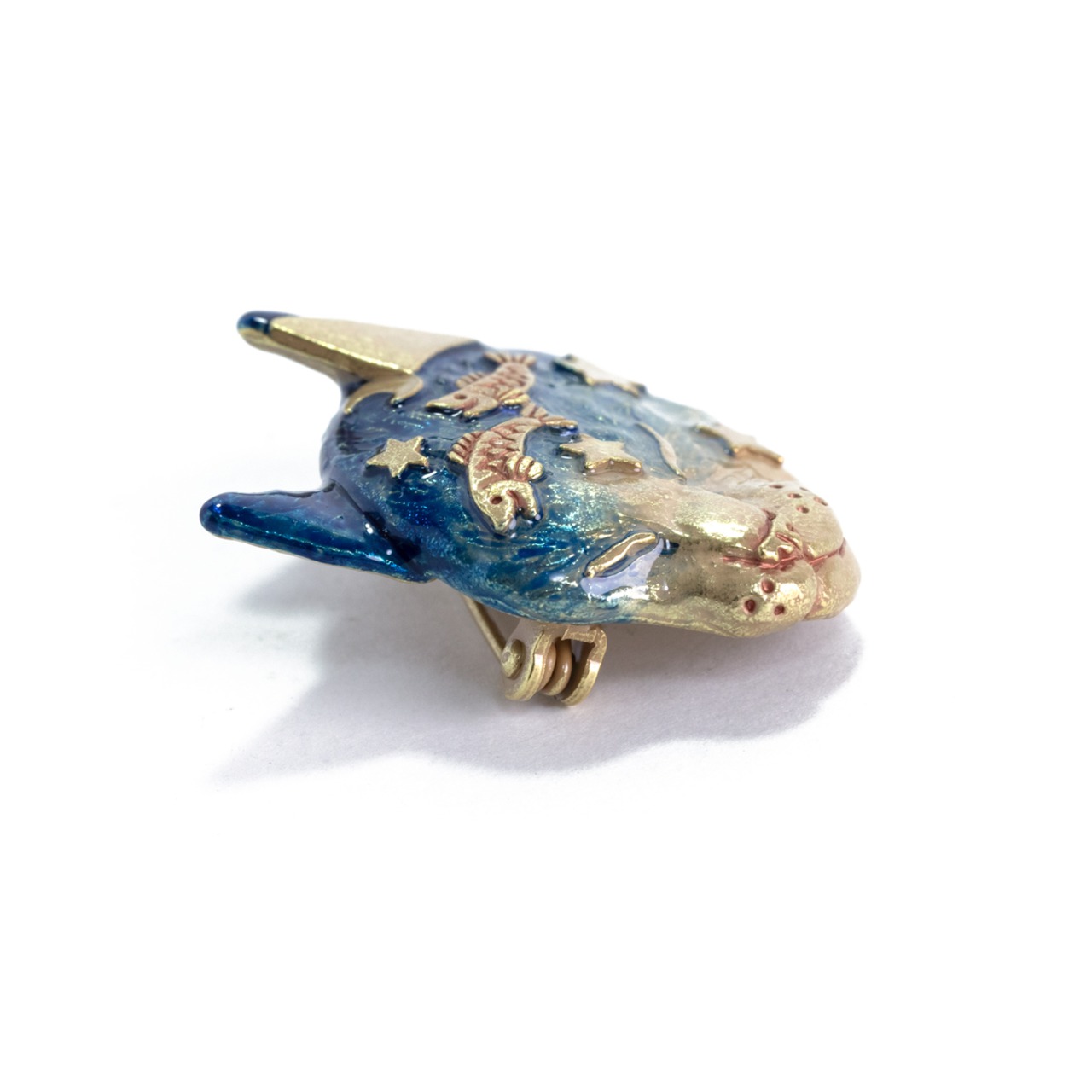 煌めく星空の下で魚たちが楽しそうに泳いでいます。ブローチの裏面にも元気よく飛び出してしまった魚が一匹。