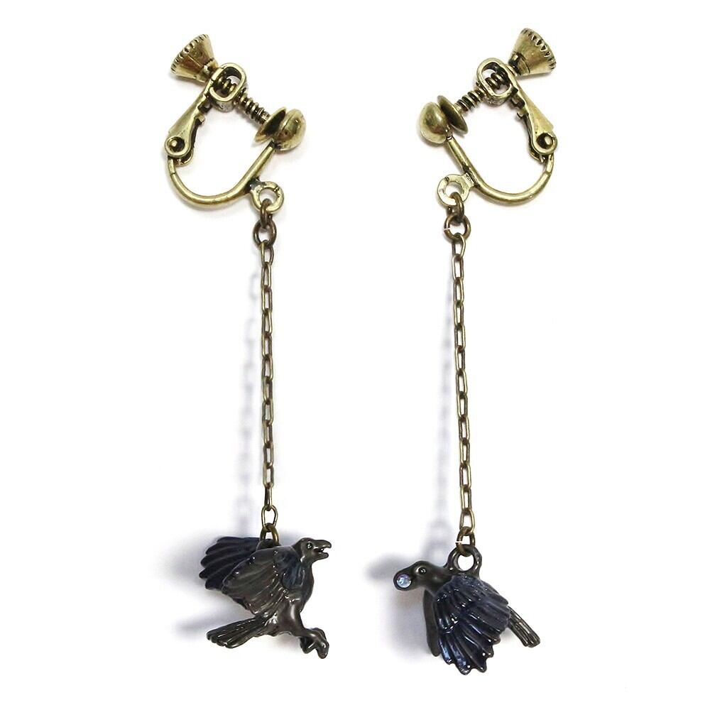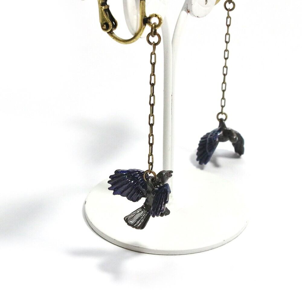 キラキラ光るものを見つけて自慢げなカラスと、「いいなぁ、それどこで見つけたの?」と羨ましそうに飛んできたカラスのイヤリング。2匹が無邪気に遊ぶ姿を切り取ったアイテムです。