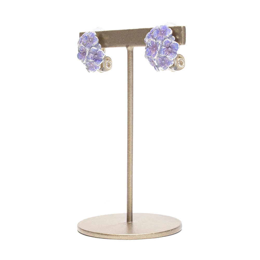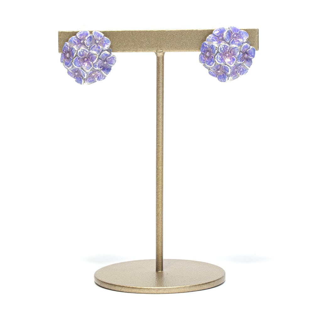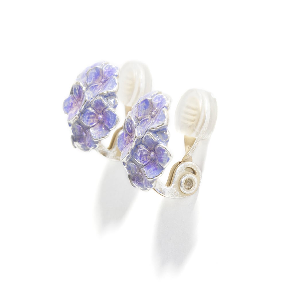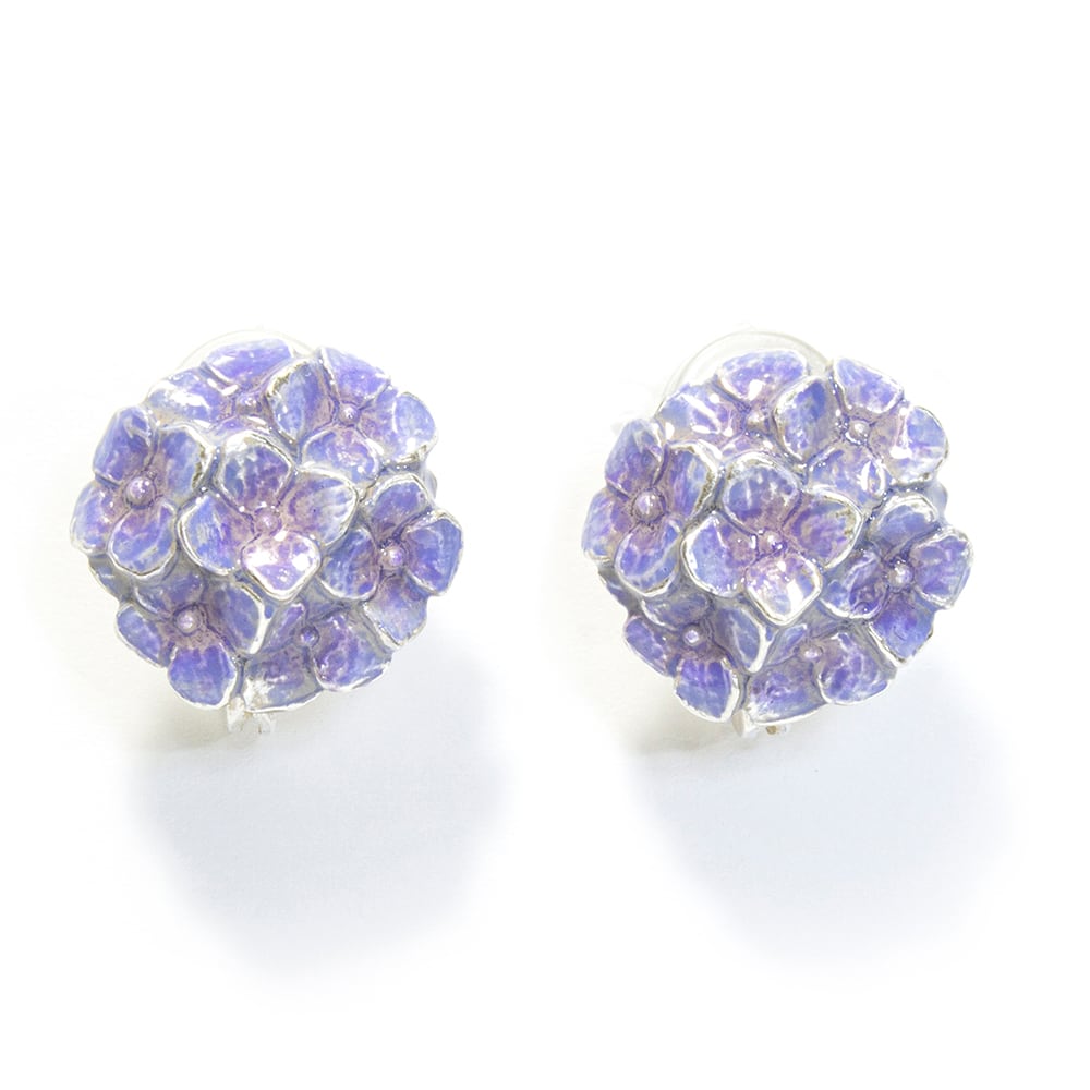 青と紫のグラデーションが美しい、紫陽花のイヤリング。鮮やかな紫色が上品さを演出し、小さいながら存在感があります。雨に打たれる紫陽花はますます色鮮やかになっていくようです。雨の日のお出かけも楽しくなりそうなアイテムです。花言葉は「辛抱強い愛情」。