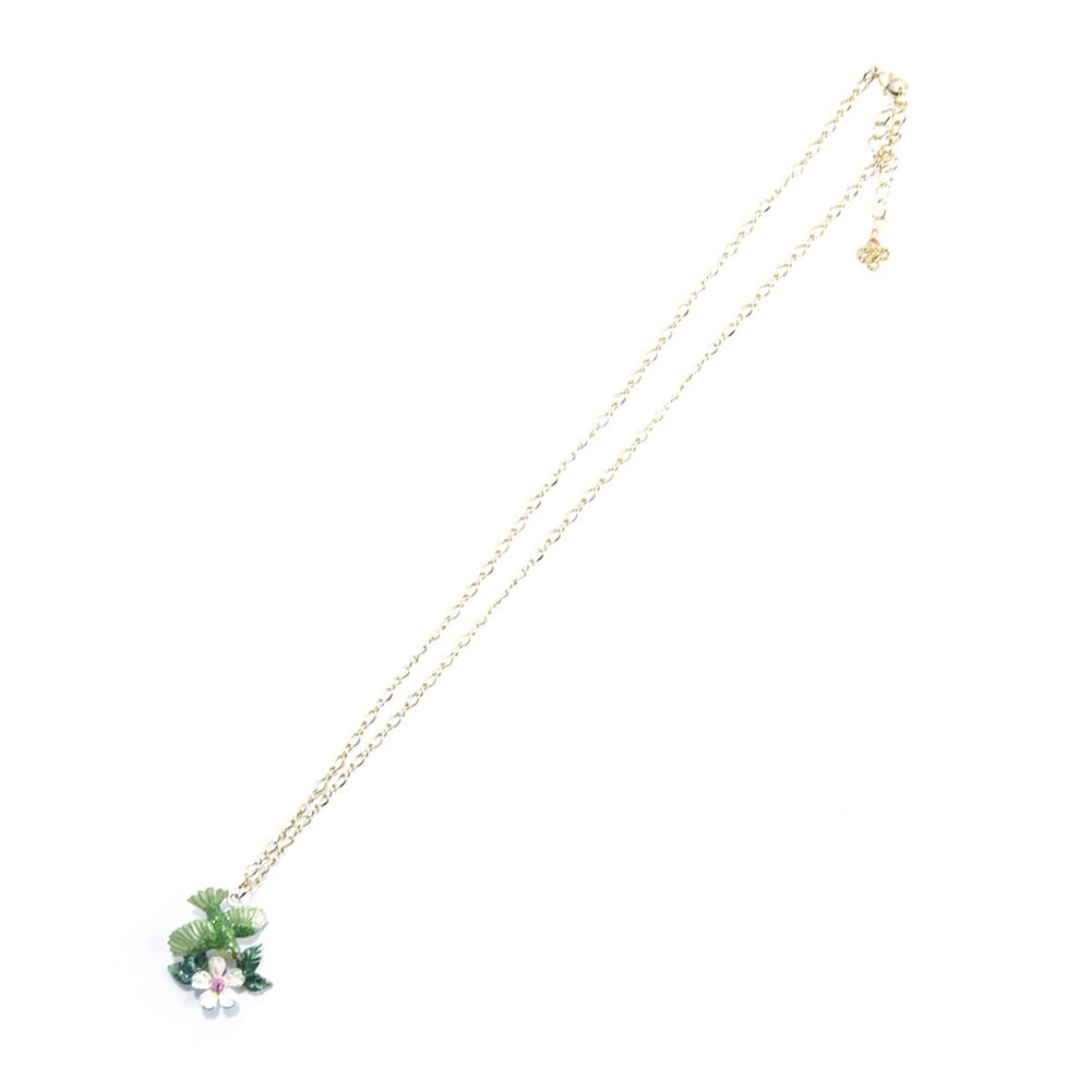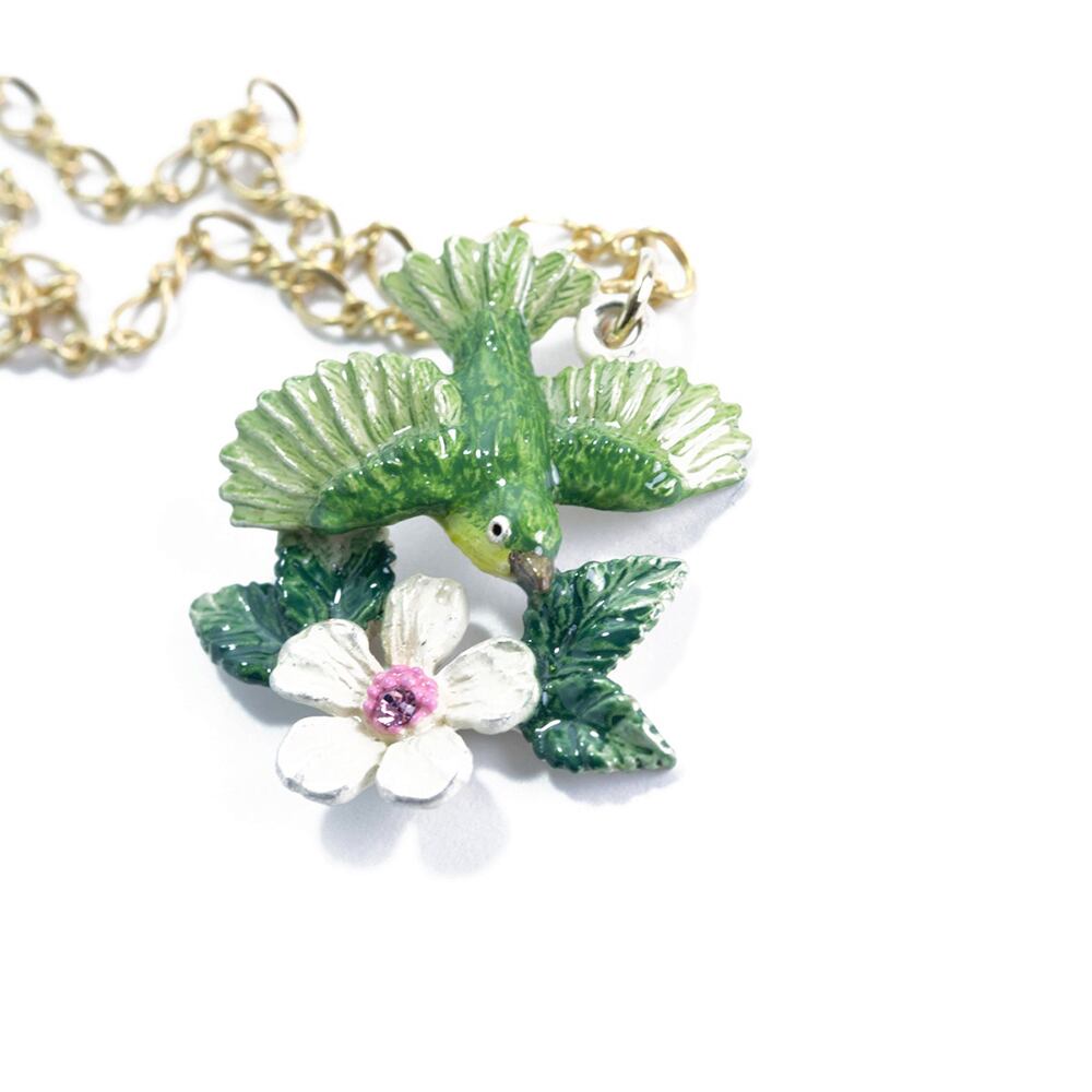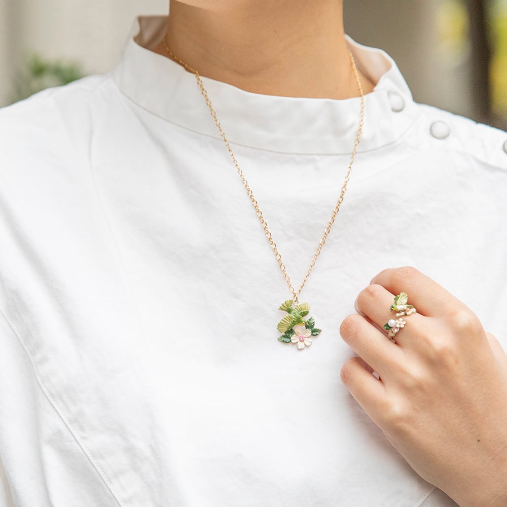 メジロがリンゴの花の蜜を吸いに飛んできた様子をイメージしたネックレス。花芯に光るラインストーンは甘い蜜のよう。