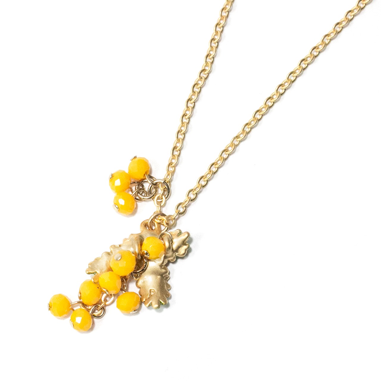 ミモザの花の重なりを再現したネックレス。ビーズで表現された丸い花がとてもキュート。奥行きのあるデザインになるよう、葉の上に花が重なるようにビーズを配置しています。他のミモザシリーズとは違う花の広がりをお楽しみください。ミモザの花言葉は「秘密の恋」「感受性」「思いやり」「友情」「優雅」