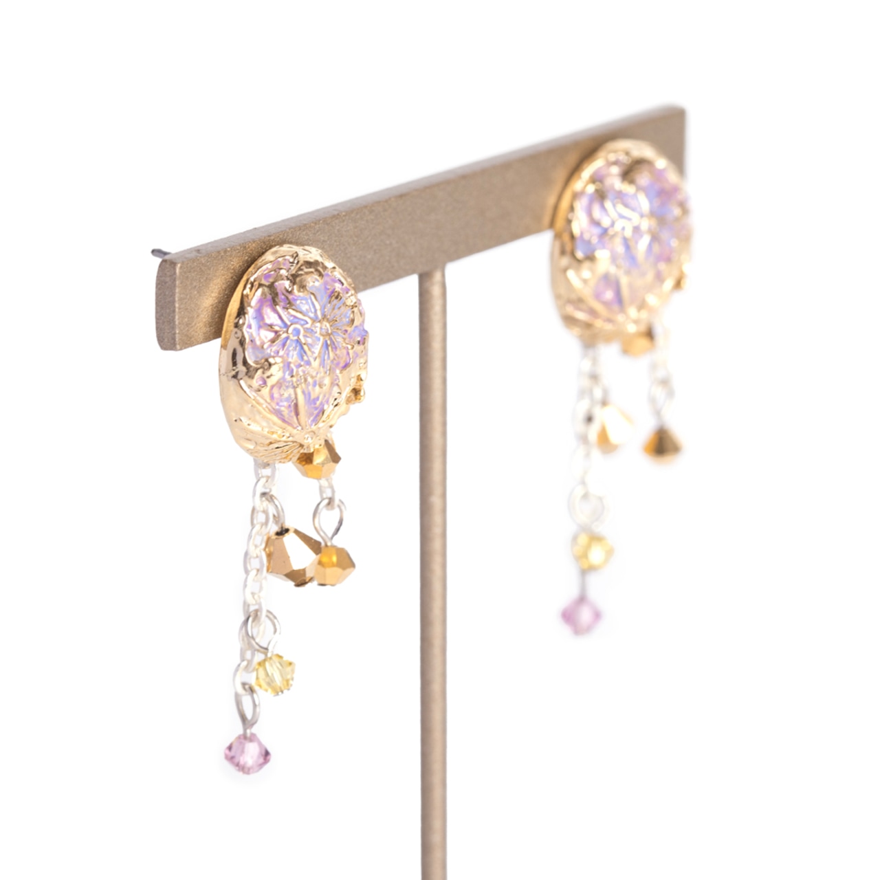 少しずつこぼれ落ちていくようにチェーンの先でゆらゆらと揺れるビーズは、月の一部であったことを主張するかのようにパープルやピンクに美しく輝いています。