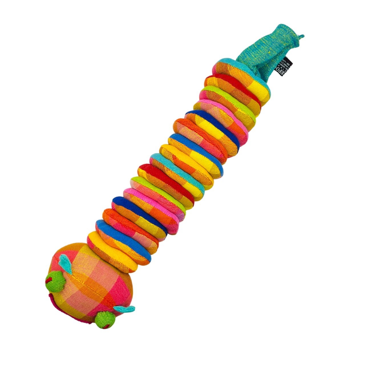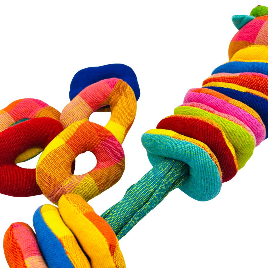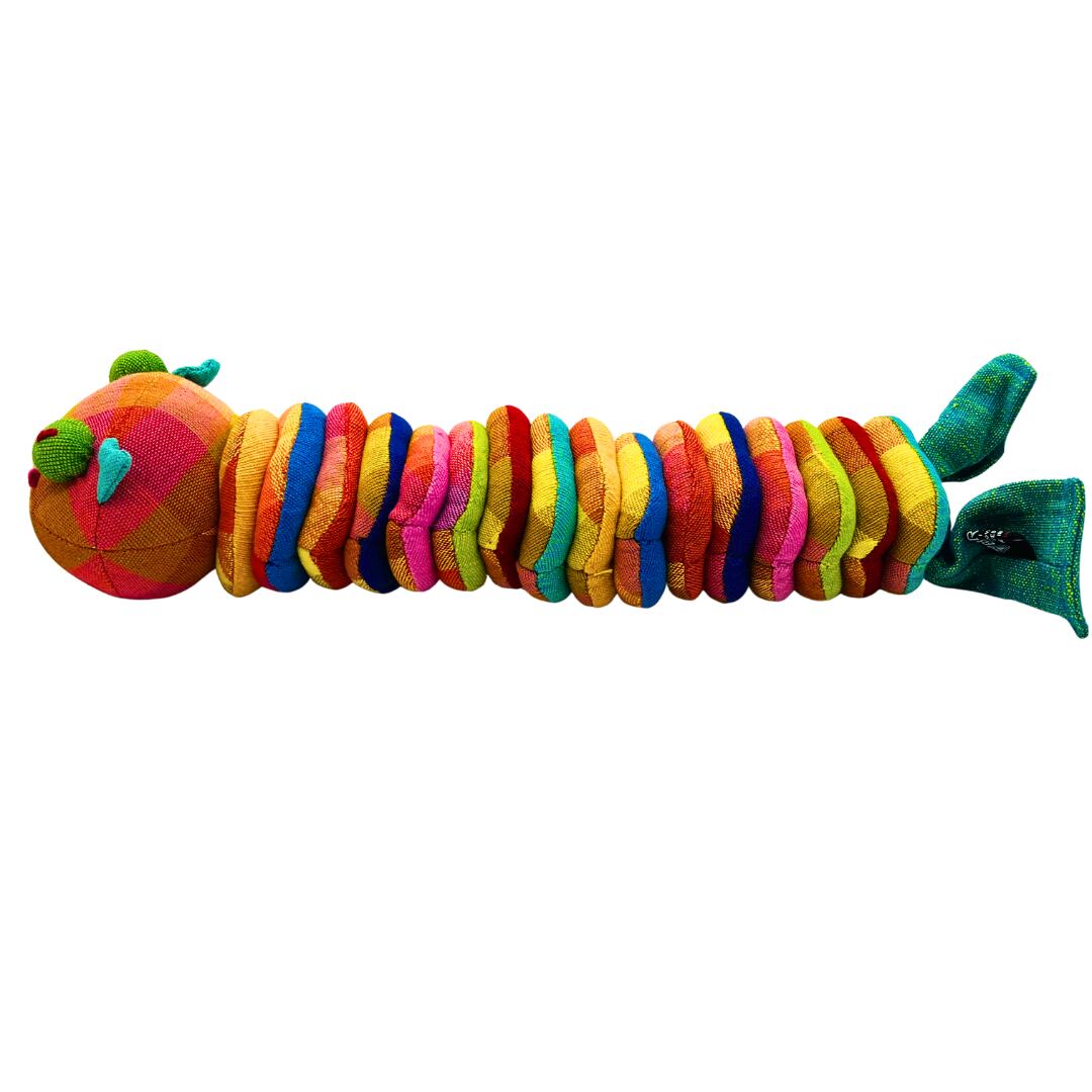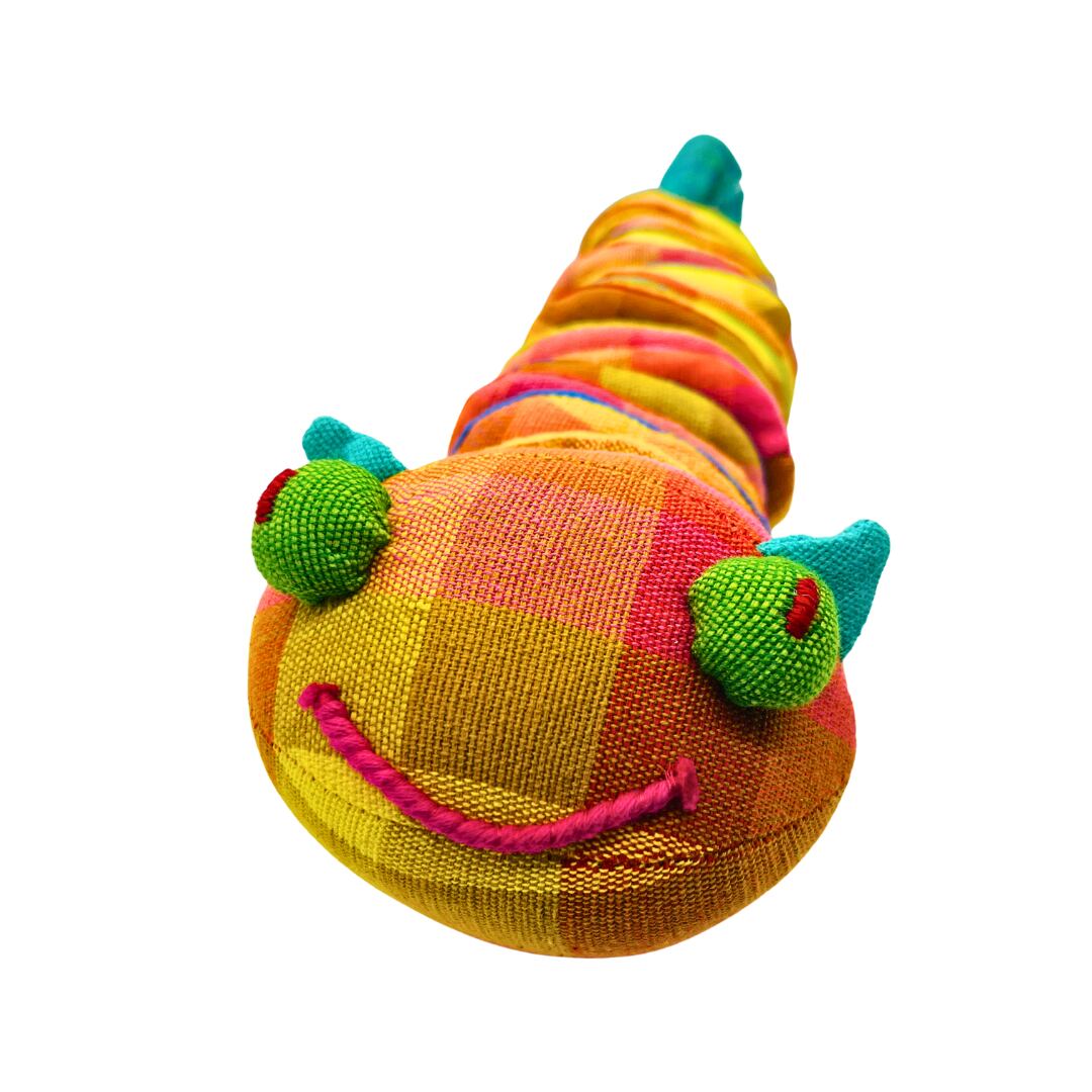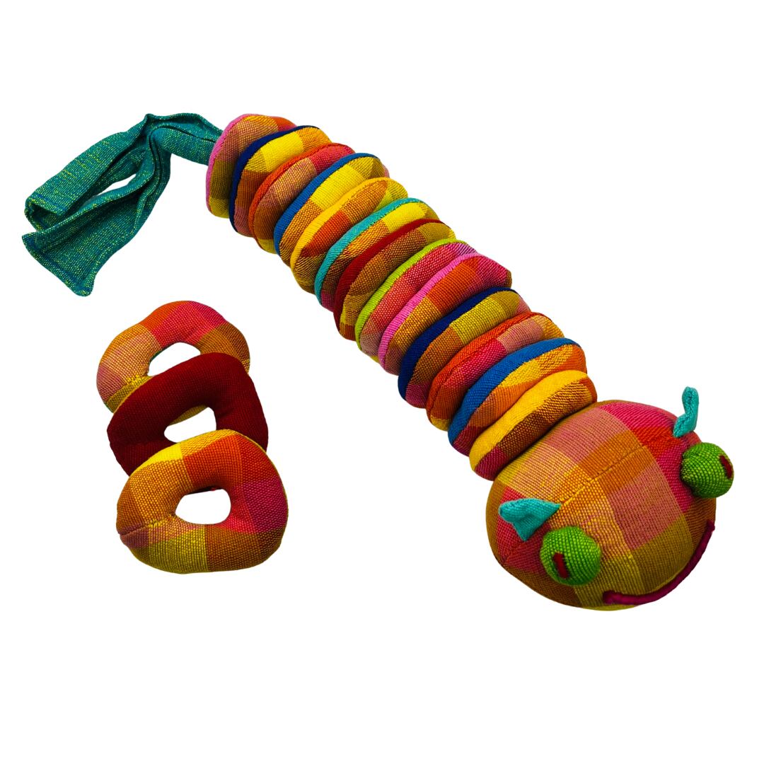 ドーナツのような輪っかがついたイモムシのぬいぐるみです。
