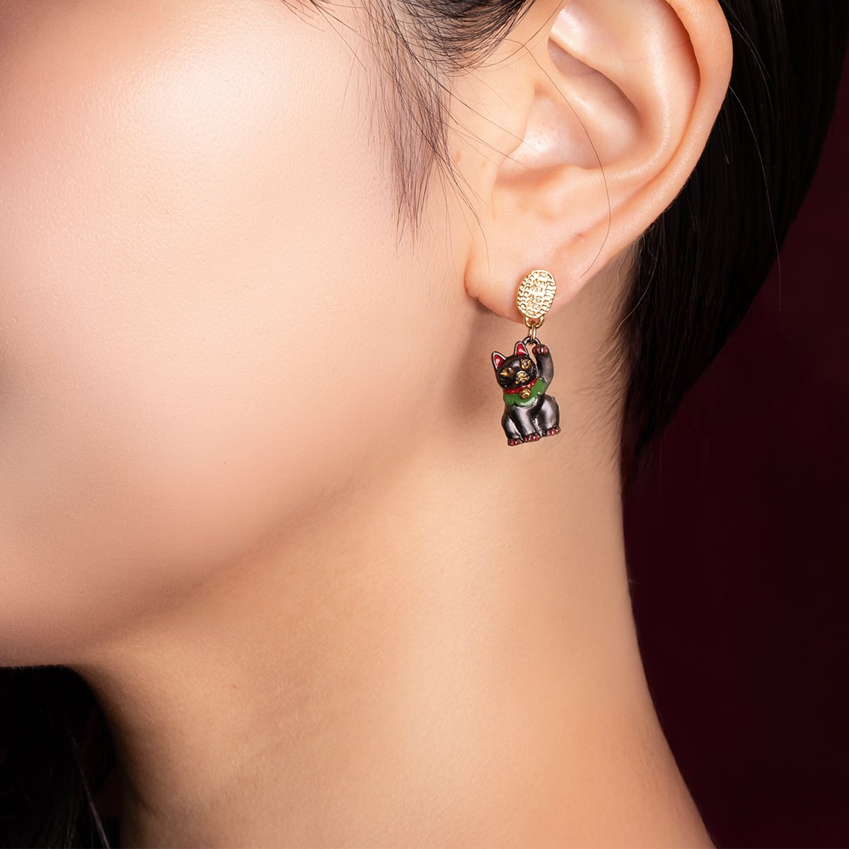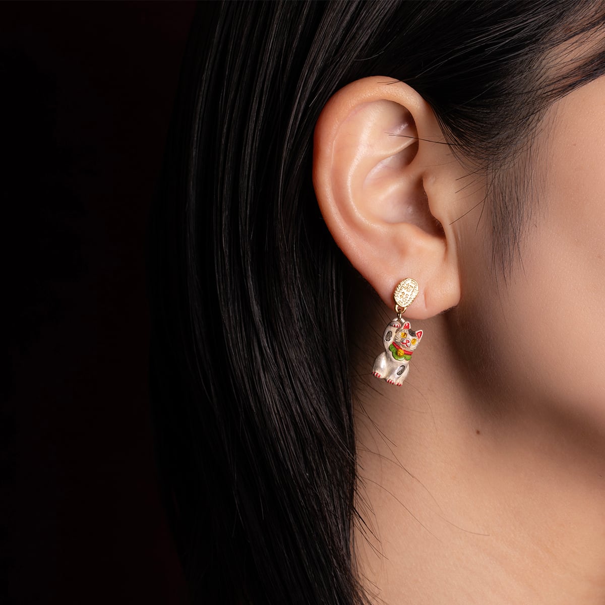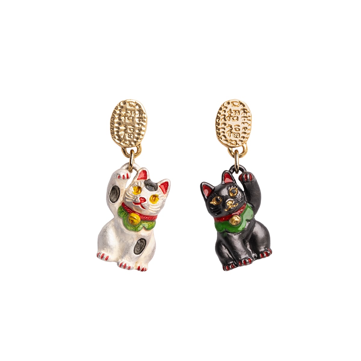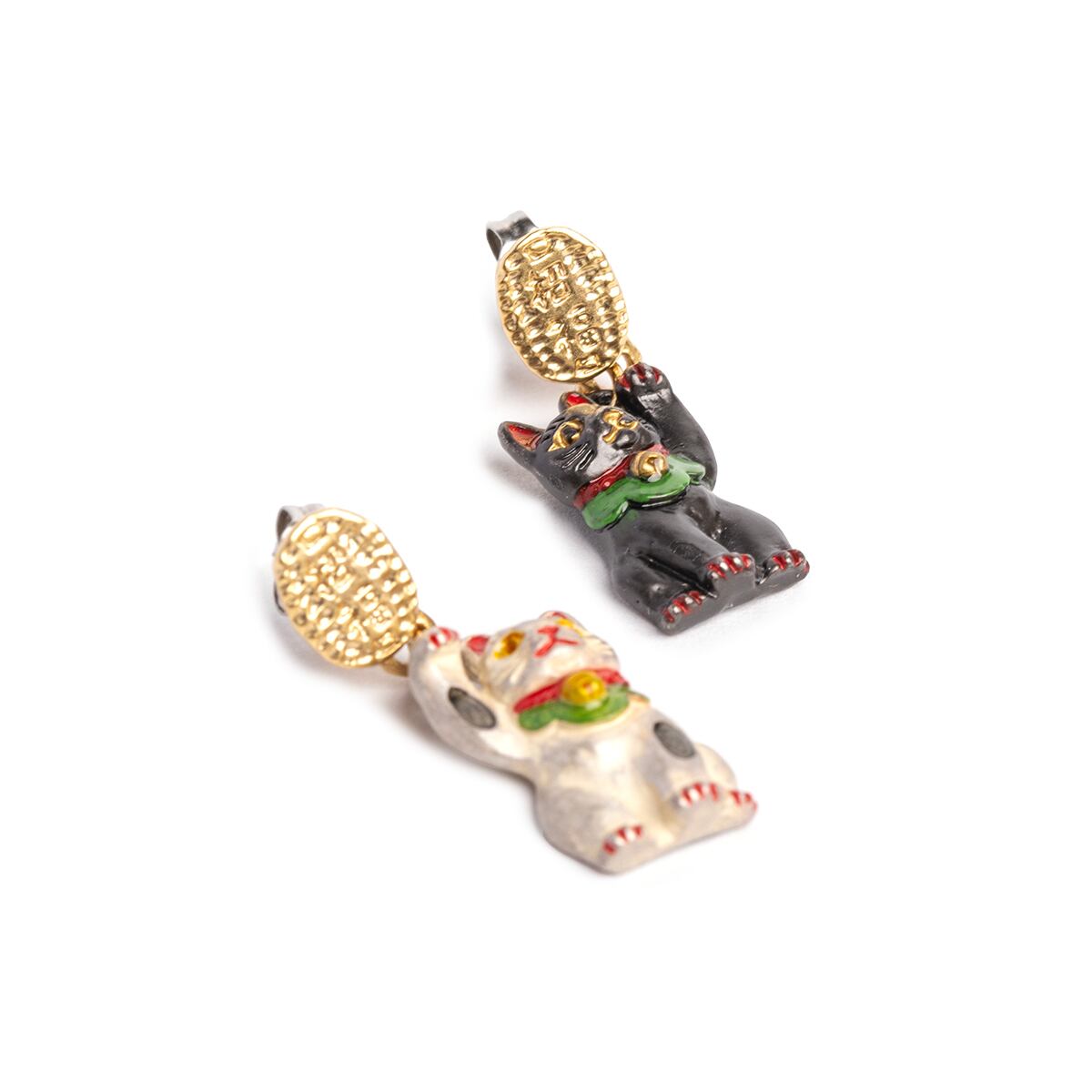 白と黒のまねきねこがデザインされたピアス。 縁起物とされる招福小判がキラリと輝き、小判から下がる猫がゆらゆらと揺れる、動きのあるユニークなデザインです。 片方の前足を上げて小判にちょっかいを出そうとする姿は、まるで福を招いているよう。 まねきねこは色によって意味が異なり、白が「開運招福」、黒が「厄除け」を表します。 耳や爪の赤色や、鈴や目のゴールドなどは、白猫・黒猫それぞれに合わせて色合いを調整し、丁寧に着色したこだわりのアイテムです。