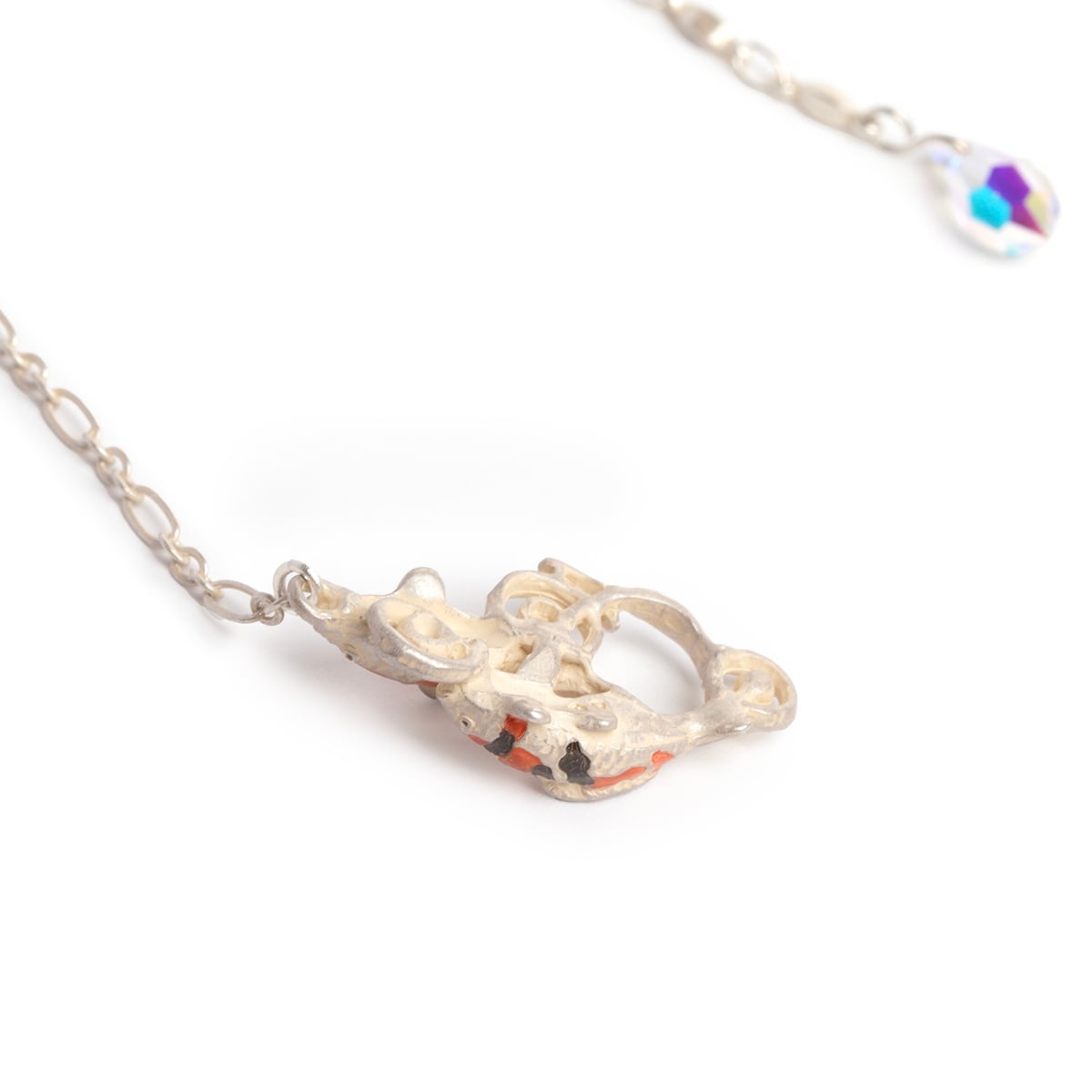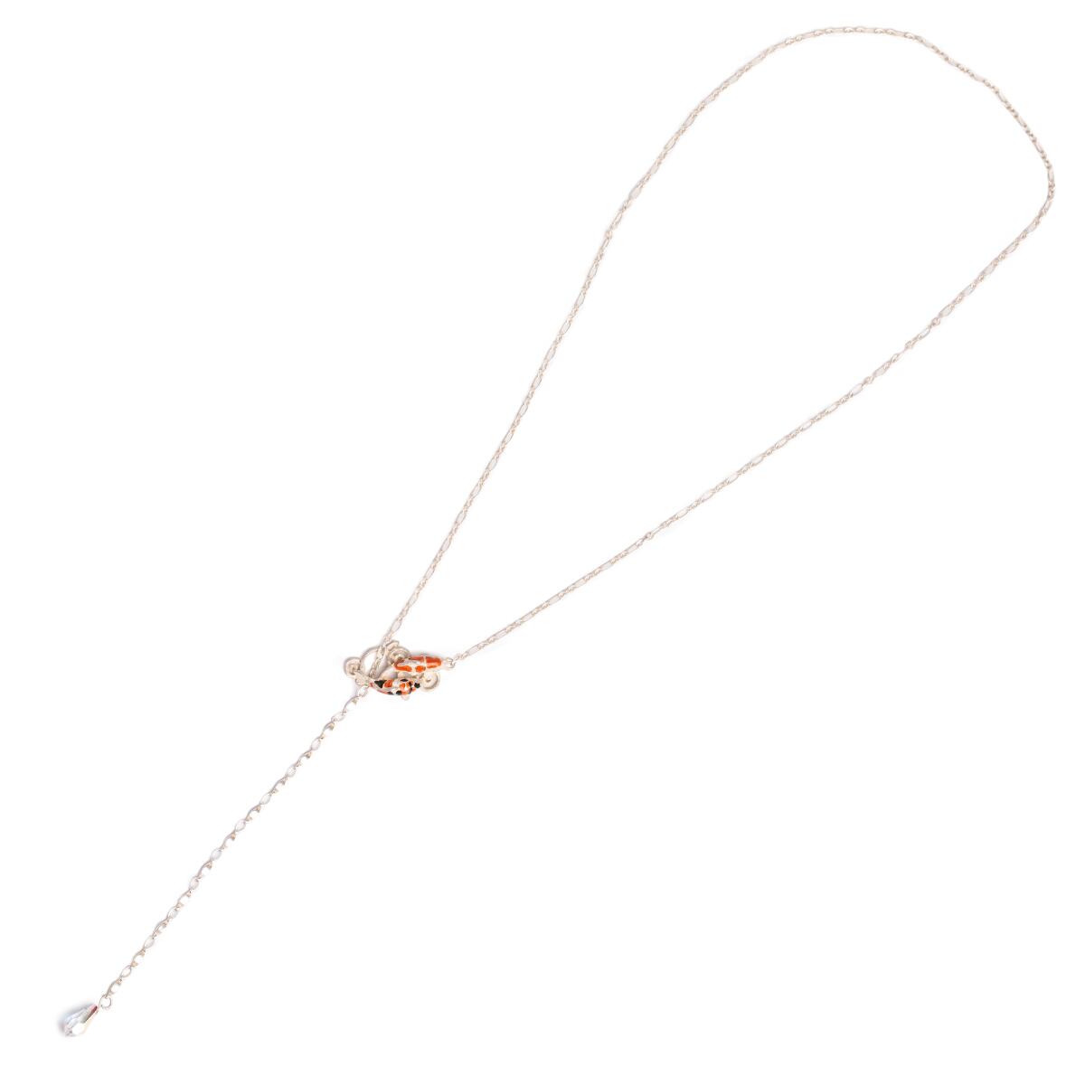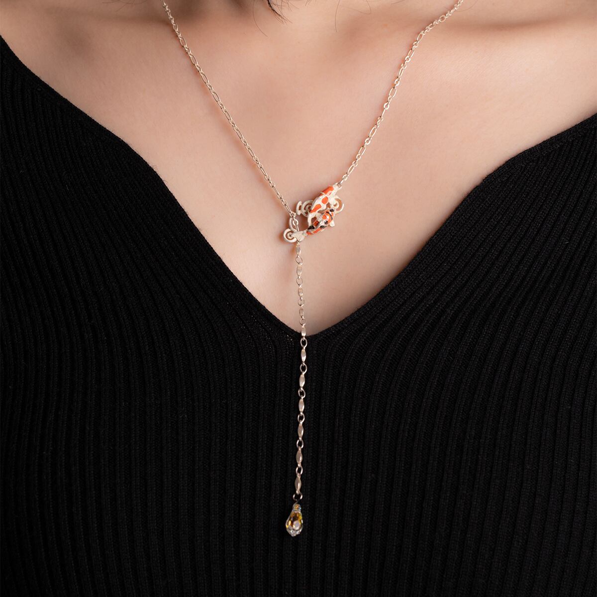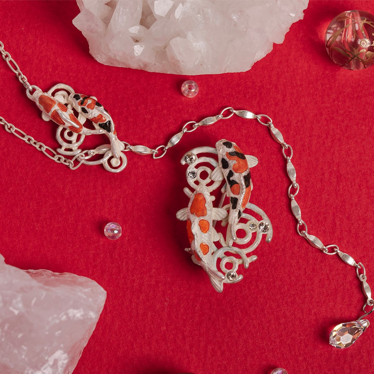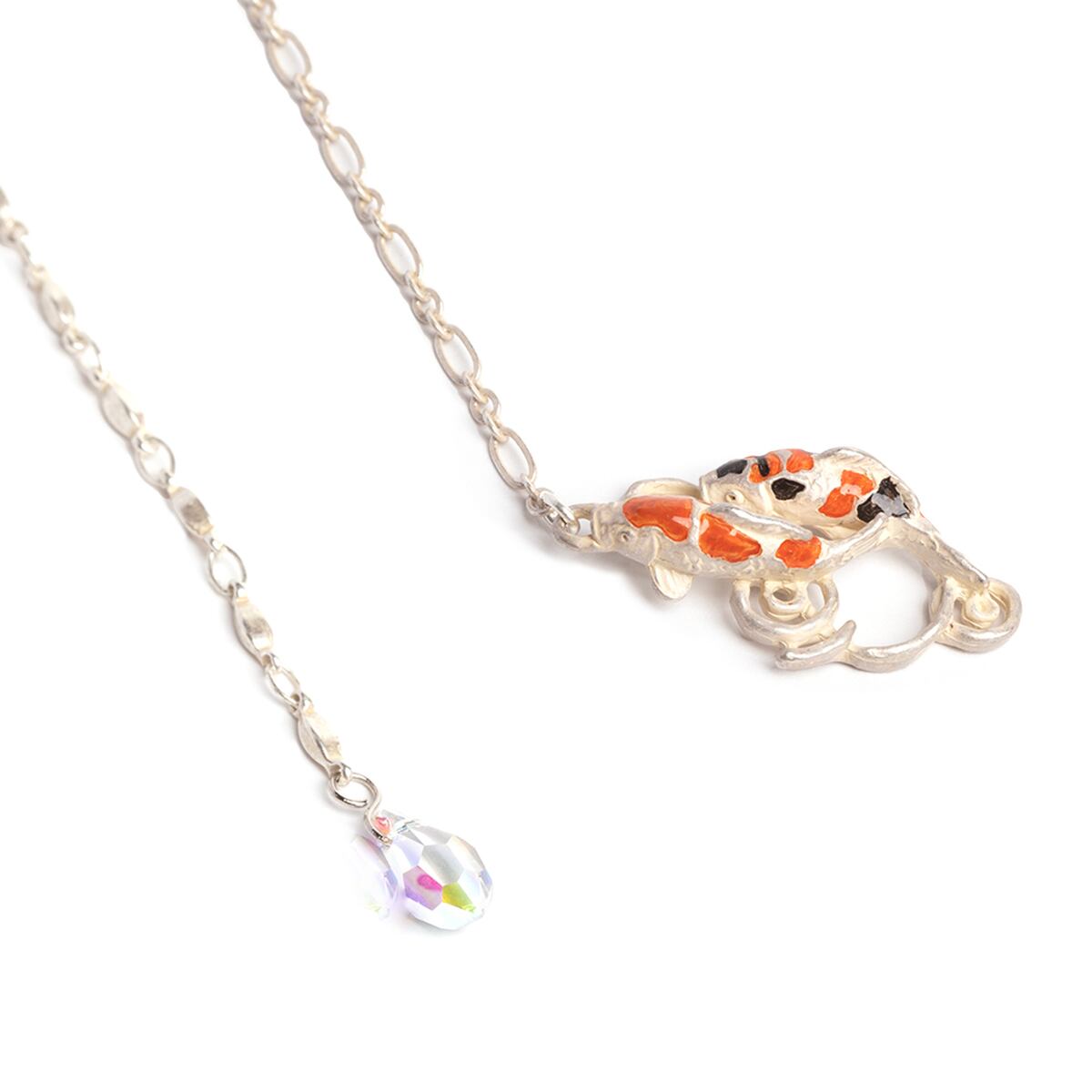水の中を優雅に泳ぐ錦鯉がデザインされたラリエットタイプのネックレス。 立体的な造形が美しい錦鯉と、静かにゆらめく水面を文様のような水紋で表現した、魅力的なアクセサリーです。 チェーンは2種類使用し、切り替え部分を目安に着用していただくと美しさが際立ちます。 切り替え部分から下のチェーンは、水の流れをイメージした輝きの美しいものを採用。チェーンの先では透き通った水をイメージしたカットガラスが揺れ、キラキラと輝きます。 カットガラスにはオーロラ調の加工が施され、角度によって色とりどりの輝きを見せる繊細な華やかさも魅力の一つです。