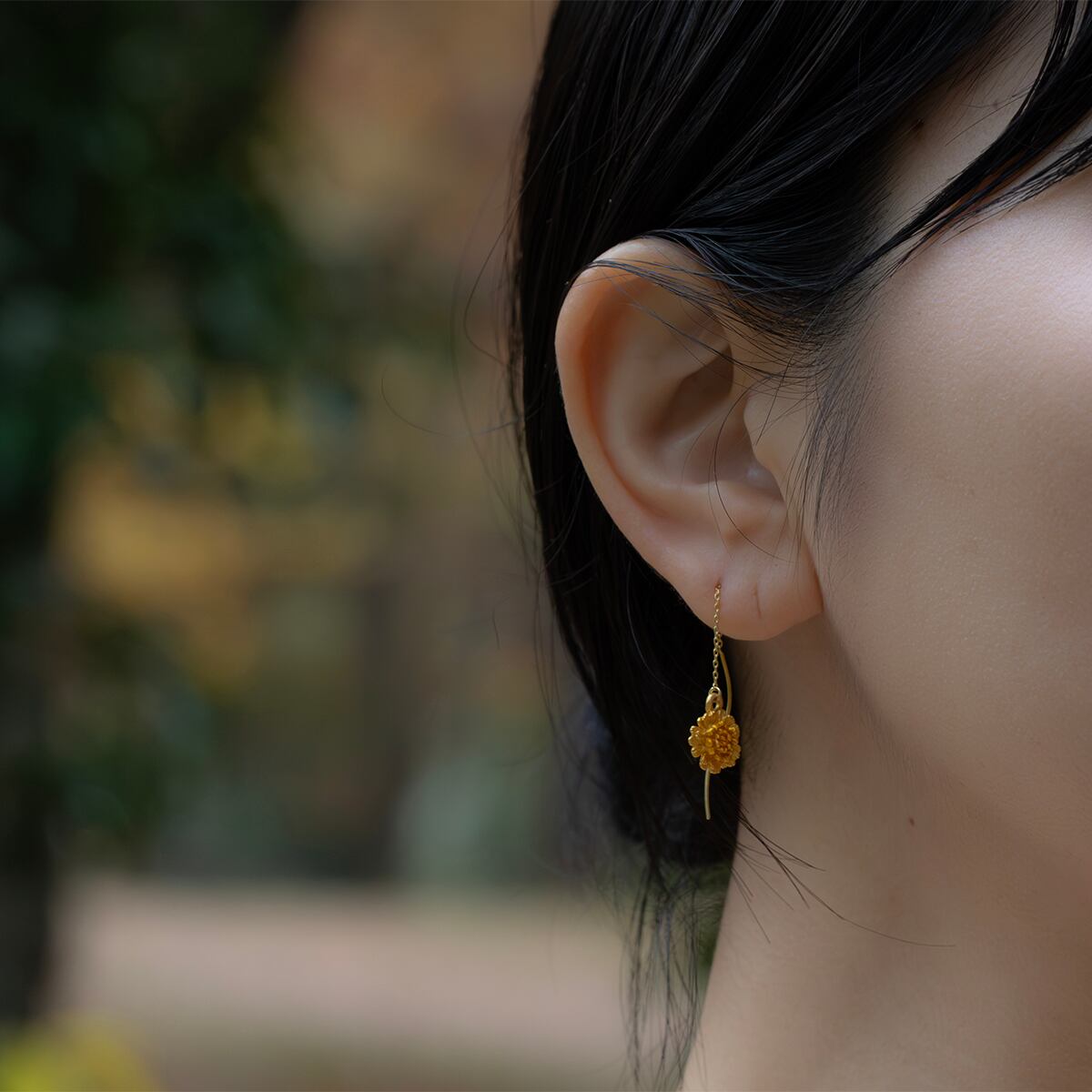 華奢なデザインながら、垂れ下がるチェーンがアクセントとなり、シンプルな装いでも耳元に印象的な表情を添えます。