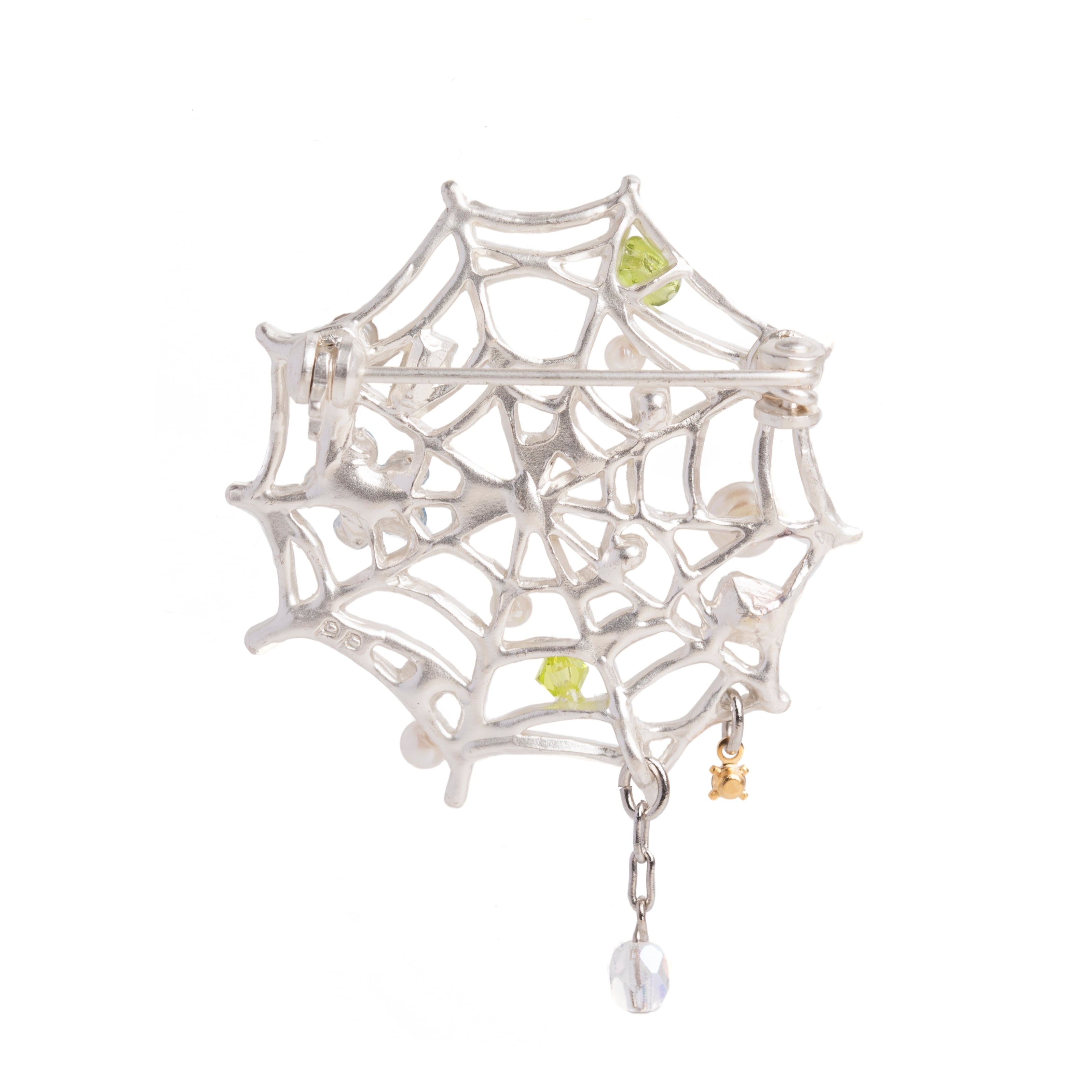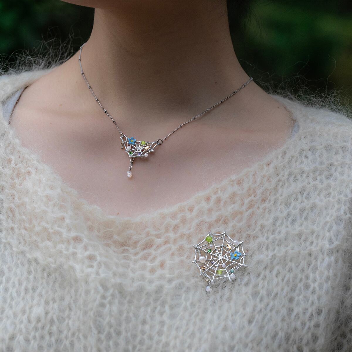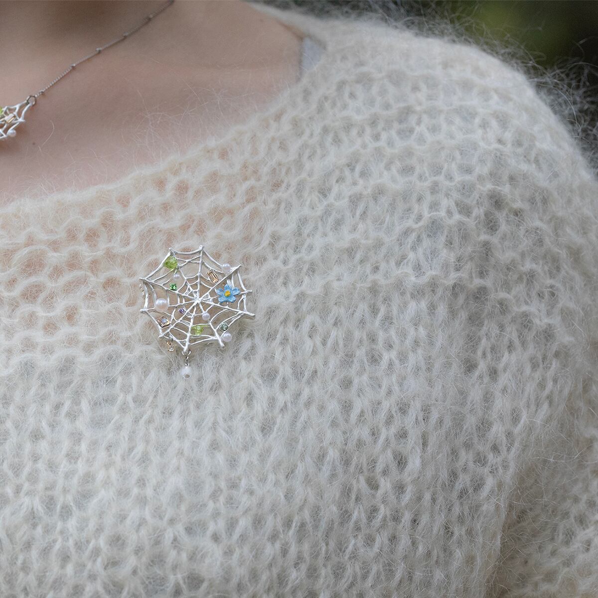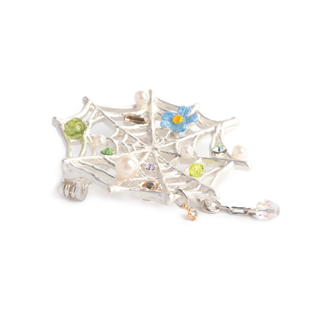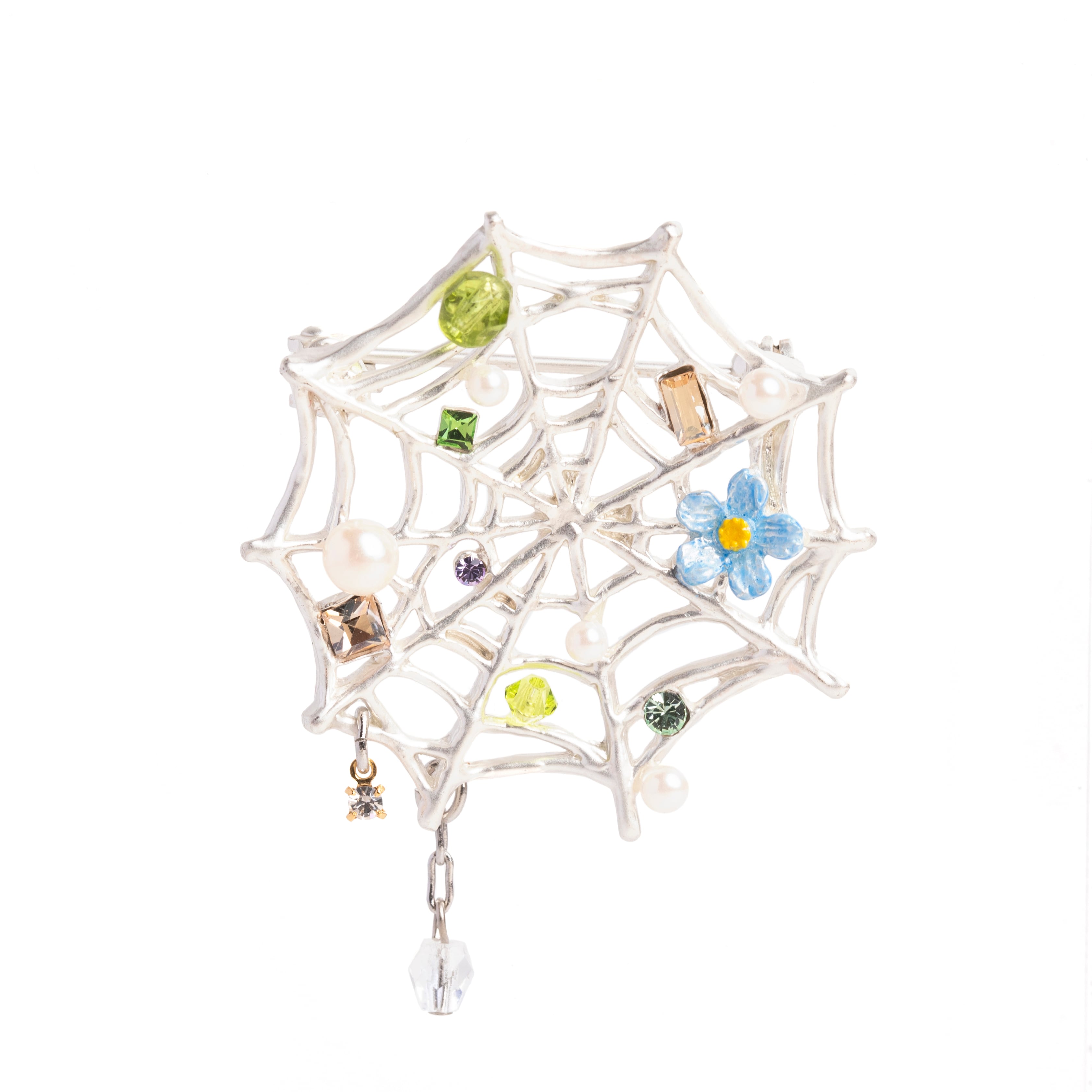 華やかに飾り付けられた、くもの巣をモチーフにしたブローチ。 透かし模様で軽やかに表現されたくもの巣には、雨上がりに水滴がきらめく情景をイメージし、カットガラスやパールをあしらっています。 緑、薄紫、薄橙のカットガラスが光を受けて輝き、自然豊かな庭の一場面を思わせます。 一輪のワスレナグサが水滴に混じってくもの巣にかかり、可憐な印象を添えています。 切れたくもの糸をイメージした垂れ下がるクリアビーズは、動きに合わせて静かに揺れ、やわらかな光を反射します。