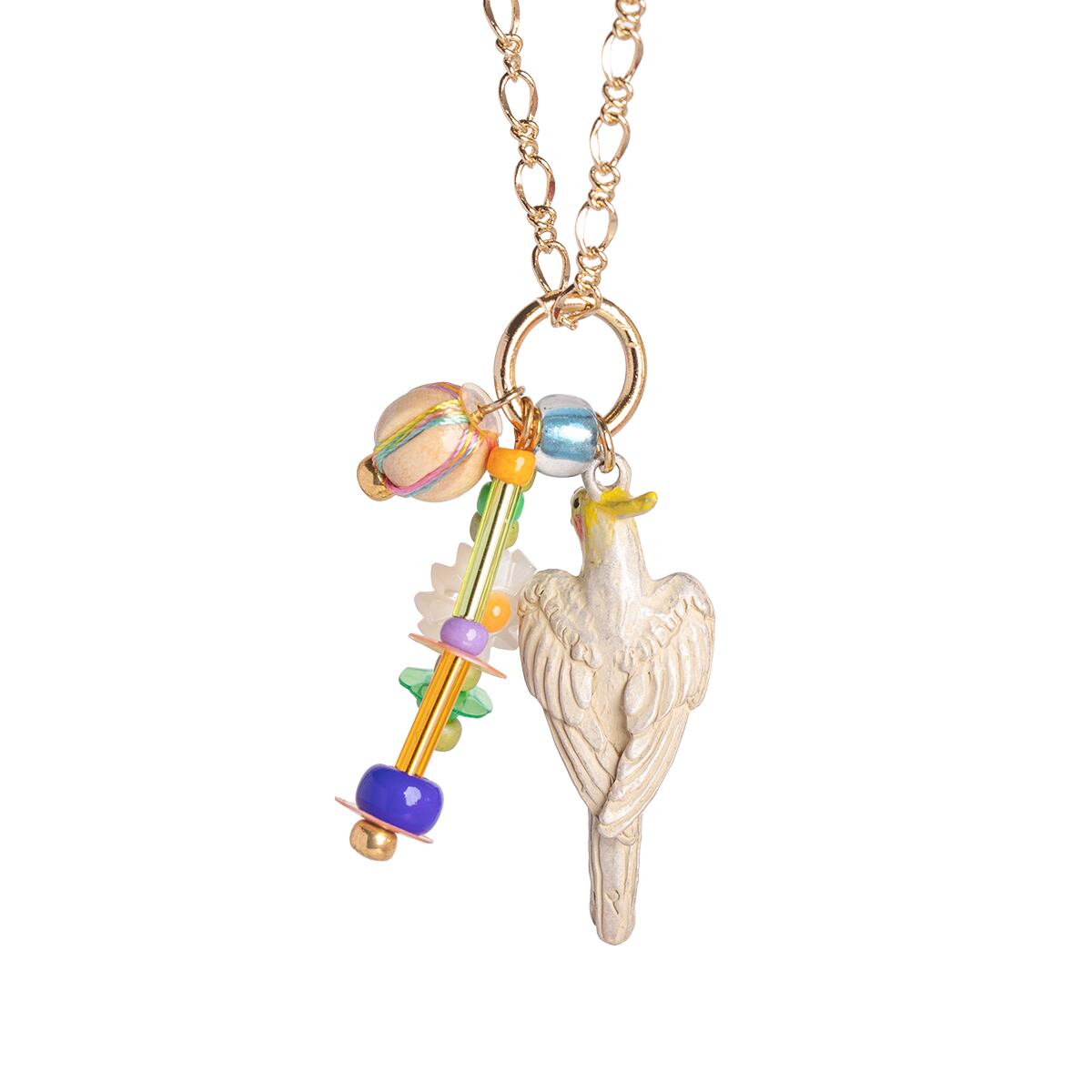 歌をうたいながら求愛するオカメインコをモチーフにしたネックレス。 ベージュのビーズは、カラフルなおもちゃを思わせるパステルカラーの糸で飾り、可愛らしさを際立たせています。
