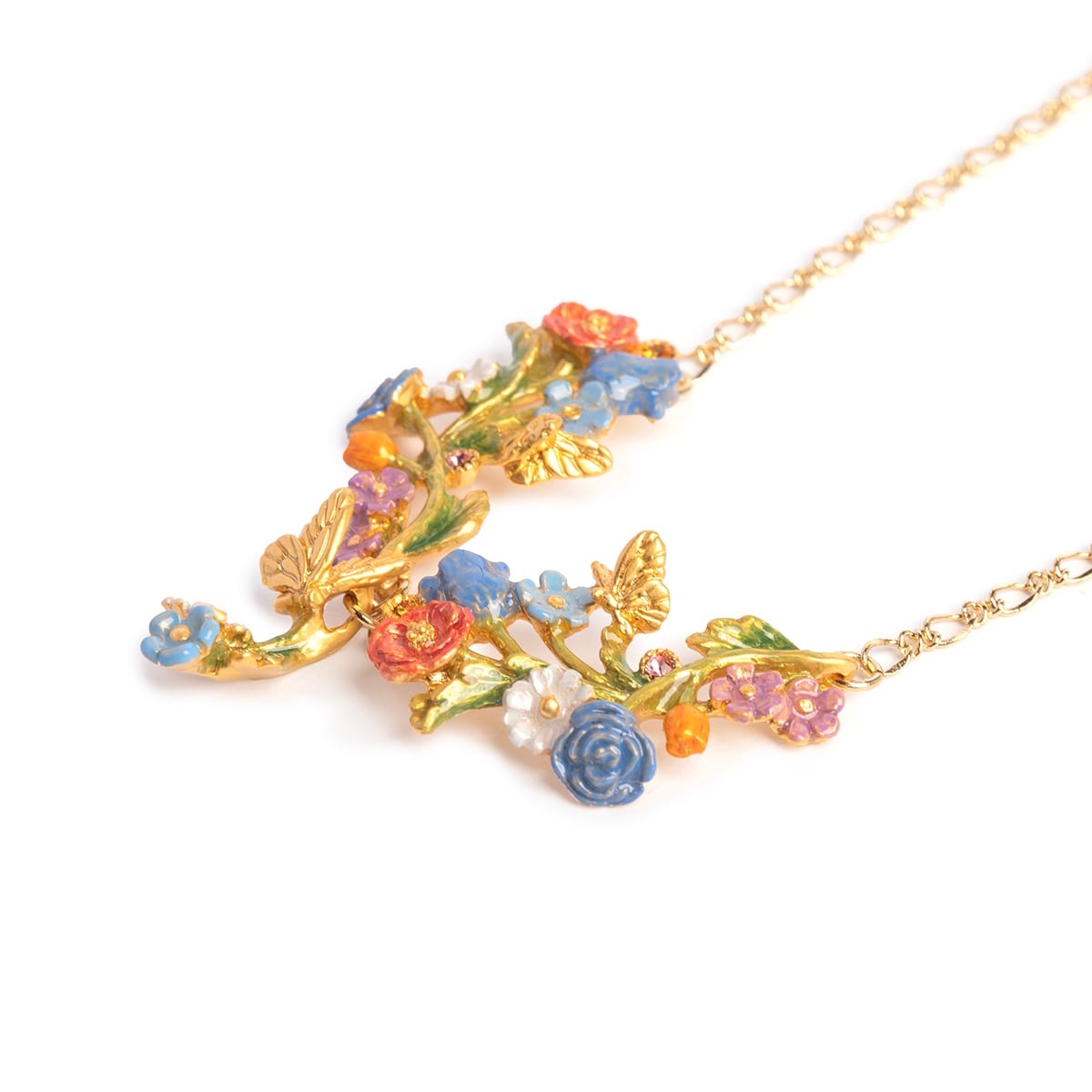 香りに誘われて蝶が舞う、色とりどりの花々が咲き誇る庭の情景を閉じ込めたようなネックレス。