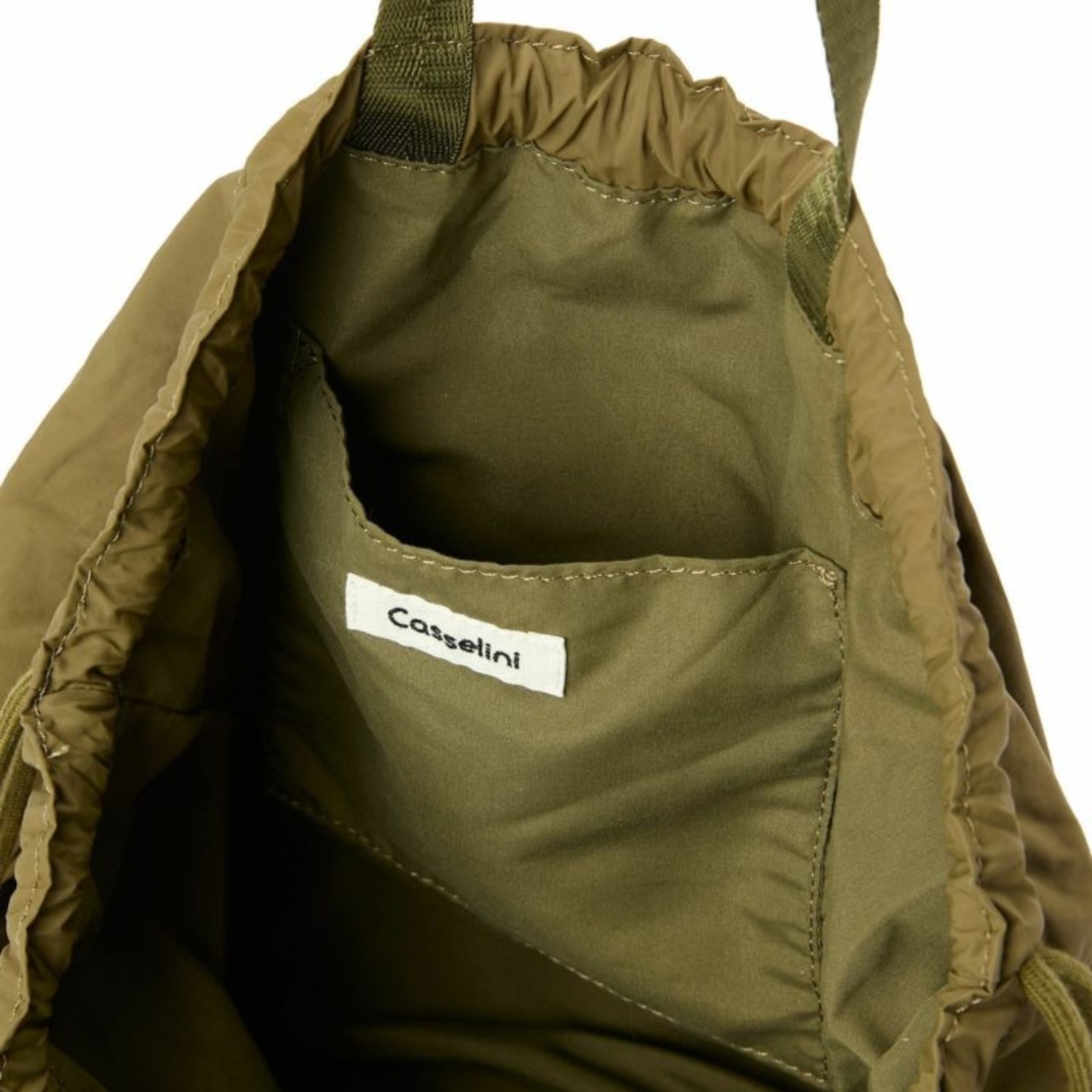 本体はナイロン素材、ポケットにはメッシュを使用したドローストリング仕様で抜け感のあるデザインに仕上げました。肩掛けはもちろん、手持ちでも使える2WAY仕様。