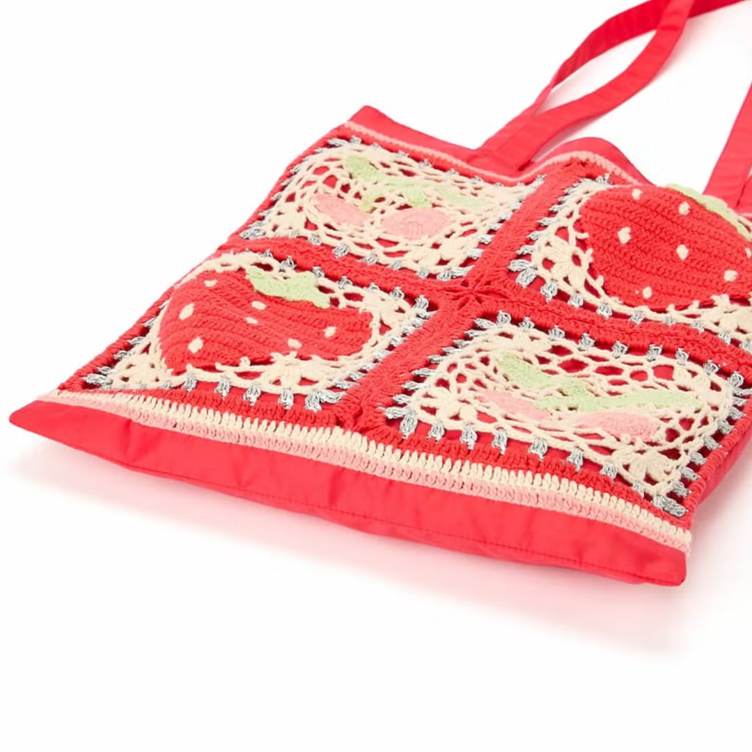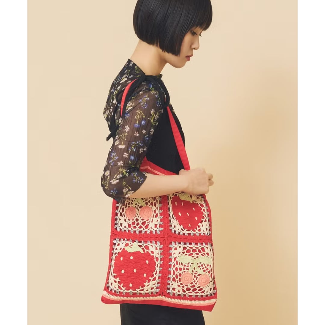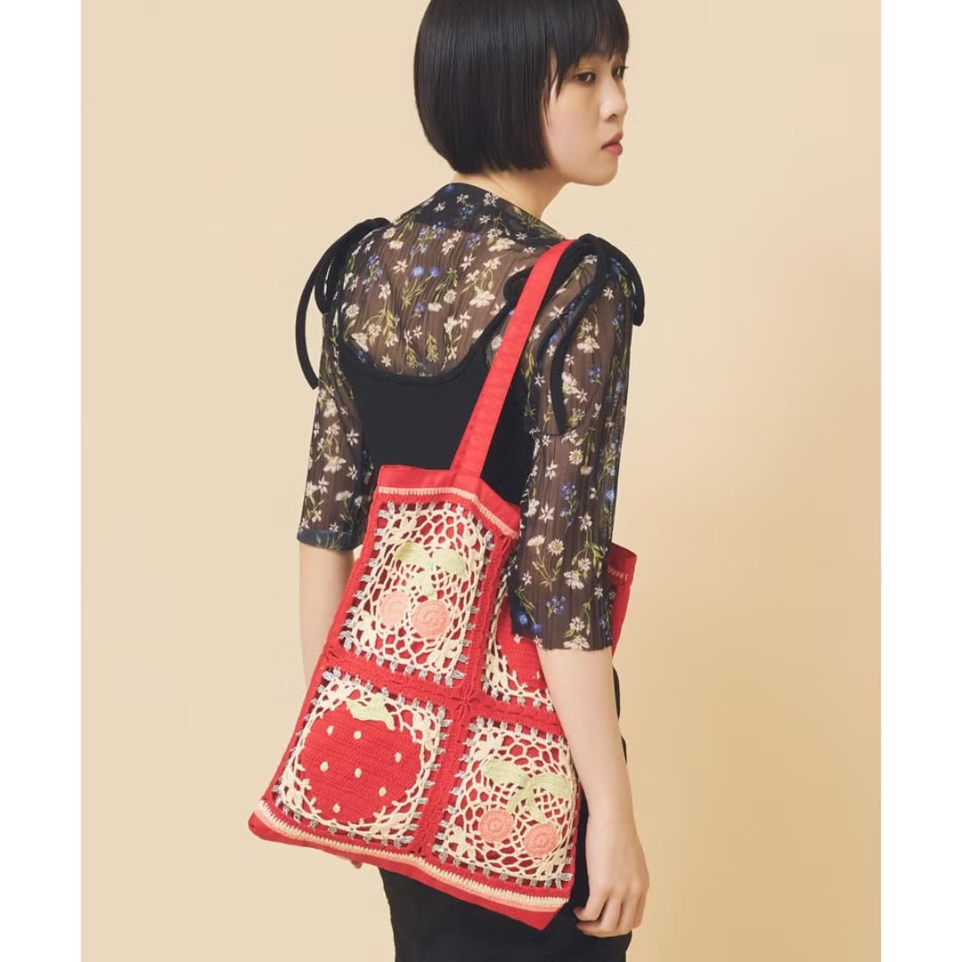 それぞれモチーフの異なるデザインで展開された手編みのトートバッグ。