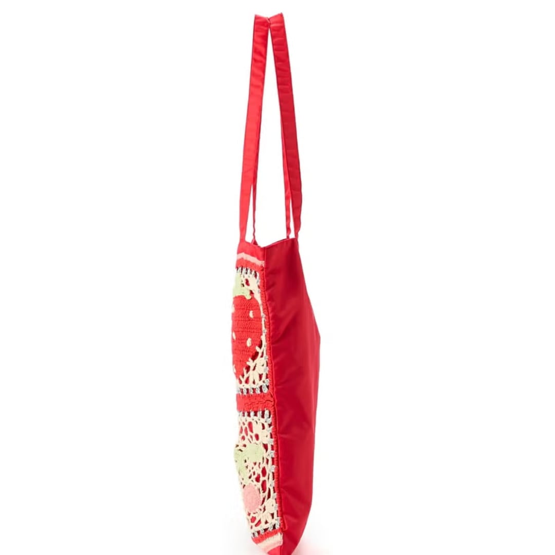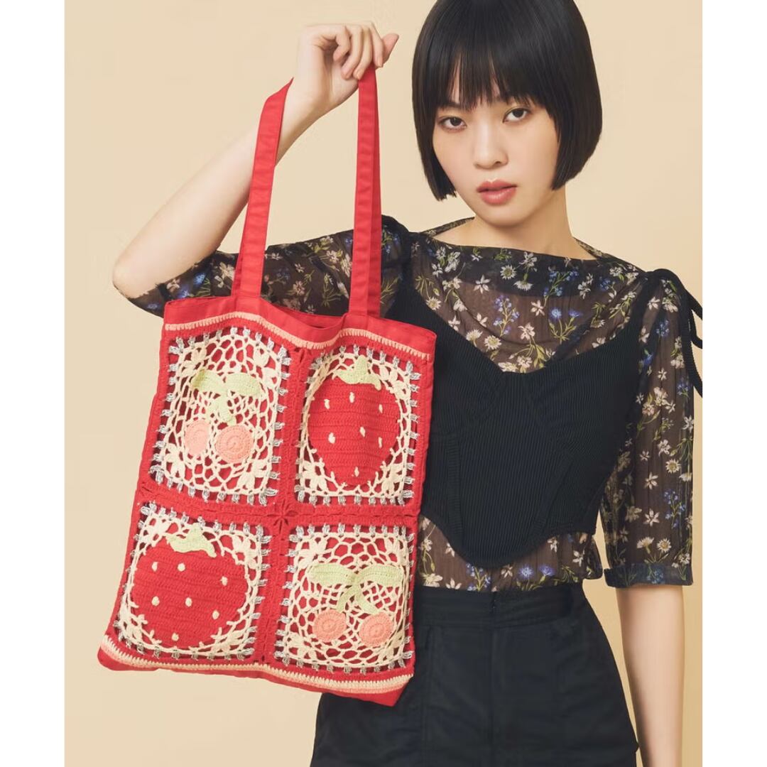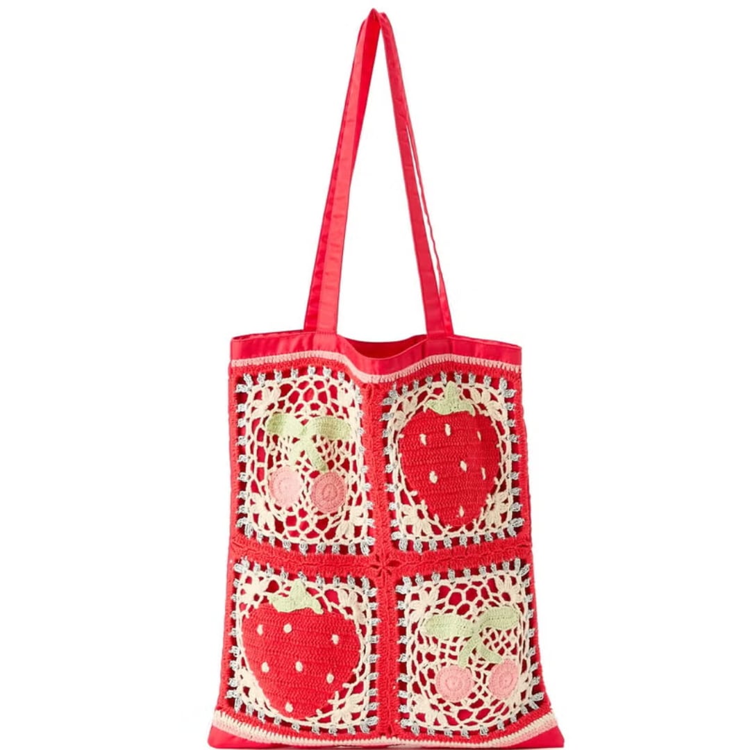 それぞれモチーフの異なるデザインで展開された手編みのトートバッグ。