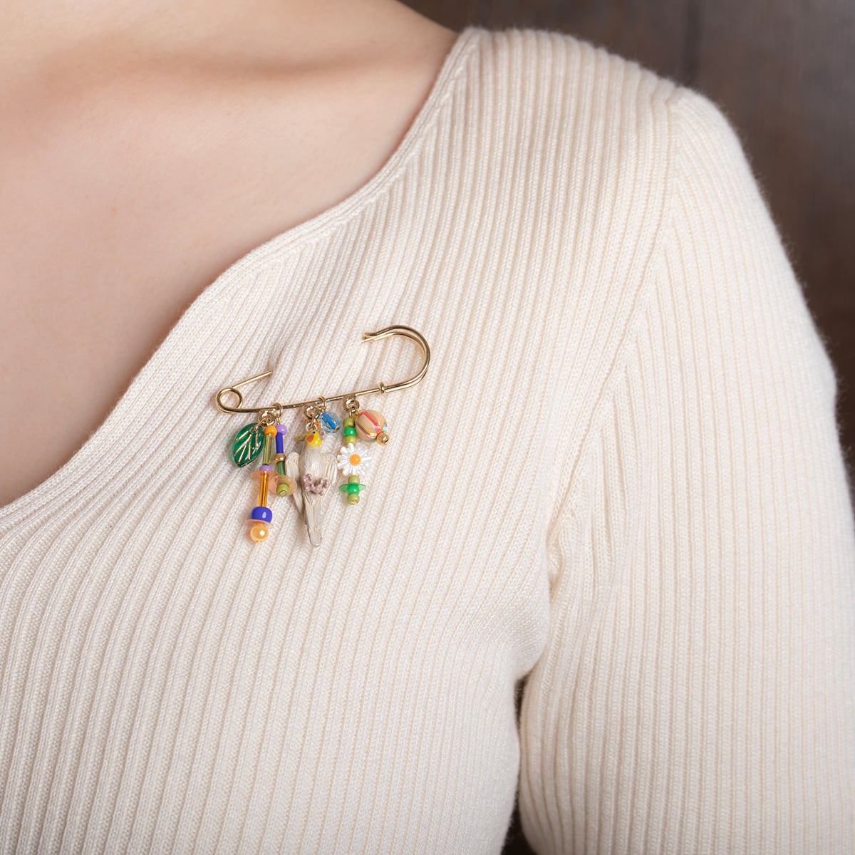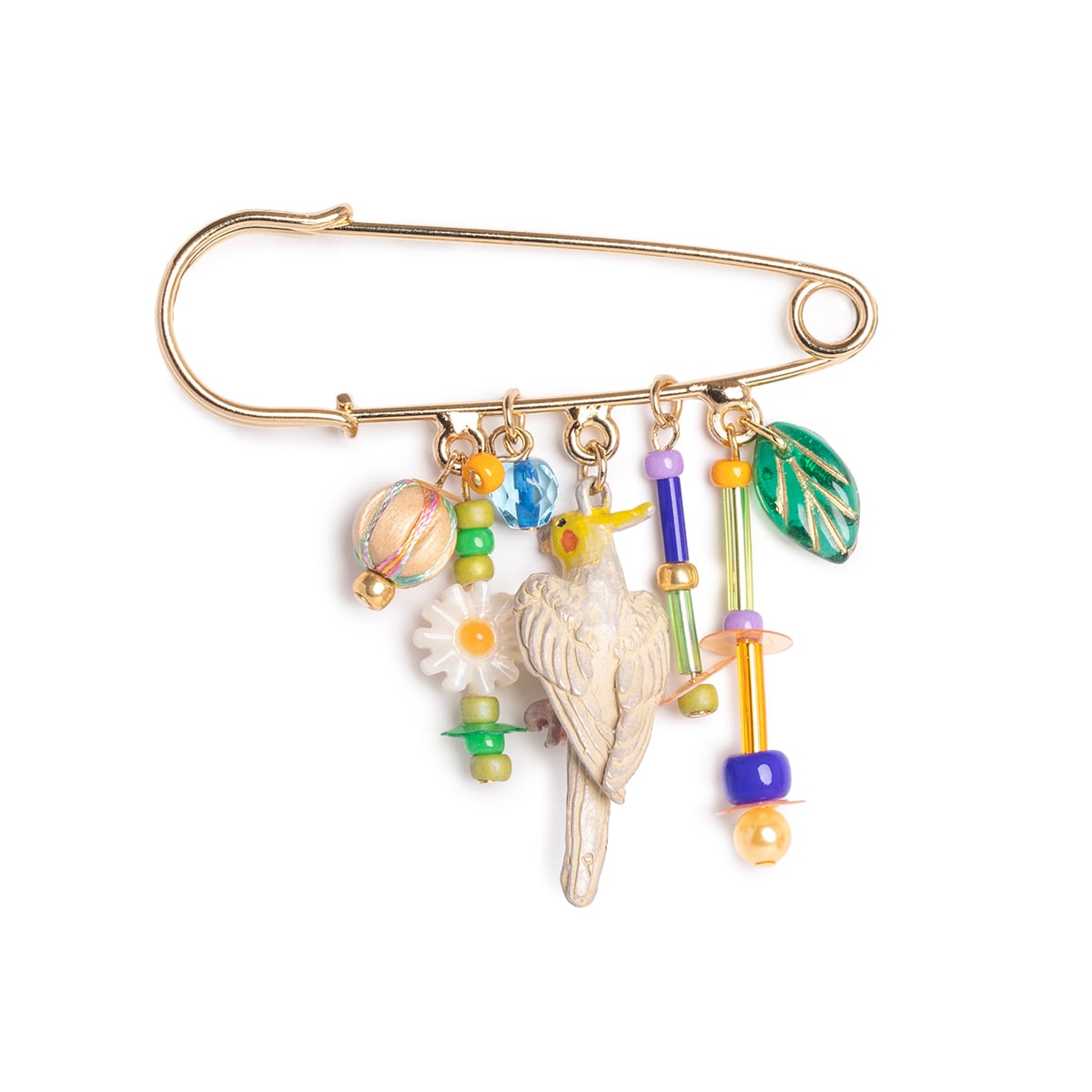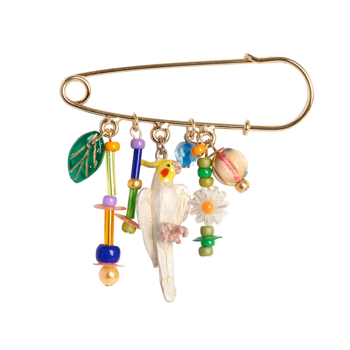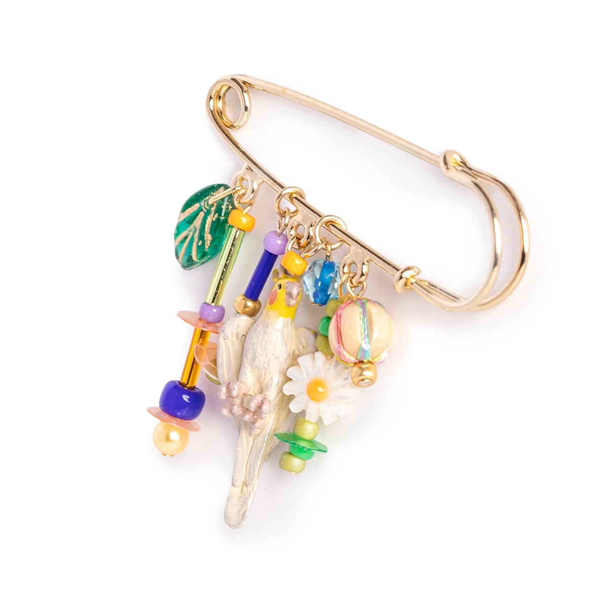オカメインコの求愛の歌をイメージして、色や形の異なるビーズやスパンコールを散りばめ、賑やかで楽しい雰囲気をプラスしました。 さらに、マーガレットのような白い花形ビーズや葉っぱのビーズを加えることで、レトロポップでハッピーな印象に仕上げています。