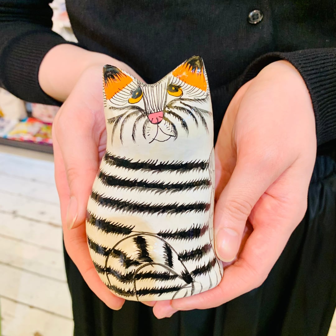 しましま模様のネコの置物です。デスク横に追いたり、ネコ好きの方へのギフトにも。