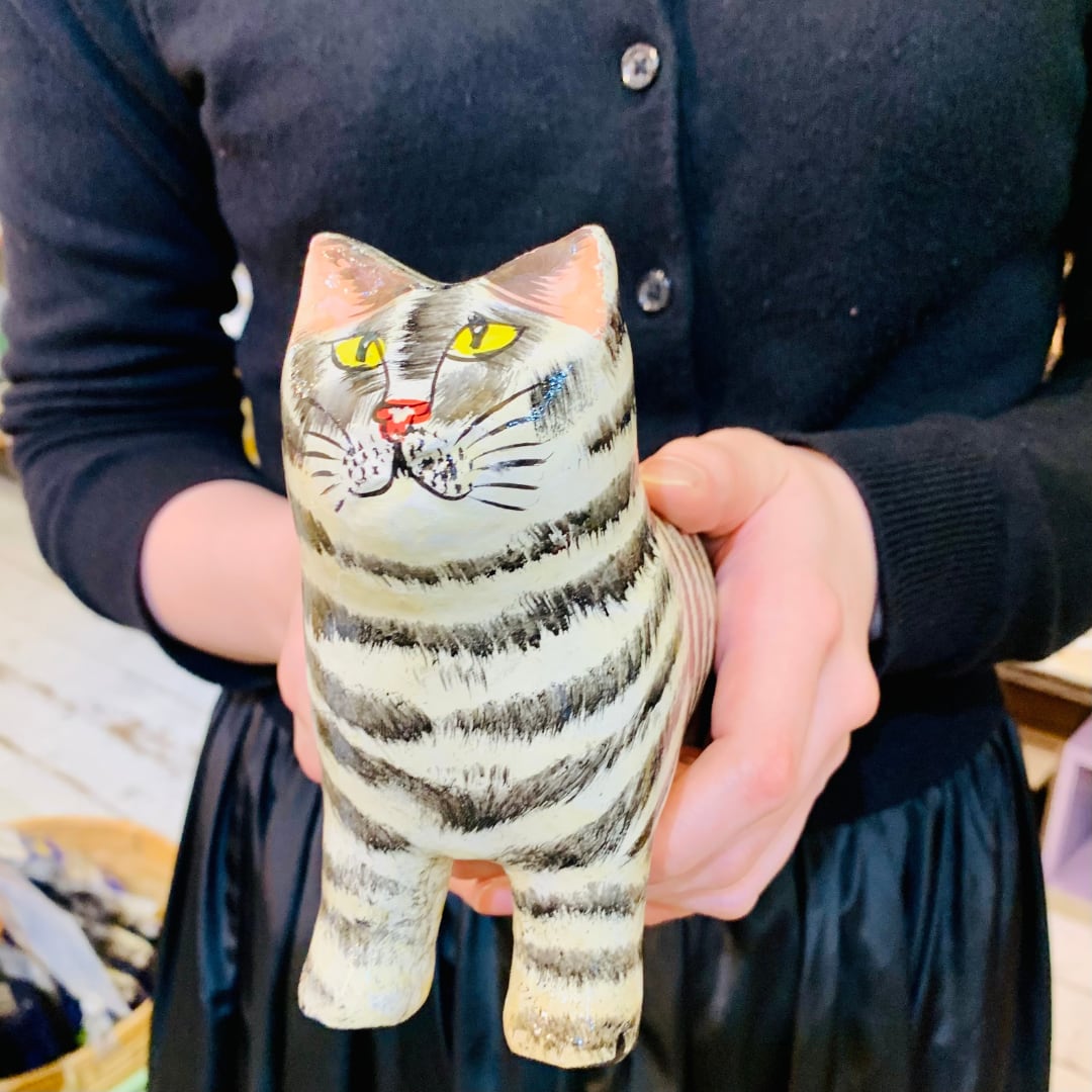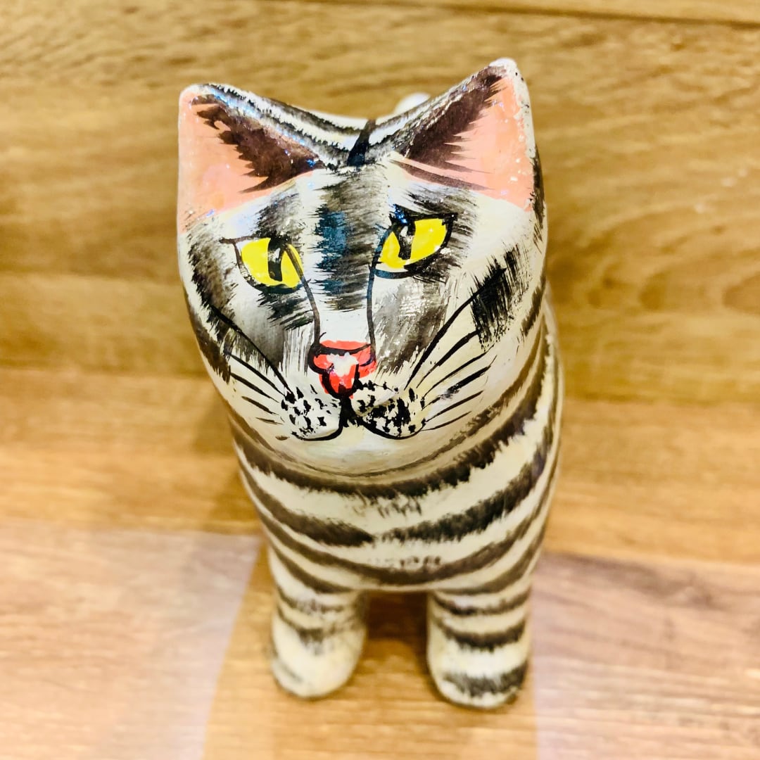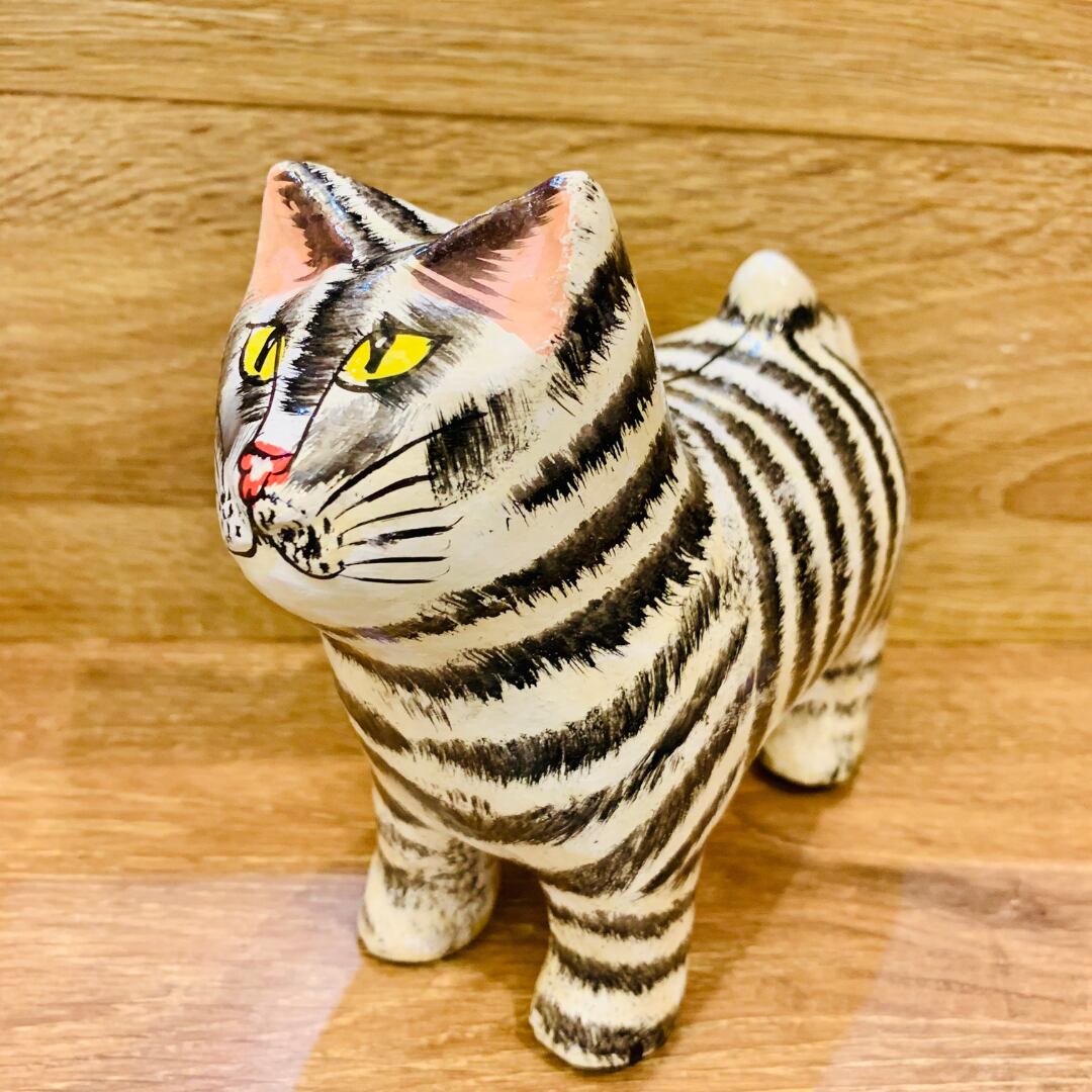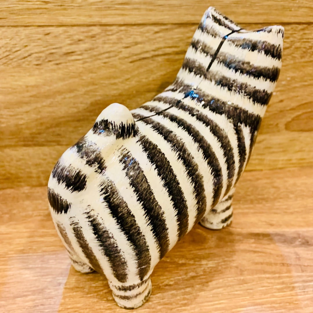 しましま模様のネコの置物です。デスク横に追いたり、ネコ好きの方へのギフトにも。