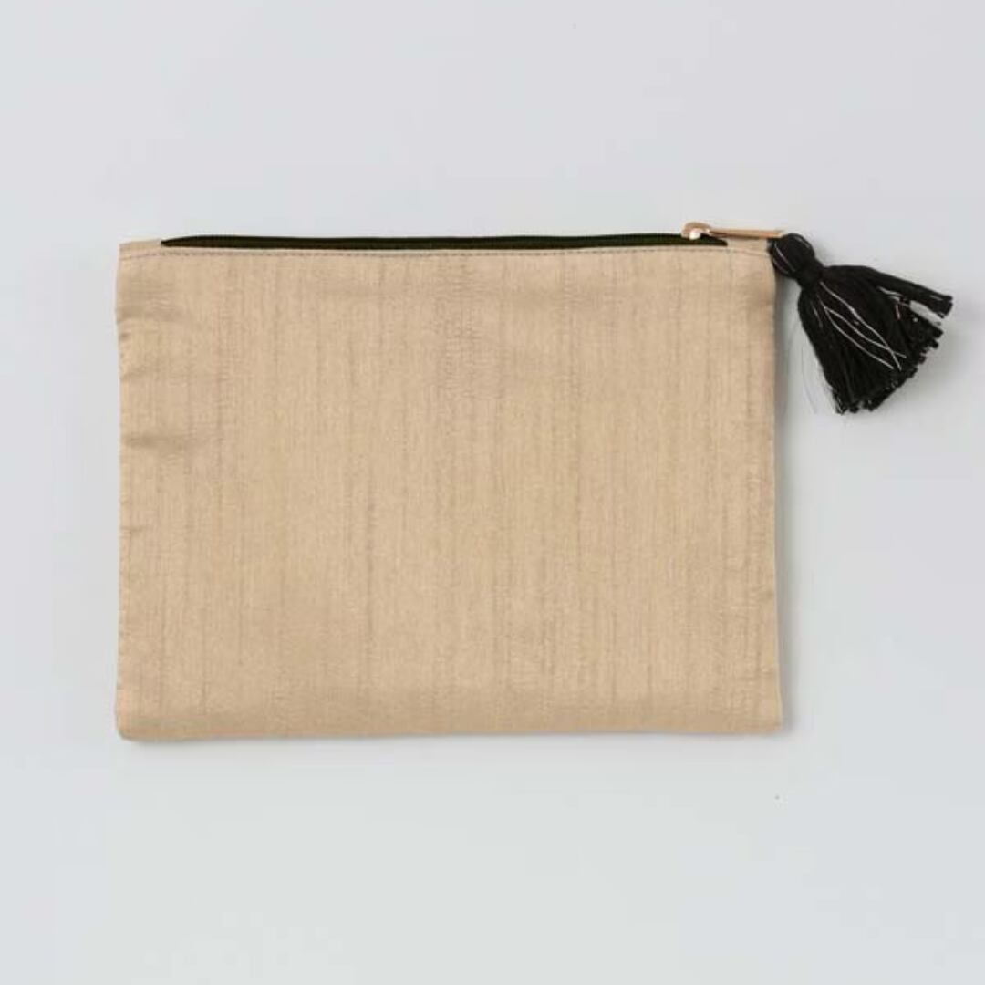 フラットタイプでかさばりにくく、 コスメやアクセサリー、バッグの中の小物整理にぴったり。 ファスナーにはタッセル付きで、 さりげないアクセントに。