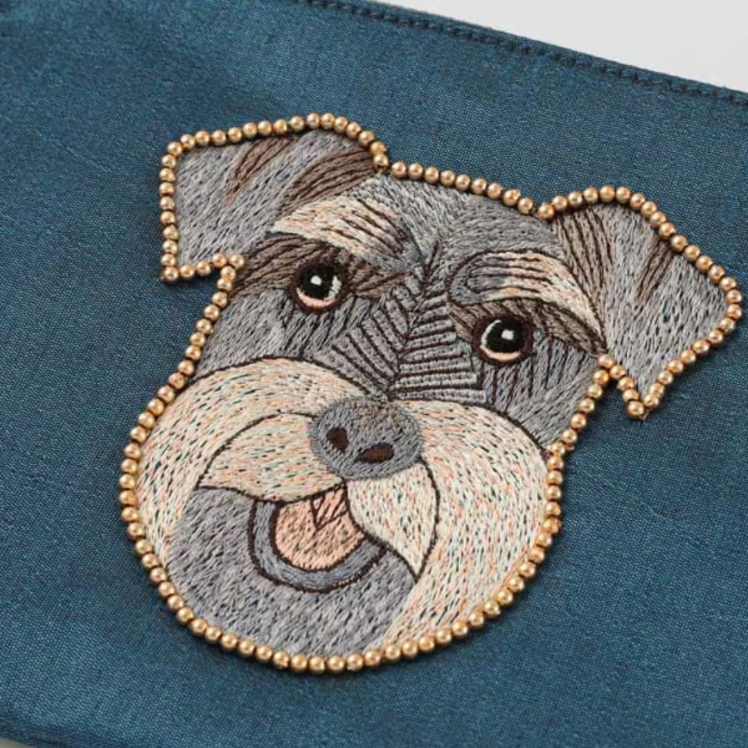光沢のあるポリエステル生地に犬のモチーフが刺繍されたポーチです。